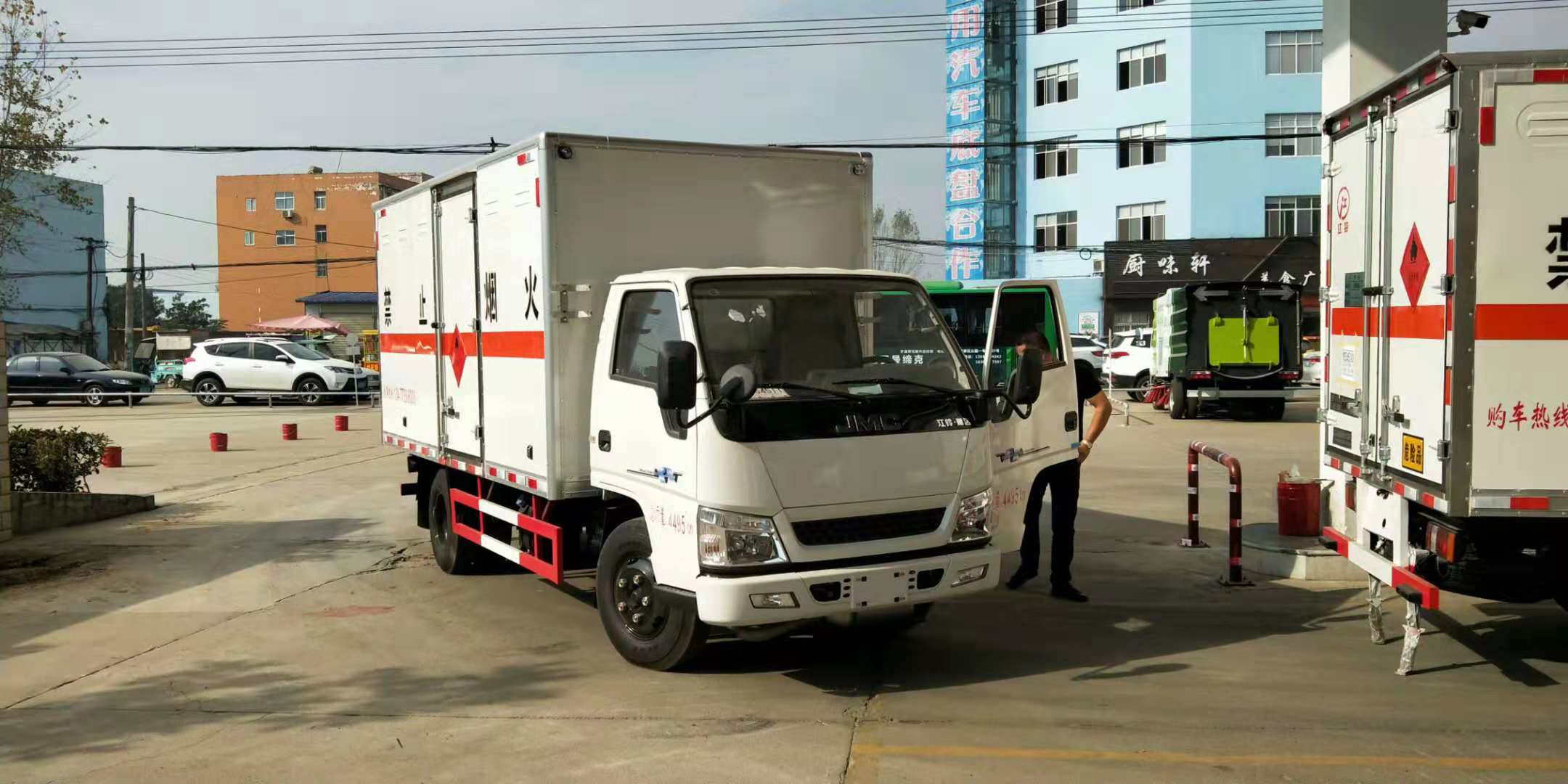 大連劉總在網(wǎng)上找到我司銷售部陳經(jīng)理,告知其欲購三臺易燃液體廂式車。陳經(jīng)理為其推薦了江鈴易燃液體廂式車。該車底盤采用江西江鈴公司生產(chǎn)的江鈴原裝底盤進行改裝,3360mm軸距、JX493ZLQ4江西五十鈴發(fā)動機(108馬力)、7.0鋼絲輪胎、助力、油剎、148車架、1.5噸前橋/3.3噸級后橋、12伏單電瓶、前置排氣管、新款可前翻轉(zhuǎn)駕駛室、前盤制動/限速裝置/ABS/行車紀(jì)錄儀均為原廠裝配不為廠外加裝,其它均按江鈴公司出廠標(biāo)準(zhǔn)提供;貨廂尺寸為4200X1850X1730(mm)、廂體外飾冷板、內(nèi)飾鋁板、中間為防阻燃泡沫、廂內(nèi)安裝臥環(huán)、煙霧報警器、防盜報警器、右邊開側(cè)門、后雙開門、帶拖地靜電帶,其它均按廠標(biāo)組織生產(chǎn);