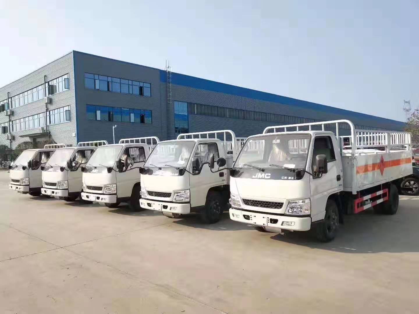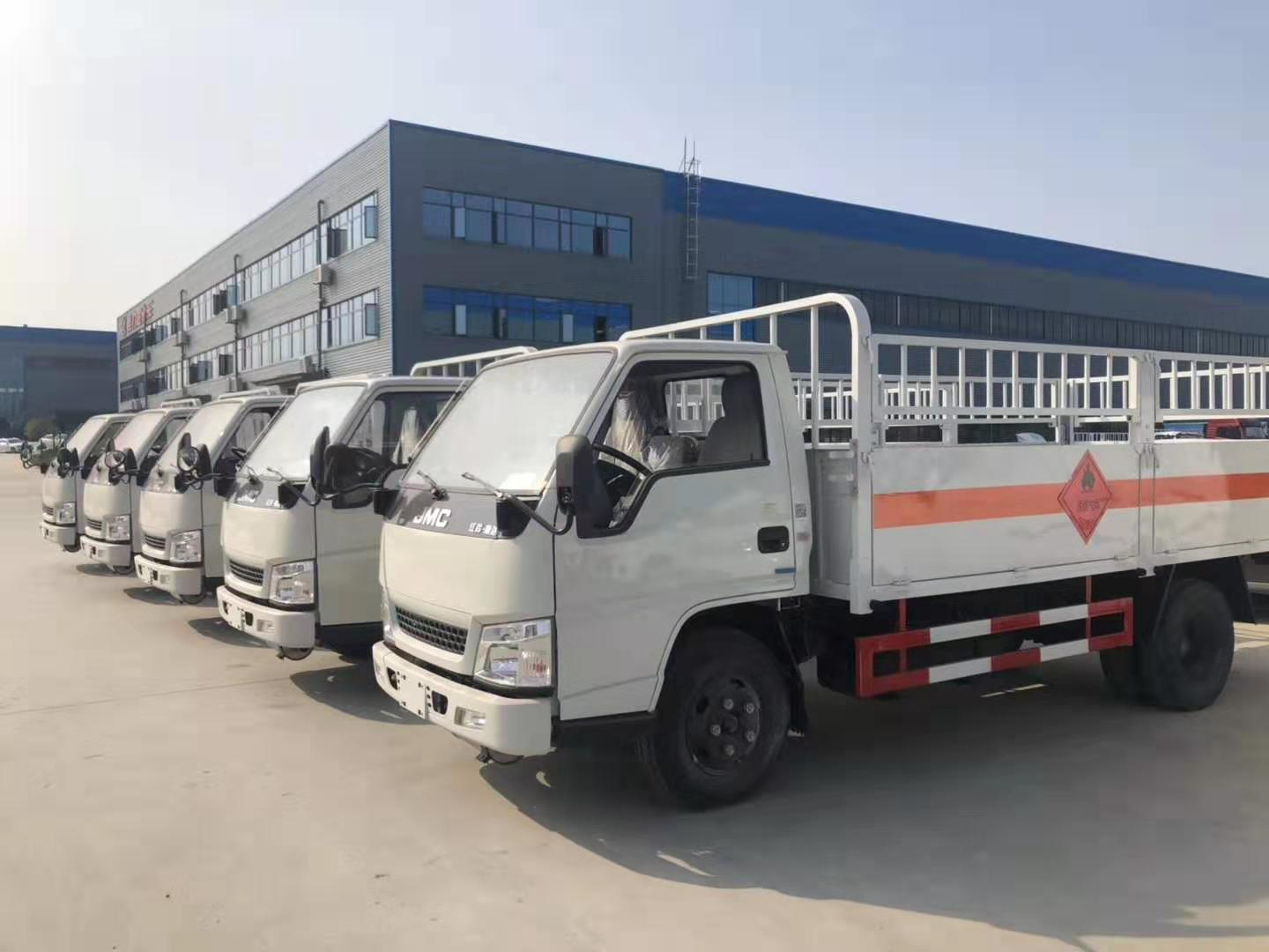 山東徐總因業務需求在我司批量訂購了五臺江鈴4.1米氣瓶運輸車,該車采用江鈴原廠危險品車底盤,3360mm軸距、JX493ZLQ4江西五十鈴發動機(108馬力)、7.0鋼絲輪胎、助力、油剎、148車架、1.5噸前橋/3.3噸級后橋、12伏單電瓶、前置排氣管、貨廂尺寸為4200X1850X1730(mm),邊板對折四開門、外板采用1.2MM厚冷軋板,內襯為矩形管骨架牢靠穩定,底板為3mm厚花紋板,有靜電帶、滅火器、防火罩。整車國標反光標示及警告標志;目前車輛已做好,以下是具體實拍圖片: