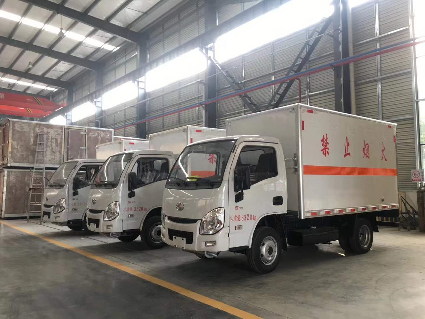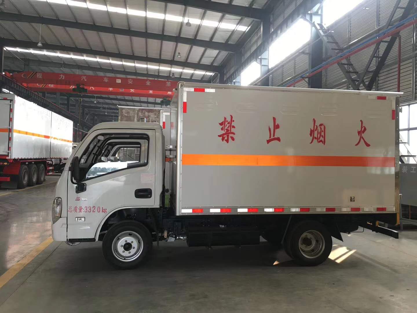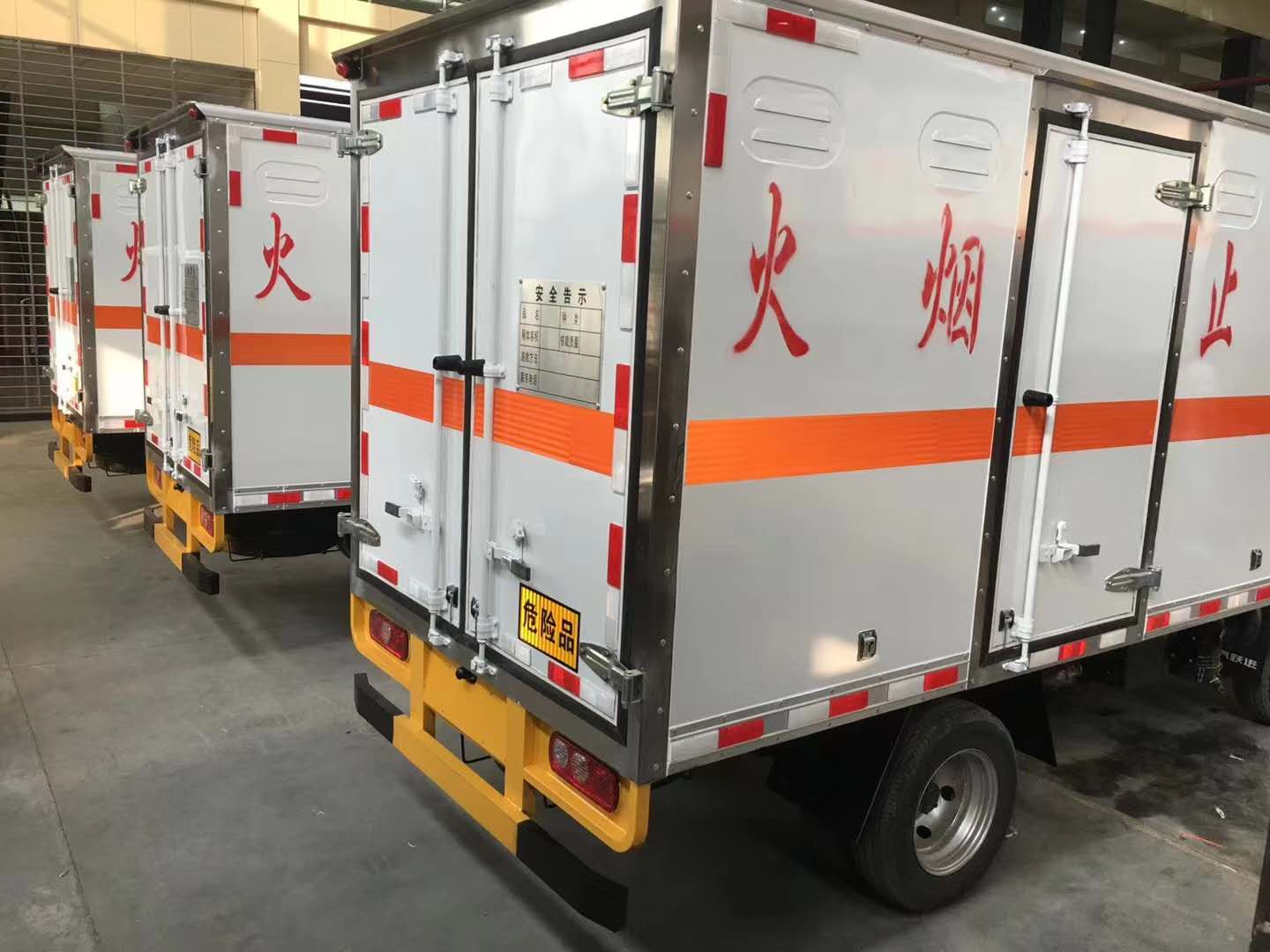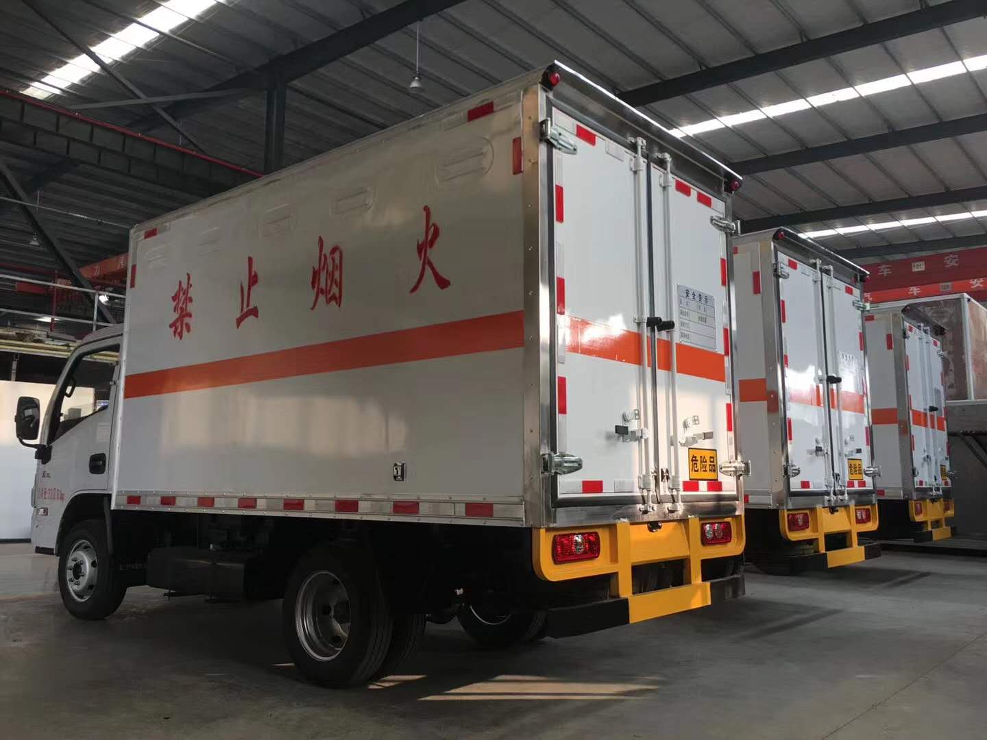 上裝配置:廂體材質(zhì)為外飾冷軋鋼板、內(nèi)飾鋁合金板、中間填充隔熱阻燃材料,選裝側(cè)門和隔倉(cāng),廂體兩側(cè)上方設(shè)有防雨功能自然通風(fēng)窗口,底部鋪有阻燃導(dǎo)靜電膠板,廂體側(cè)面裝有固定拉環(huán),與捆綁帶使用捆綁貨物以避免移動(dòng)。在車廂內(nèi)頂部安裝感煙報(bào)警器,在門器框上方安裝有防盜報(bào)警器,廂體外側(cè)安裝示廓燈及滅火器支架,配置兩個(gè)滅火器,并有“嚴(yán)禁煙火”和“爆”等字樣,廂體周邊貼反光標(biāo)識(shí)。后門貼有安全告示,危險(xiǎn)品標(biāo)牌。車輛尾部副梁安裝兩條拖地導(dǎo)靜電帶,駕駛室頂部裝有安全三角燈。廂體顏色可定制:黃、白、灰色等。