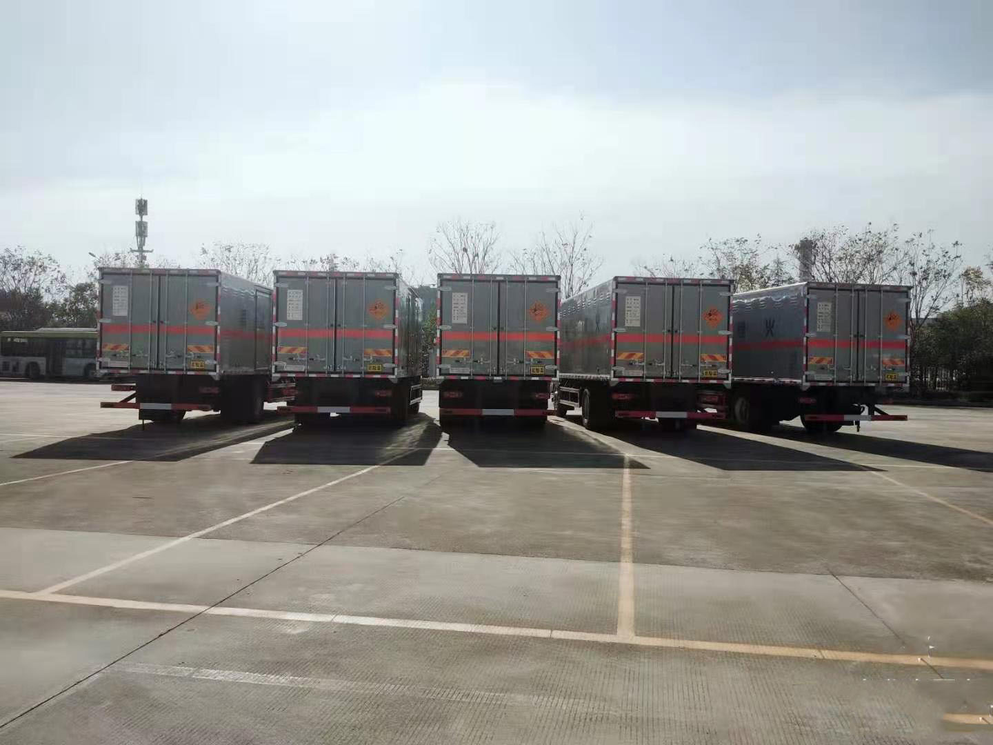 東風天錦危險品車廂體材質為復合型防爆板:外板1.2mm冷軋鋼板,內板為靜電良好的1mm厚鋁板,中間為30×40mm金屬方管,填充材料為40mm厚B2級隔熱防阻燃擠塑板。廂體兩側板上部開防雨型通風孔,便于空氣流通。廂體底板為3mm厚花紋板外鋪10mm厚靜電膠皮,前廂板下部處鋪10mm厚靜電膠皮,以防止車廂內產生靜電火花,兩側板安裝內嵌式臥環,便于固定車廂內的貨物。頂板中間處設置煙霧器,側門和尾門鎖緊處設置防盜器,并于駕駛室內部蜂鳴器連接,便于駕駛人員及時發現并險情。廂體頂部封閉不可開啟。廂體右(副駕)側開側門,廂體尾部雙開門。車廂顏色為/白色,安裝整車示廓燈,車廂外前廂板兩側設兩個滅火器支架(隨車贈送4Kg滅火器兩個),車廂尾部副梁處設置兩根可收放式銅芯靜電帶,使車輛與大地等電位連接,車身國標反光標,左右及尾部三塊菱形危險品標識,尾部粘貼危險品告示,兩張危險品警示牌,車頂一個三角形危險品頂燈。