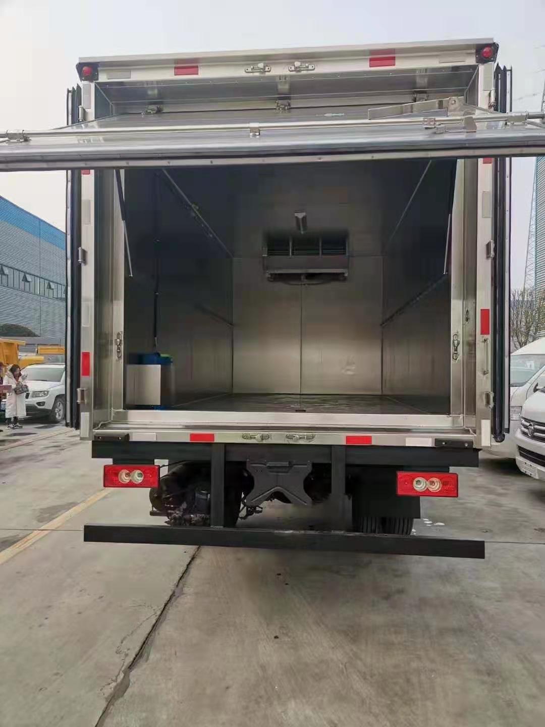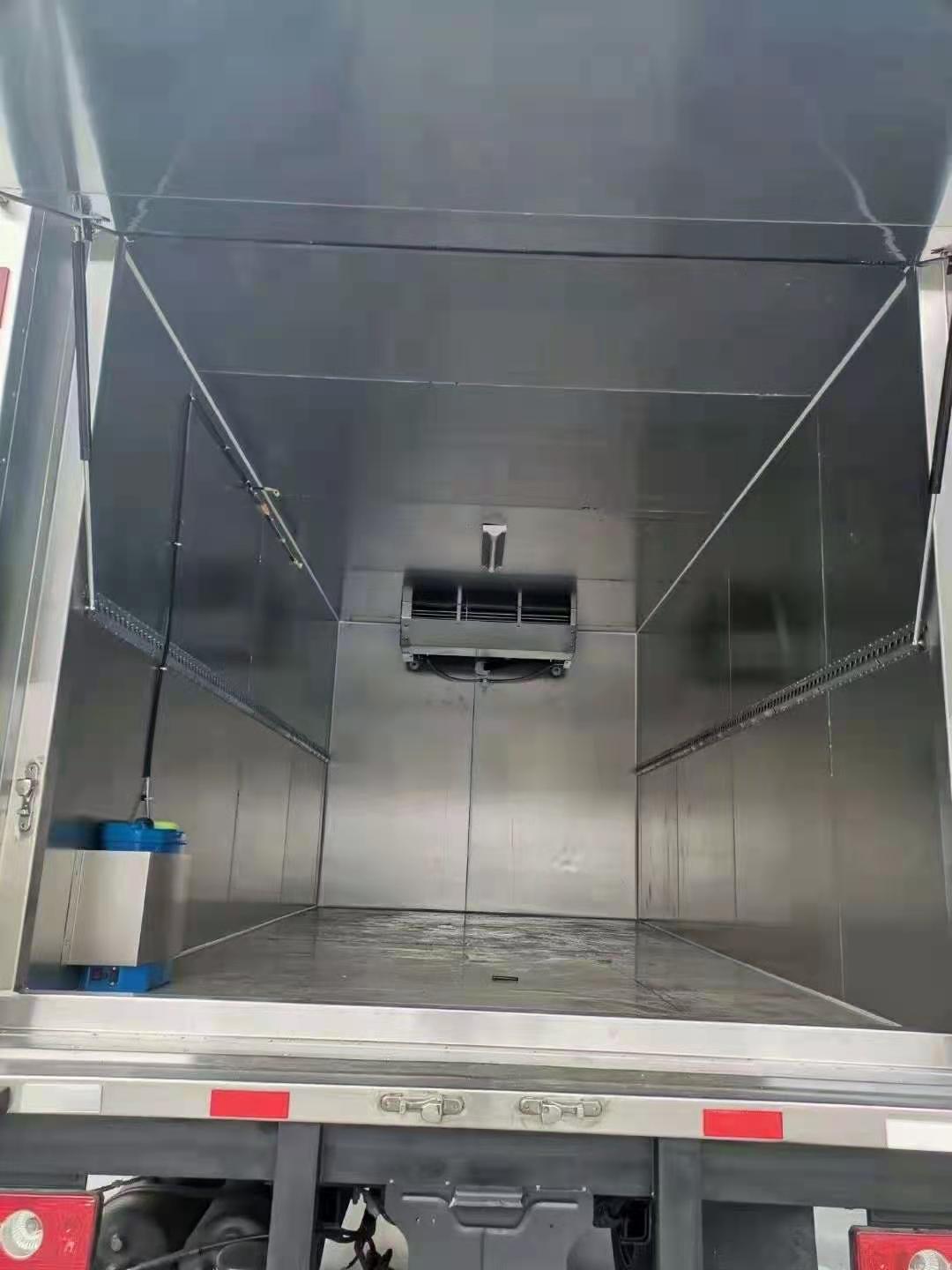 3.廂體內(nèi)部安裝自動(dòng)噴霧裝置,可進(jìn)行自動(dòng)噴霧消毒,殺菌。配備不銹鋼污水處理箱,4.采用國(guó)產(chǎn)-5度制冷機(jī)組(安裝在箱體前上部),后雙開門,外玻璃鋼,廂內(nèi)6個(gè)面均不銹鋼板,中間8cm厚保溫層,加裝隔貨條,污水處理箱,后部帶密封門一個(gè),鋁合金型材包邊,不銹鋼門框及鎖件。 箱體里面配自動(dòng)噴霧消毒、紫外線殺菌消毒。