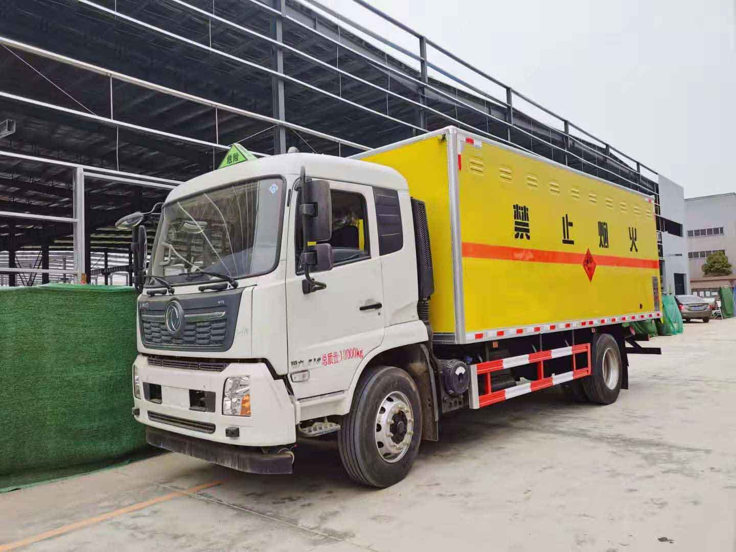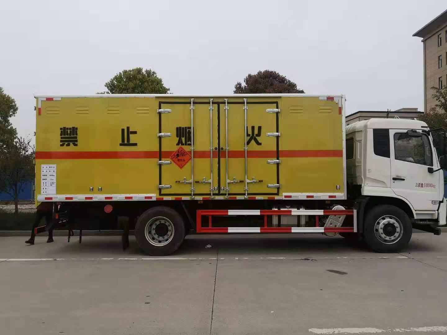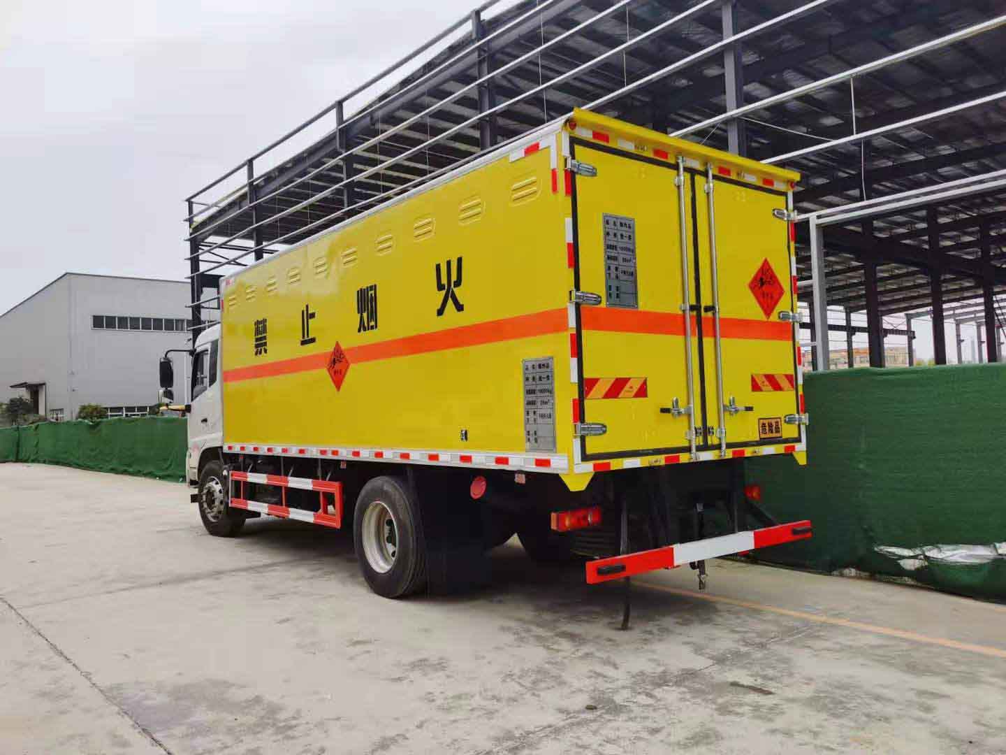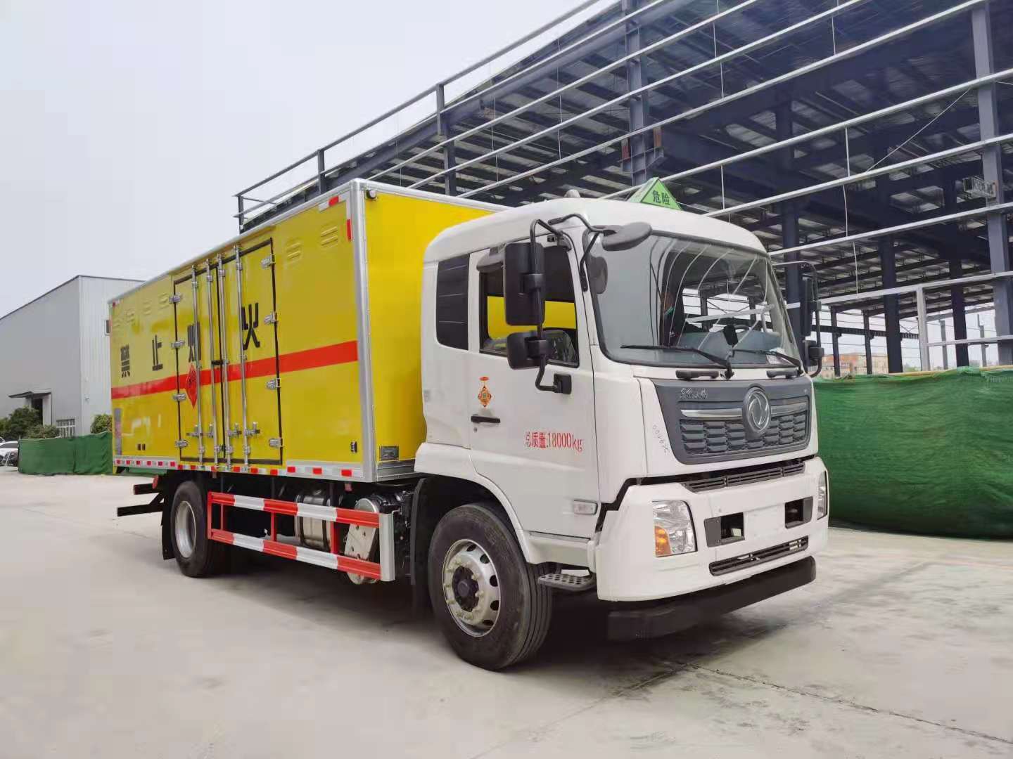 東風(fēng)天錦一類危險(xiǎn)品車采用東風(fēng)天錦危險(xiǎn)品車底盤,白色車頭,灰色車廂,帶中開側(cè)門,駕駛室?guī)У管囉跋瘢{駛室內(nèi)安裝監(jiān)視器。東風(fēng)天錦4*2底盤,危險(xiǎn)品專用底盤,D530排半標(biāo)準(zhǔn)頂,空調(diào),康明斯B6.2NS6B210發(fā)動機(jī),法士特8JS85E-C變速箱,軸距4700mm,4.5T/9T前后橋,板簧前3片后氣囊3/-,鋁160L油箱,速比4.88,275/80R22.5真空胎, 前盤式剎車,限速,ABS,EBS,FCWS/LDWS(前撞/車道偏離預(yù)警),TPMS(前軸單臺胎壓監(jiān)測) 后雙開門,貨廂前、后各兩個(gè)示廓燈、貨廂內(nèi)安裝離子感煙火災(zāi)探測器、側(cè)廂及前廂內(nèi)安裝固定臥環(huán)、地板裝置防靜電膠皮、側(cè)廂開通風(fēng)口、安裝滅火器、安裝排氣火花熄滅器、車尾部安裝導(dǎo)靜電橡膠拖地帶、駕駛室安裝危險(xiǎn)標(biāo)志燈、門上安裝防盜報(bào)警器、車身側(cè)面及后部粘貼橙色反光標(biāo)識、菱形標(biāo)示、車體后部設(shè)置安全告示、后保險(xiǎn)杠安裝緩沖加強(qiáng)橡膠塊。