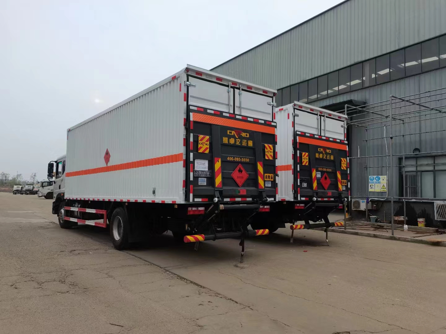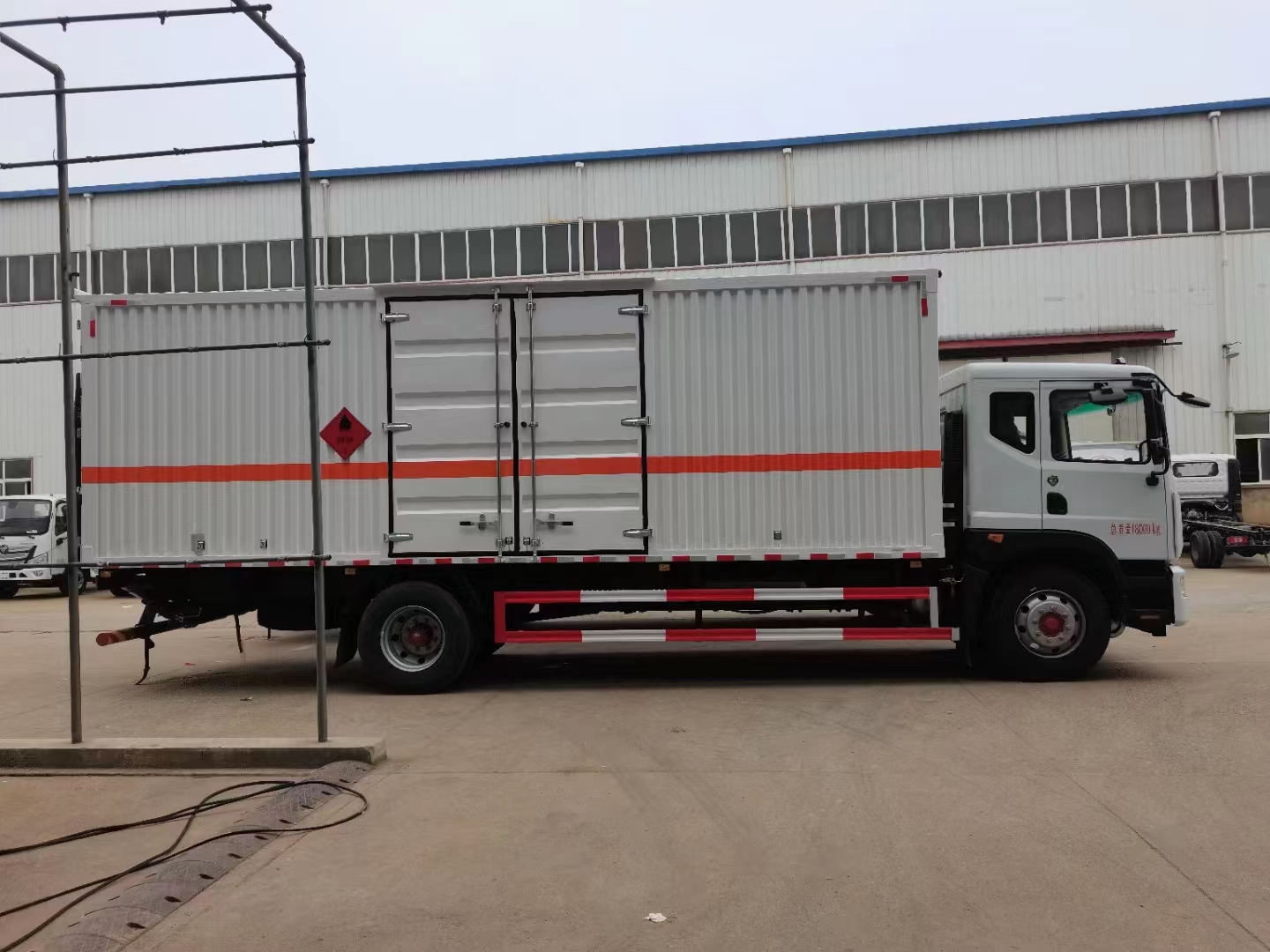 東風D9國六瓦楞板危險品車采用的是專用危化品底盤,可選康明斯220馬力或康明斯230馬力發動機,該車匹配的是4.5噸前橋,9噸后橋(與天錦系列車型一致噸位,但是論價格東風D9國六危險品車更有優勢)。該車選用的是5300mm軸距,貨箱尺寸可選6米8或7米6車型,尾部可選1.5噸或2噸尾板,箱體全部采用的是標準的碳鋼冷軋板折彎而成,箱體右側帶側門,方便側部上下卸貨。選擇該款車型的客戶主要注重的是性價比。該車車輛滿足的是10噸的額載,
