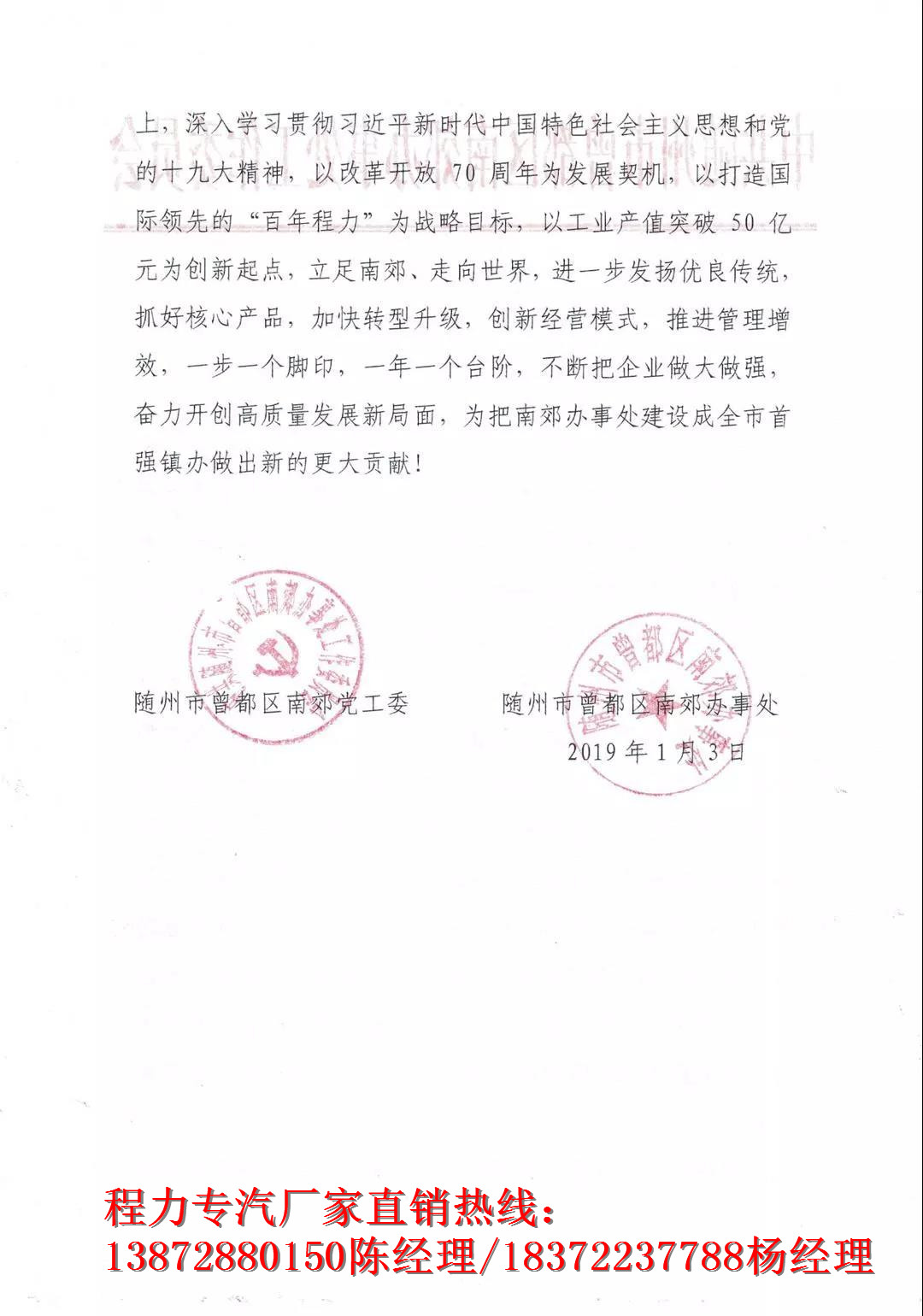 近日,程力專汽集團收到了一封特殊的賀信,來自曾都區南郊黨工委南郊辦事處。這不是一張簡單的賀信,這是一份擔當和責任,更是一種智慧和實力的展現。程力人從2015不到20億元,到2017年突破36億元,程力用2年時間基本實現產值翻番,而過去的2018年,程力人在新經濟、新常態下,實現逆勢穩步增長華麗轉身,提前2年完成了“十三五”制定的目標,確實可圈可點,值得思索點贊;同時,這也是一份期待已久驚喜和祝福,更是一份鞭策與鼓勵。