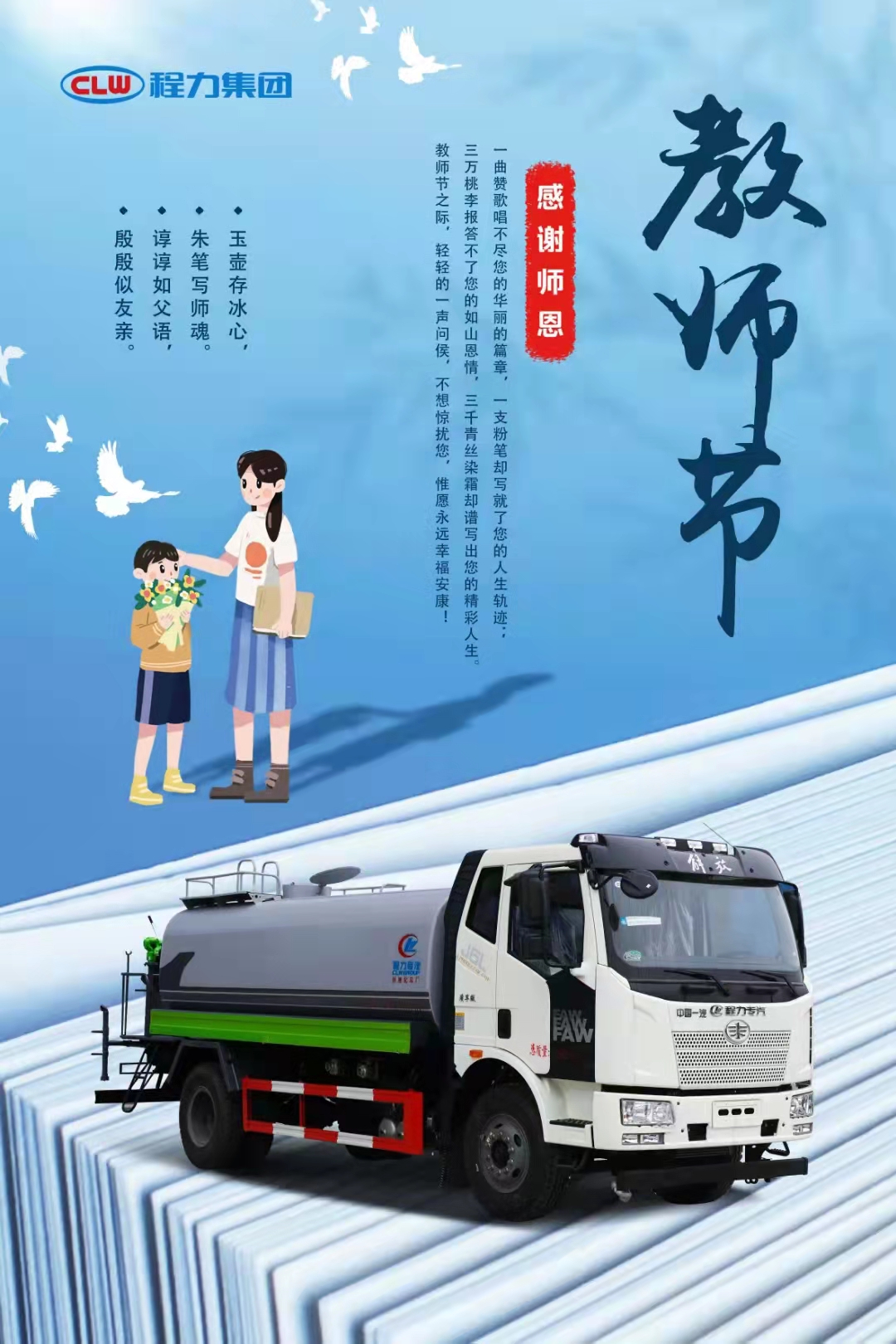三尺講臺,三寸舌,三寸筆,三千桃李;十年樹木,十載風,十載雨,十萬棟梁。“教師”二字后面不僅有幸福和光榮,更有艱辛和付出,教師節(jié)快樂。師恩萬千重,銀絲染秋風。今朝專汽人,躬耕求索中。程力集團向奮斗在教育戰(zhàn)線的辛勤園丁,在教師節(jié)之際,致以崇高的敬意!