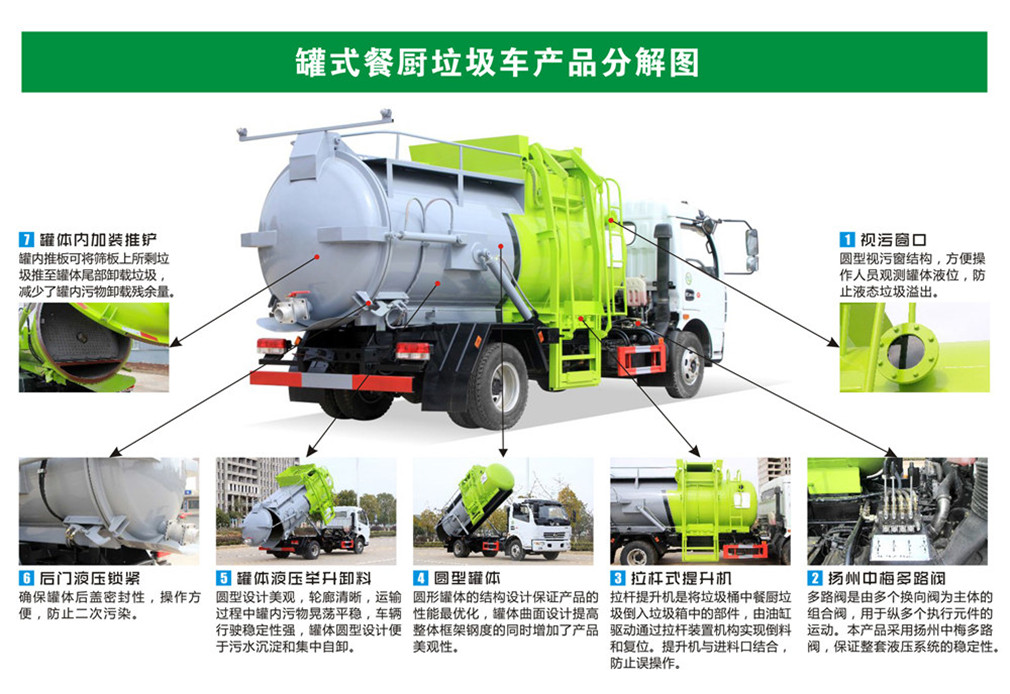 餐廚垃圾車,又稱餐余垃圾車余廚垃圾車或者泔水車,餐廚垃圾車是垃圾車中的一種,是用于收集和運輸生活垃圾、食品垃圾(泔水)及城市淤泥的專用車輛。餐廚垃圾車不僅優(yōu)化了居民居住的環(huán)境衛(wèi)生,減少了空氣中的餐廚垃圾臭味,減少孳生蟑螂、細菌的可能, 改善了環(huán)衛(wèi)作業(yè)環(huán)境,減少垃圾的四處分散造成的污染。