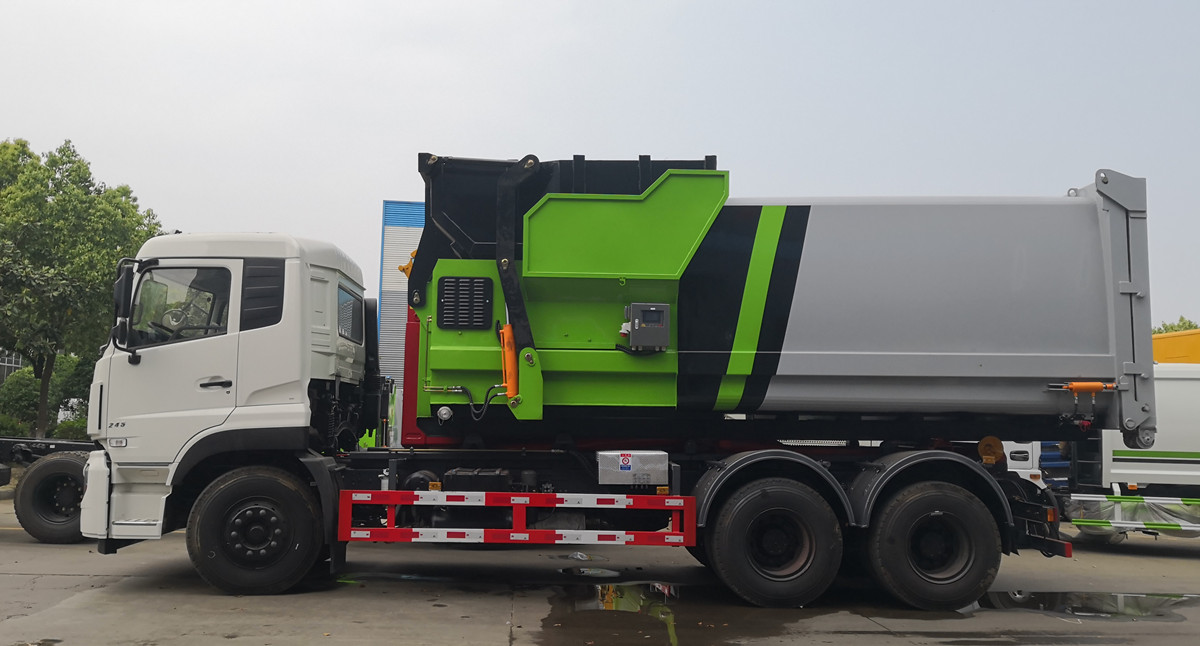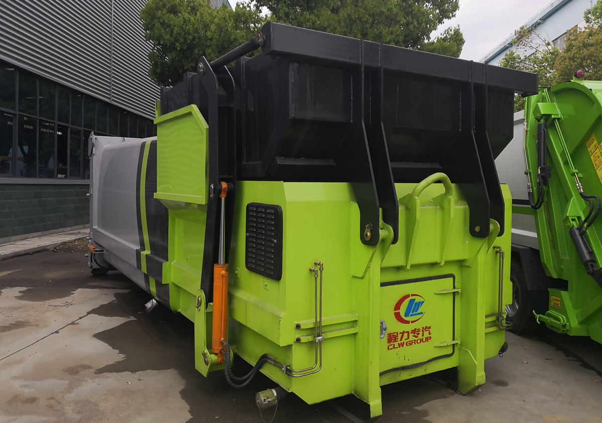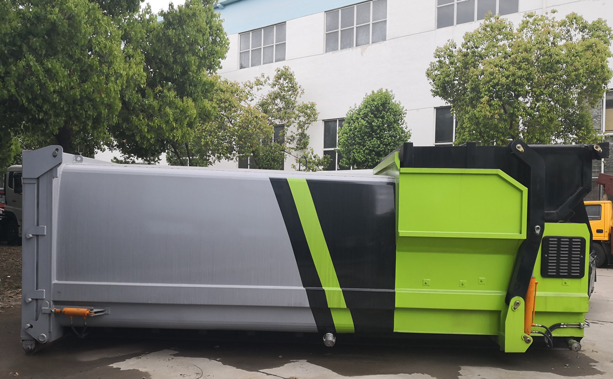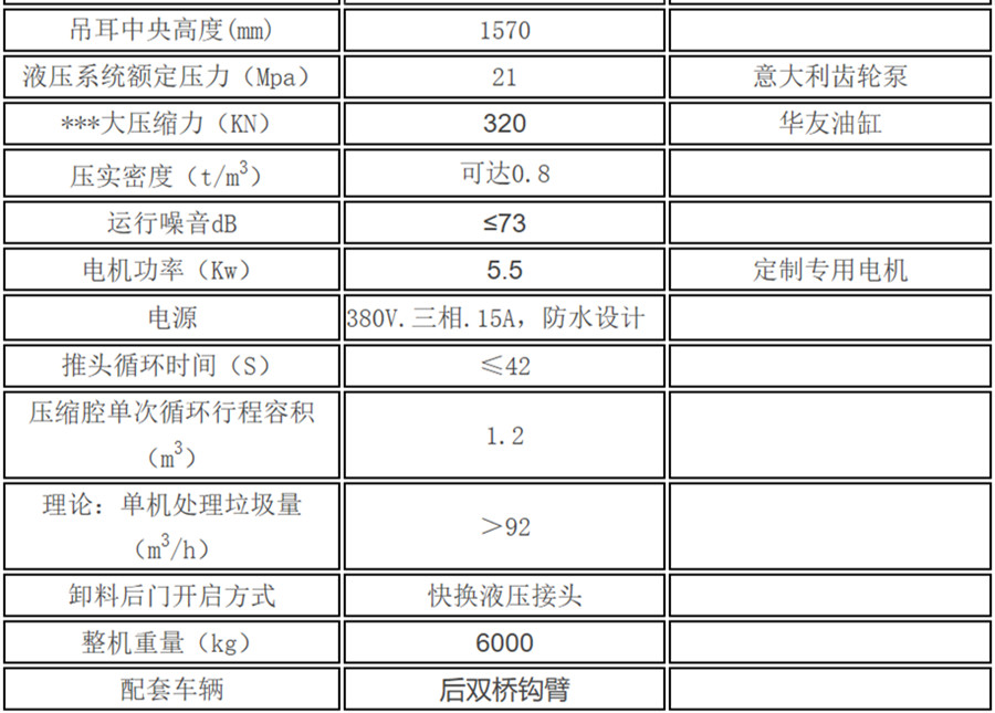 移動式壓縮垃圾箱參數:廂體有效容積18立方,外接380V三相四線交流電源,車廂尾部采用液壓快速接頭,通過底盤部分提供系統壓力以帶動車輛尾門的關合。