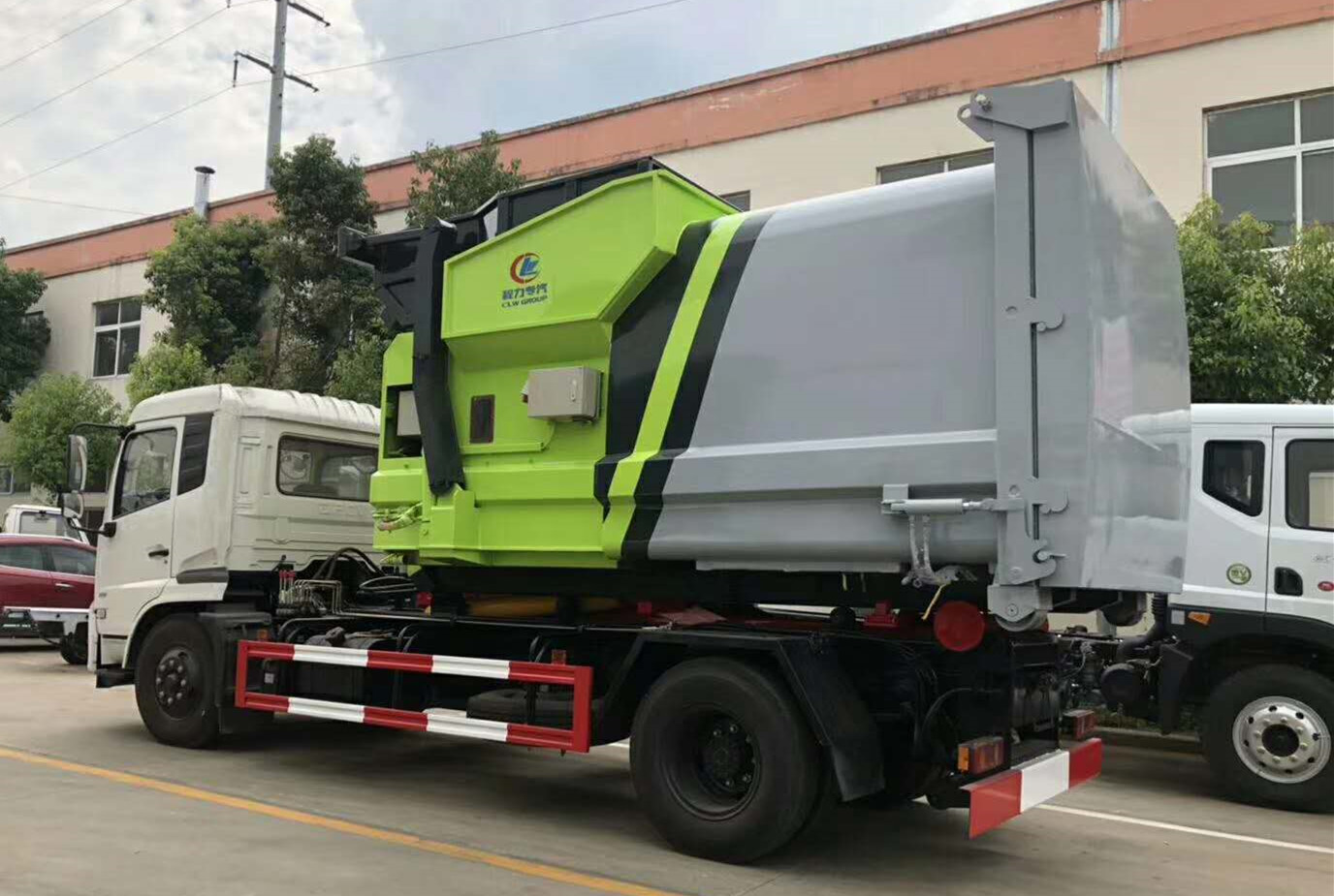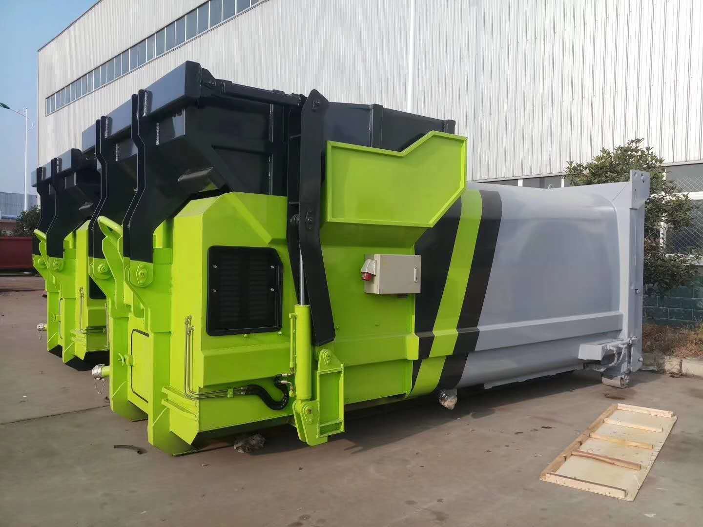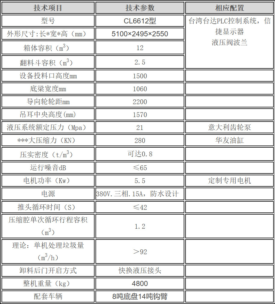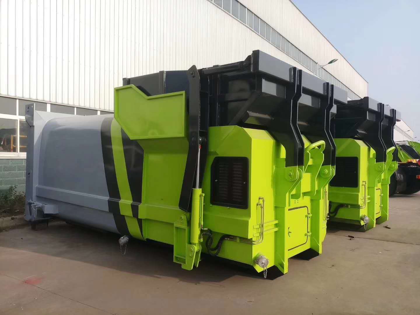 移動式壓縮垃圾箱參數:廂體有效容積12立方,外接380V三相四線交流電源,車廂尾部采用液壓快速接頭,通過底盤部分提供系統壓力以帶動車輛尾門的關合。