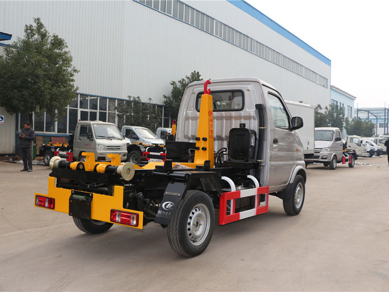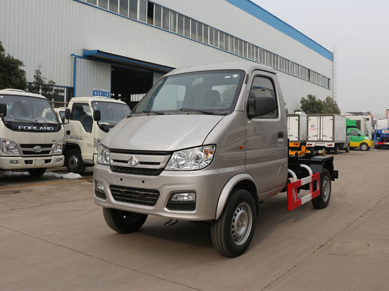 勾臂式垃圾車可將地下垃圾箱內的垃圾及垃圾箱一同拉至車上運走同時可自卸,且垃圾箱體采用液壓鎖緊或開啟,降 低了工人的勞動強度和改善了工作環境。該垃圾車的收運方式是目前世界上廣泛采用的垃圾收運方式,可以實現一車多箱,大大降低了配備成本和空間等等;其專用裝置的功能均以汽車發動機為動力,通過液壓機構手動或電控、氣控來實現。