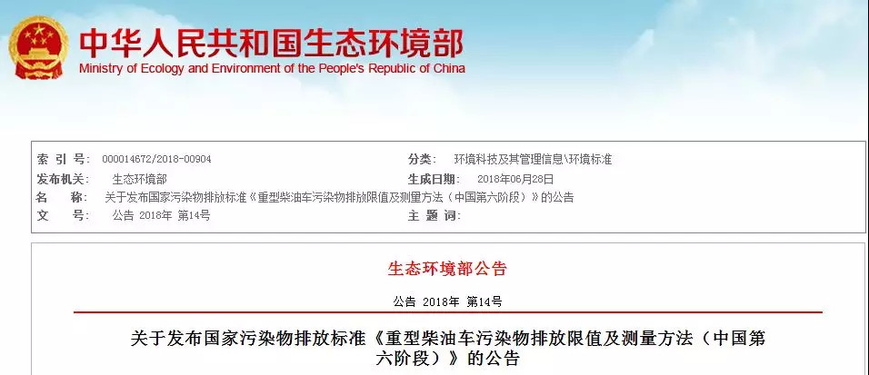 2018年7月3日,生態環境部在其官網上刊發“關于發布國家污染物排放標準《重型柴油車污染物排放限值及測量方法(中國第六階段)》的公告”(以下簡稱“公告”)。