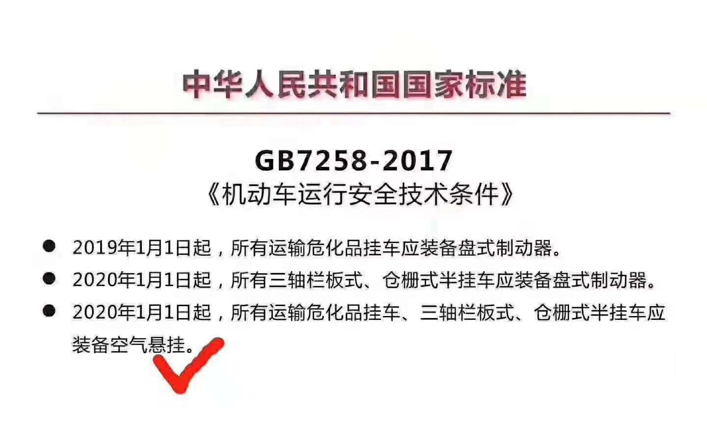 從2020年1月1日起,總質(zhì)量在12噸以上危險品車必須安裝空氣懸掛,東風(fēng)商用已停止接收危險品板簧底盤訂單,目前市場暫存少量此類底盤,加裝空氣懸掛單臺車輛成本至少增加三萬,政策實施后客戶購車成本會增加!需要購此類車型的客戶可提前進行預(yù)訂!再次提醒只為加深您的印象!在今年5月1日危險品車實行安全達標時我們一一通知客戶,但仍有部分客戶未引起重視,后來政策實施后購車成本增加,客戶覺得后悔!希望各客戶酌情考慮!
