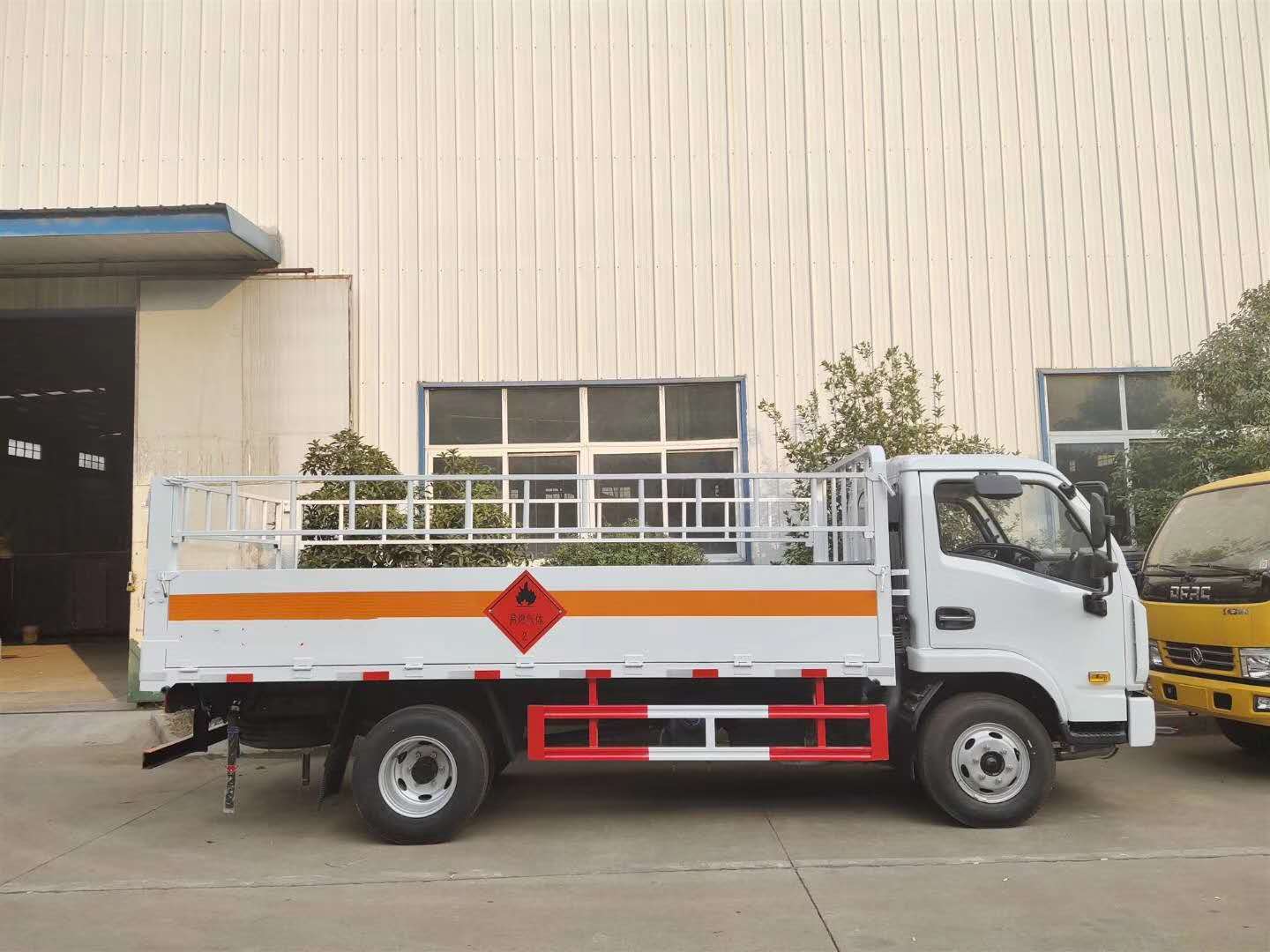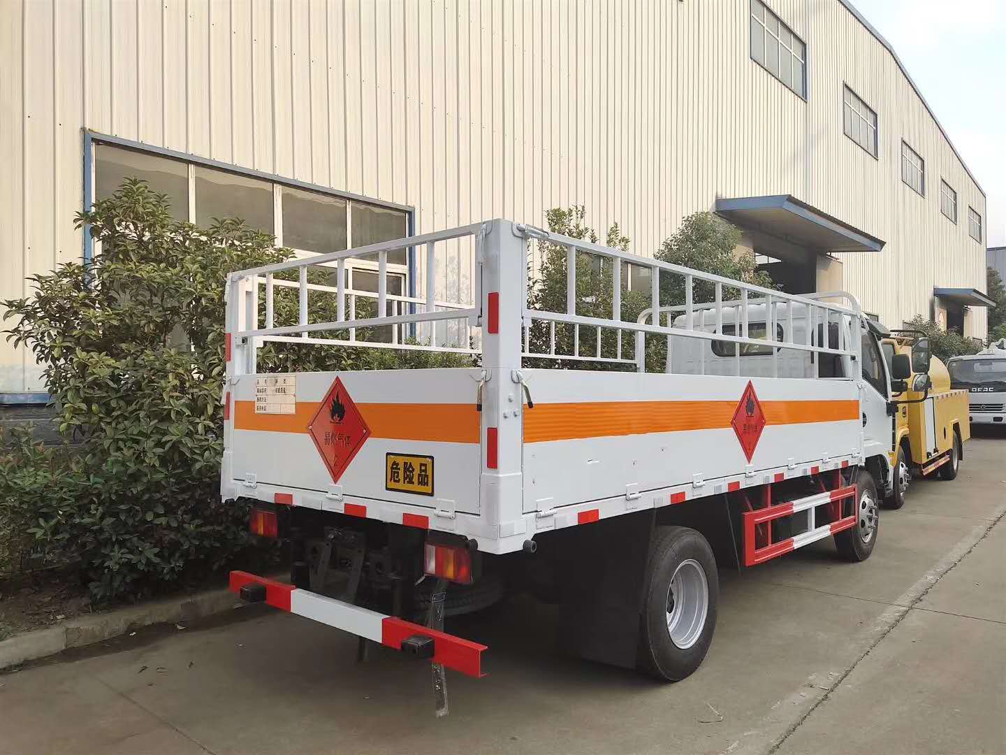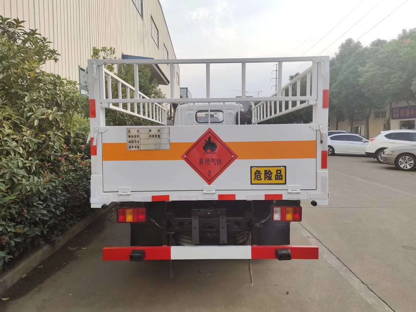 倉欄配置:整車尺寸:5995×2030×2250 ;廂體尺寸:4180×1900×550,嚴格按照公告尺寸制作,邊2底3材質,底板上鋪靜電膠皮,側板上帶可卸式高欄,配備滅火器,三角頂燈,靜電拖帶等,嚴格按照國家危險品法規進行“易燃氣體”標識粘貼等