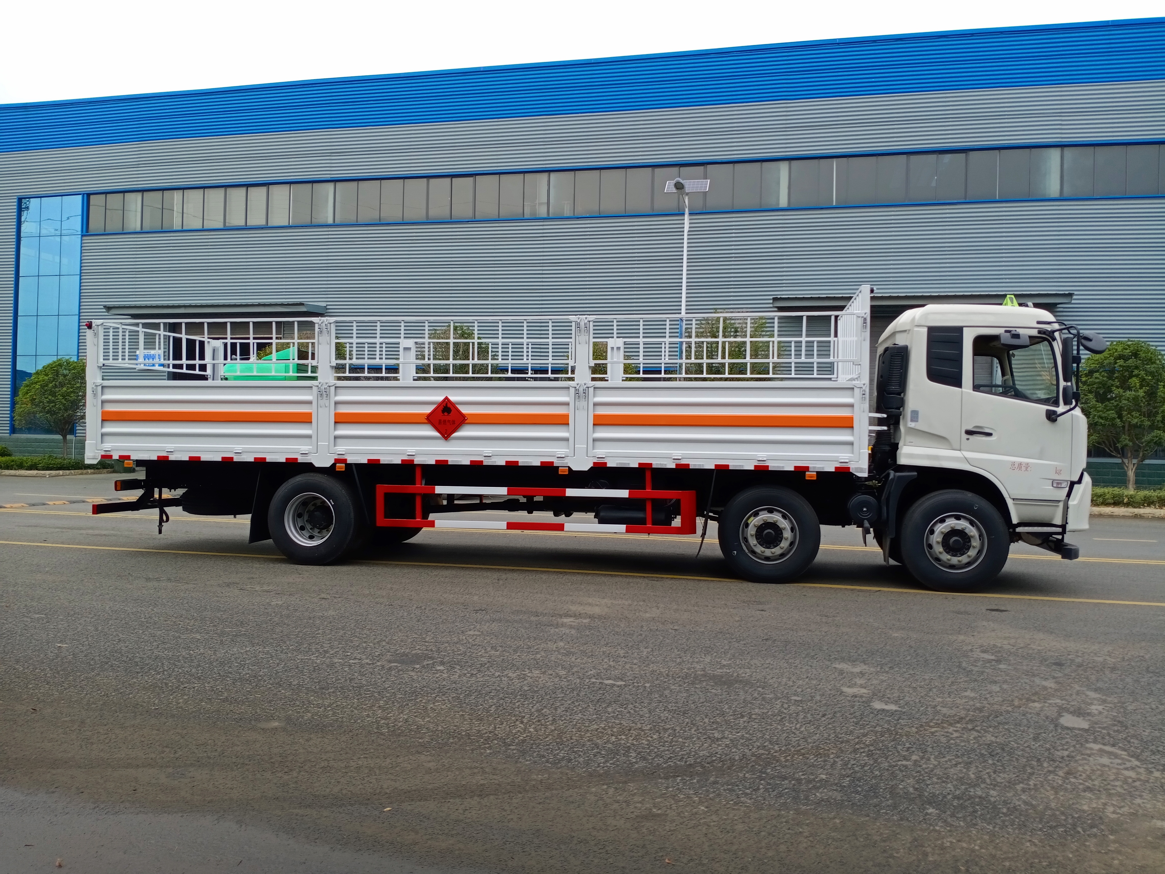 東風天錦小三軸氣瓶運輸車嚴格按照公告尺寸制作,邊2底4材質,底板上鋪靜電膠皮,側板平板內置臥環,側板上帶可卸式高欄,配備滅火器,三角頂燈,靜電拖帶等,嚴格按照國家危險品法規進行“易燃氣體”標識粘貼等。