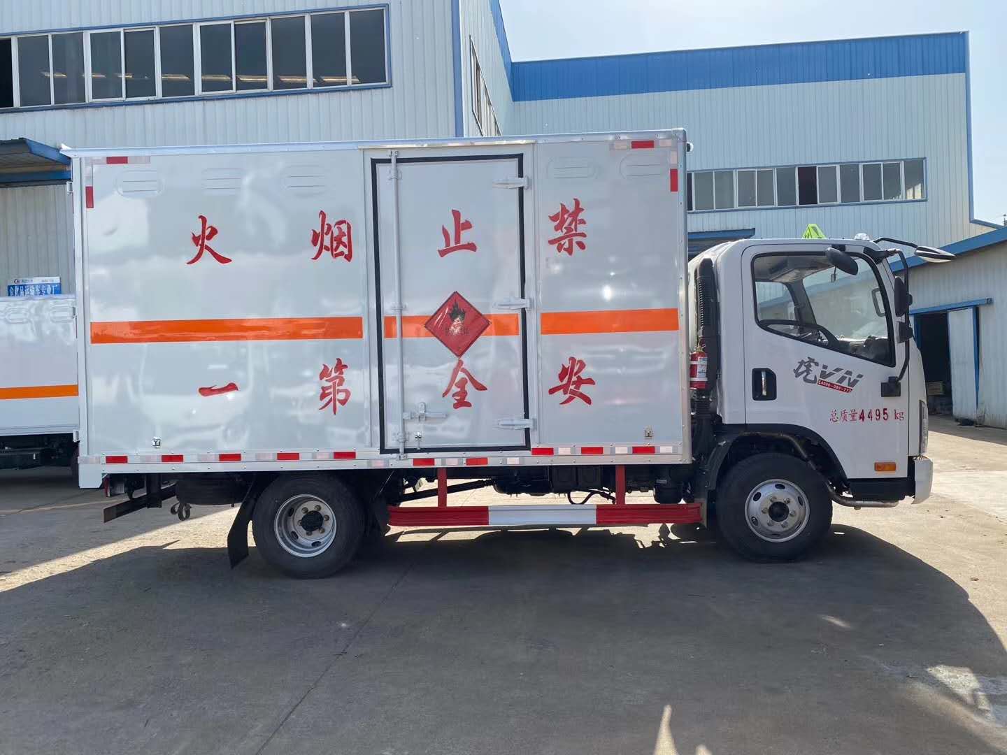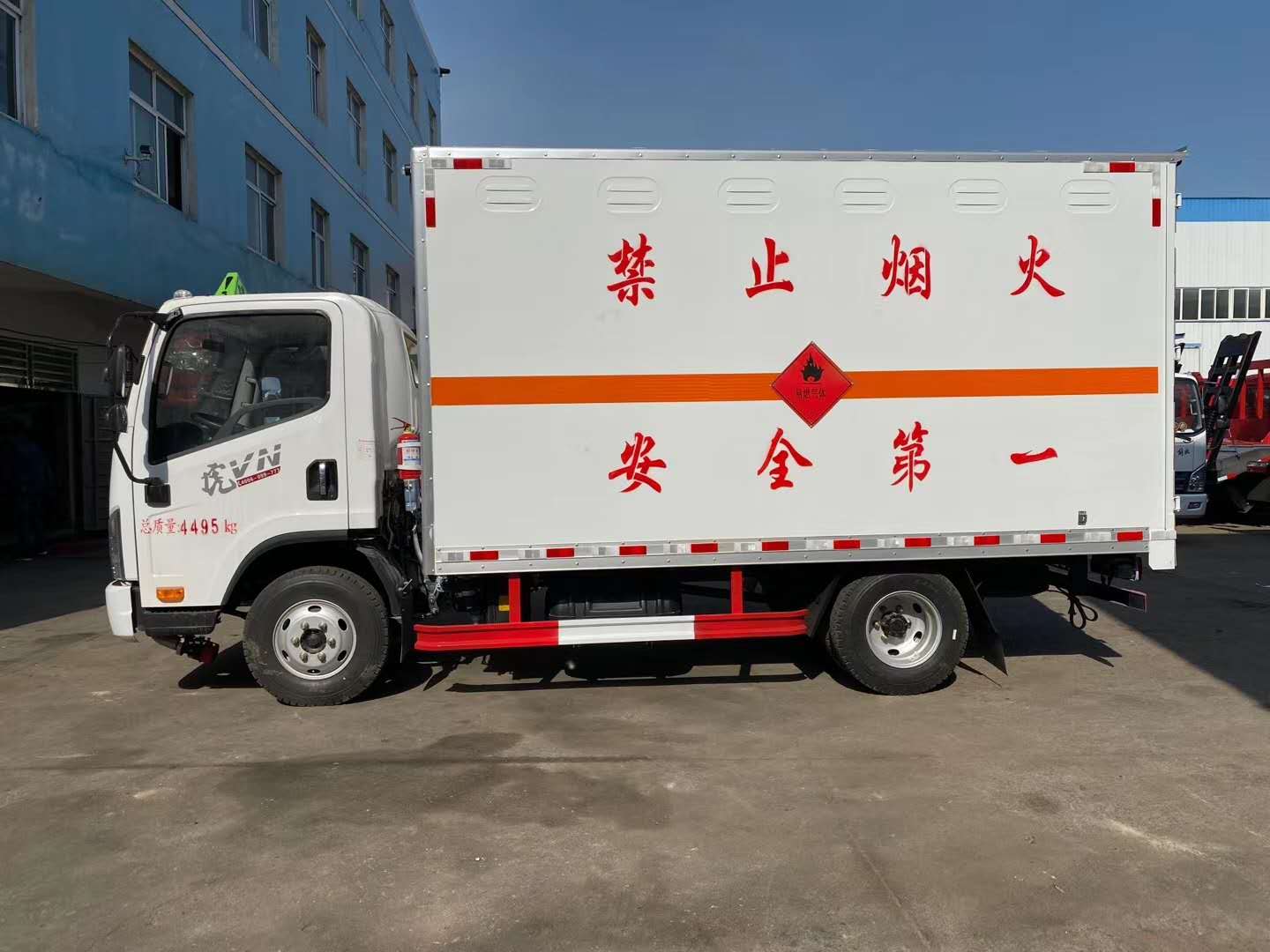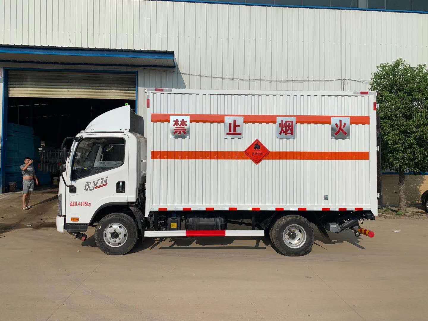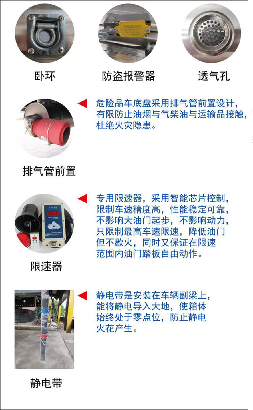 貨廂尺寸:4050mm×2000mm×1800mm,貨廂為復合型防靜電防阻燃材質而成,外飾冷軋鋼板內飾鋁合金板中間夾防阻燃材質擠塑板,廂體側板上部安裝防雨水通風孔,中部配有捆綁固定貨物的臥環,底板鋪防靜電膠板,廂體頂部安裝煙霧報警器,側門及尾門有防盜報警功能。駕駛室配備三角警示燈,整車反光標,廂體粘貼危險品標識,尾部粘貼危險品告示,隨車配備滅火器、反光背心、停車木。