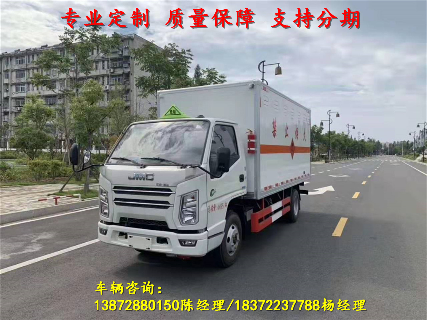 江鈴國六危貨車底盤配置:采用江鈴原廠新規危險品專用底盤(排氣管前置、前輪盤式制動、四輪帶ABS、電子限速器、安全帶報警、剎車片磨損報警、轉向輪防爆胎裝置),順達新款駕駛室可前翻,江鈴五十鈴發動機115馬力國六排放標準,五檔變速箱,7.00R16鋼絲胎。廂體尺寸:4150×1850×1730.上裝配置:廂體材質為外飾冷軋鋼板、內飾鋁合金板、中間填充隔熱阻燃材料,選裝側門和隔倉,廂體兩側上方設有防雨功能自然通風窗口,底部鋪有阻燃導靜電膠板,廂體側面裝有固定拉環,與捆綁帶使用捆綁貨物以避免移動。在車廂內頂部安裝感煙報警器,在門器框上方安裝有防盜報警器,廂體外側安裝示廓燈及滅火器支架,配置兩個滅火器,并有“嚴禁煙火”和“爆”等字樣,廂體周邊貼反光標識。后門貼有安全告示,危險品標牌。車輛尾部副梁安裝兩條拖地導靜電帶,駕駛室頂部裝有安全三角燈。廂體顏色可定制:黃、白、灰色等。