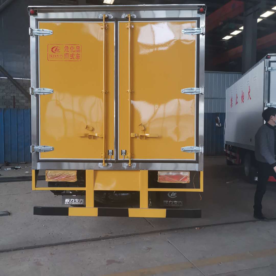 東風多利卡4.2米黃牌危險品車 采用東風危險品車底盤, 外形尺寸:5995×2150×2800(mm),廂體內尺寸:4120×2000×1780(mm),朝柴102馬力國五柴油發動機,3308mm軸距,7.00R16輪胎,帶方向助力、帶空調、帶前盤制動、排氣管前置、限速器、大燈調節裝置、符合2020年新法規政策。貨廂采用雙層金屬骨架,外冷軋鋼板,內鋁板,中間夾有國標防阻燃材料,廂體底部花紋板鋪防靜電膠皮,廂體內配煙霧報警器、車廂門配備防盜報警器,帶防火帽,滅火器,危險品標識(八類腐蝕品國標標識),整車帶有反光貼。整車顏色:黃色,隨車帶合格證,隨車工具,上戶發票,整車不超重。