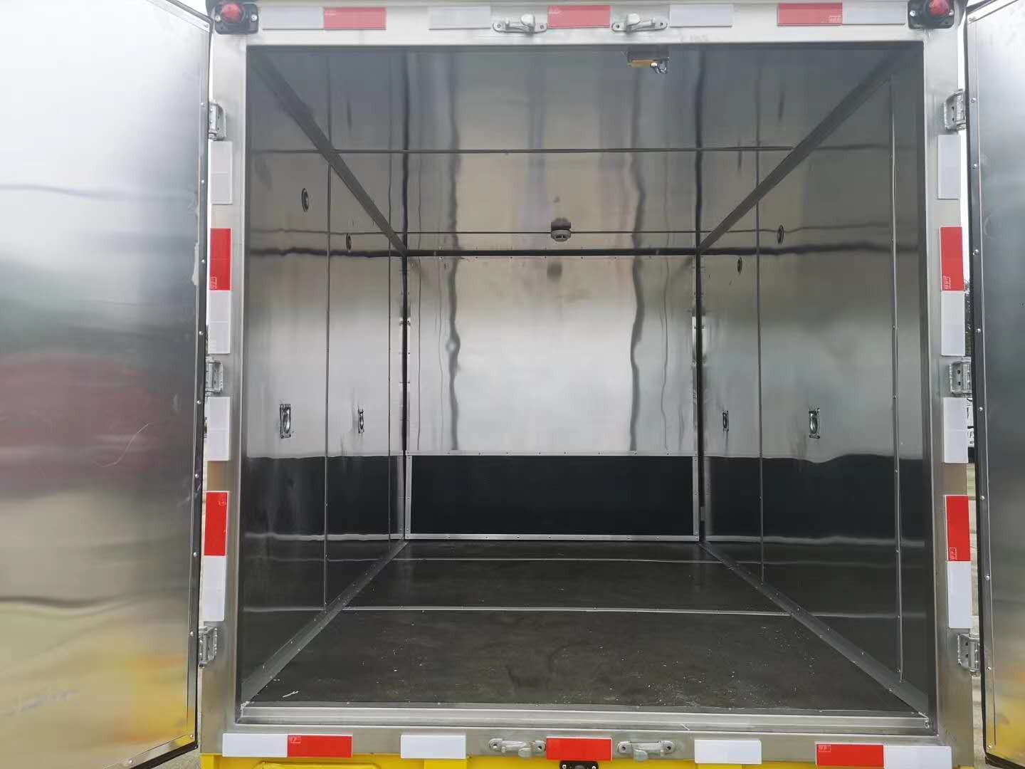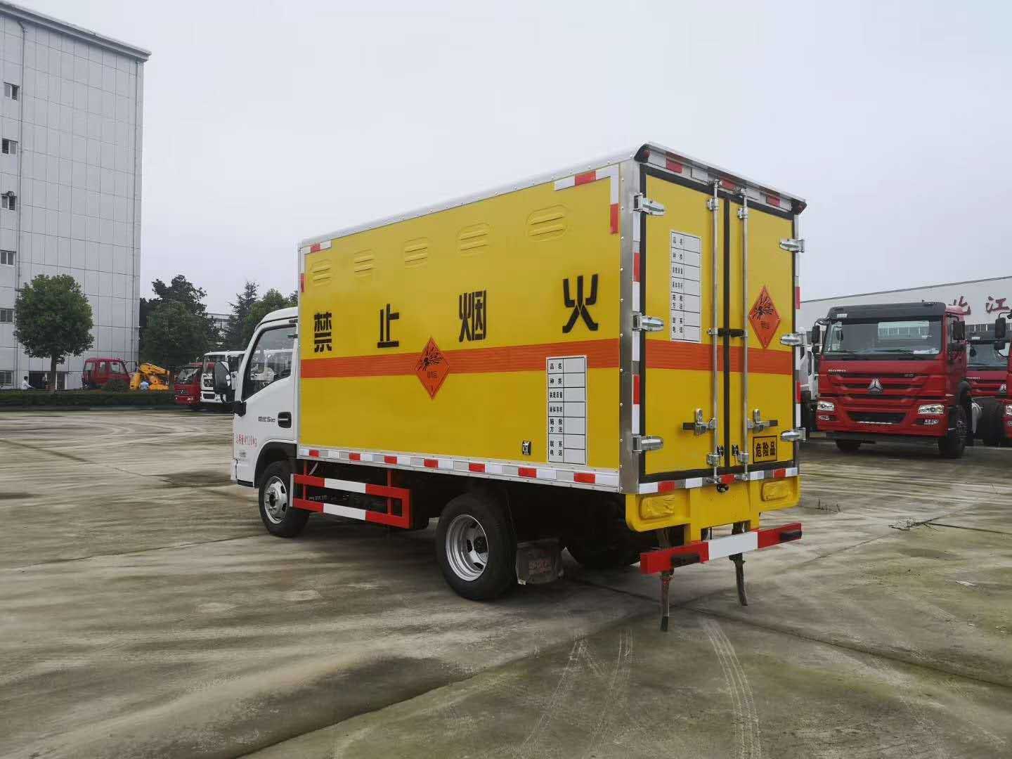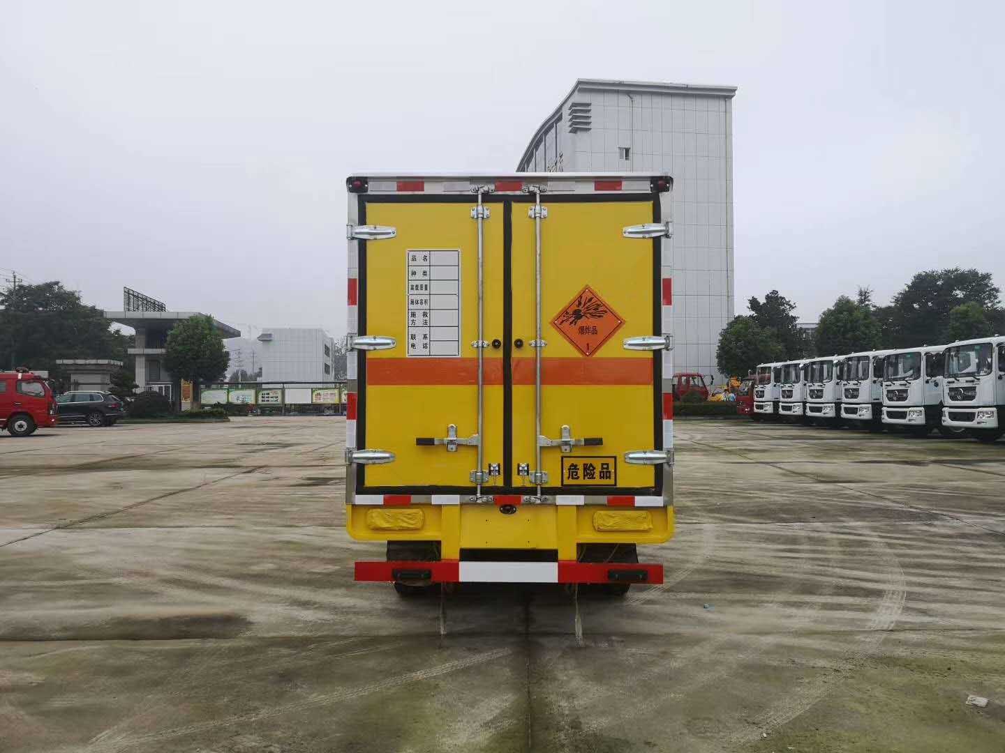 2)上裝配置:外飾冷軋鋼板,內飾鋁合金板,中間填充隔熱阻燃材料,(選裝側門和隔倉)廂體兩側上方設有防雨功能自然通風窗口,底部鋪有阻燃導靜電膠板,廂體側面裝有固定拉環,與捆綁帶使用捆綁貨物以避免移動。在車廂內頂部安裝感煙報警器,在門器框上方安裝有防盜報警器,廂體外側安裝示廓燈及滅火器支架,配置兩個滅火器,并有“嚴禁煙火”和“爆”等字樣,廂體周邊貼反光標識。后門貼有安全告示,危險品標牌。車輛尾部安裝兩條拖地導靜電膠帶,駕駛室頂部裝有安全三角燈。廂體顏色有:黃、白、灰色等可選。