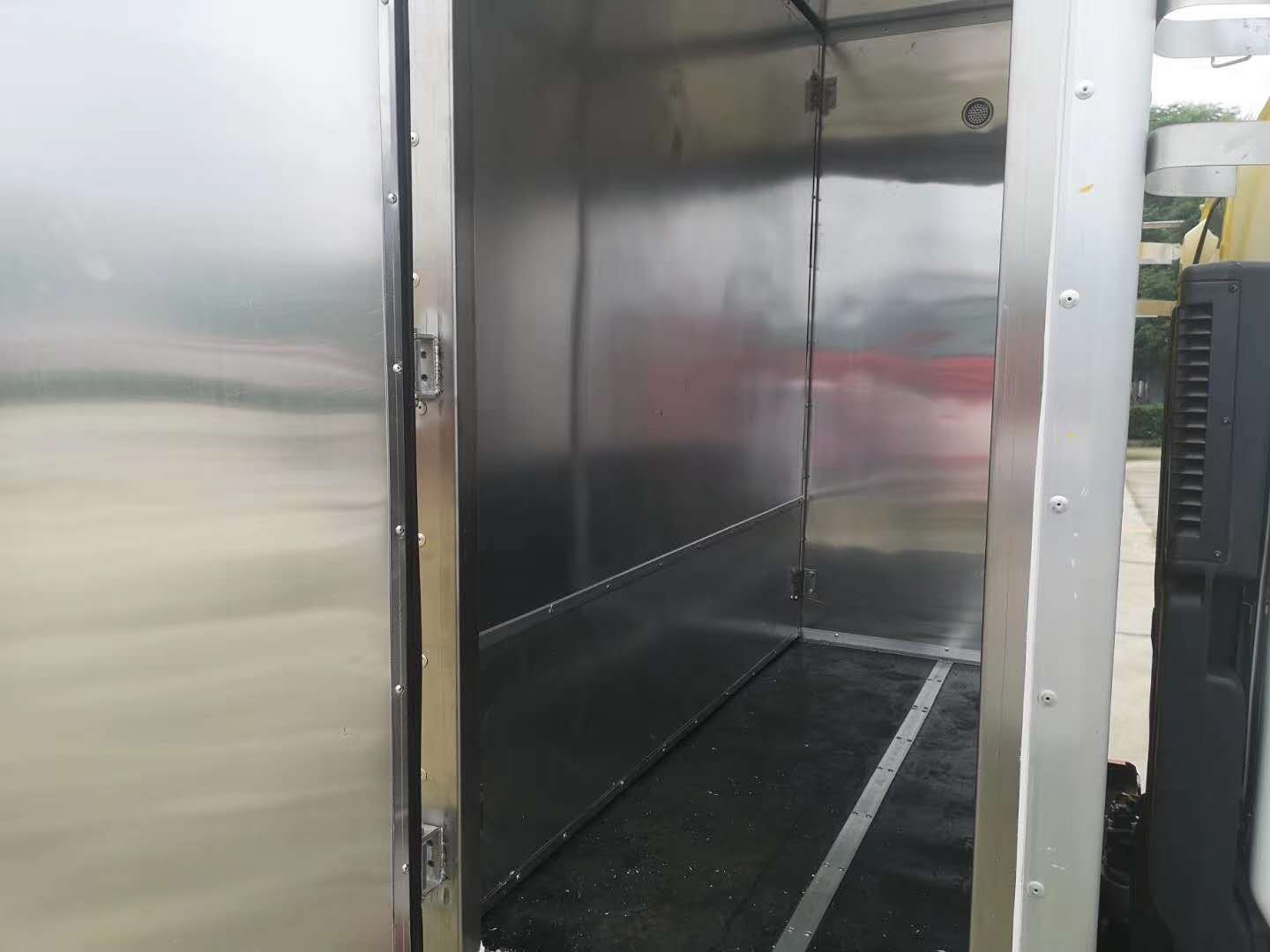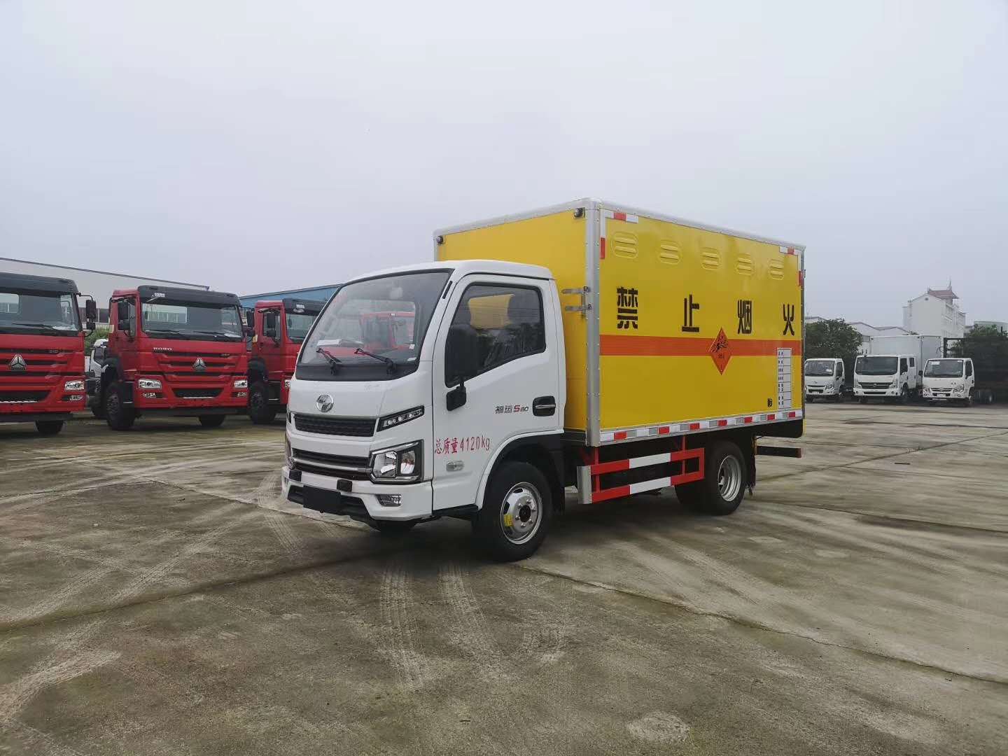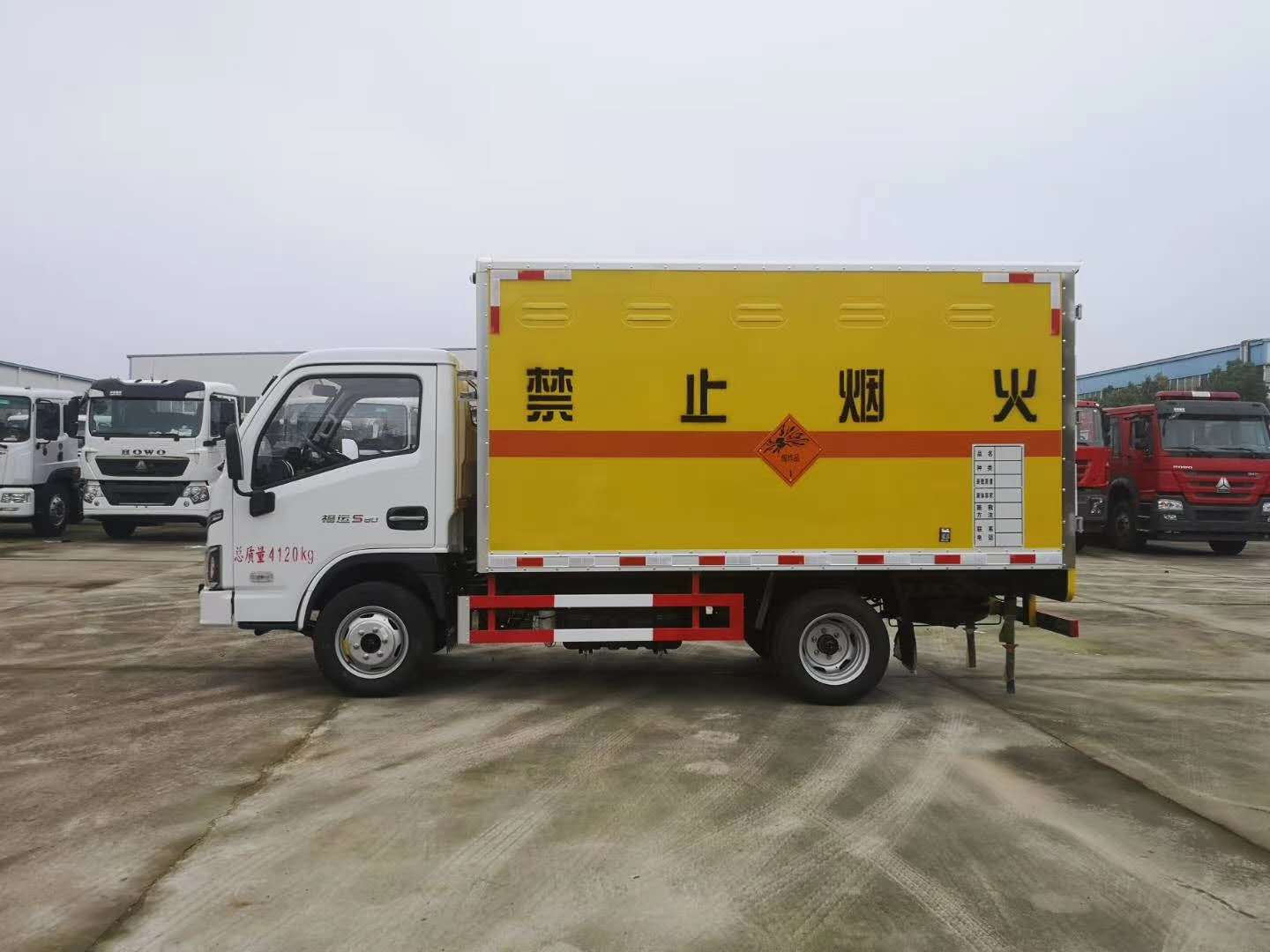 2)上裝配置:外飾冷軋鋼板,內飾鋁合金板,中間填充隔熱阻燃材料,(選裝側門和隔倉)廂體兩側上方設有防雨功能自然通風窗口,底部鋪有阻燃導靜電膠板,廂體側面裝有固定拉環,與捆綁帶使用捆綁貨物以避免移動。在車廂內頂部安裝感煙報警器,在門器框上方安裝有防盜報警器,廂體外側安裝示廓燈及滅火器支架,配置兩個滅火器,并有“嚴禁煙火”和“爆”等字樣,廂體周邊貼反光標識。后門貼有安全告示,危險品標牌。車輛尾部安裝兩條拖地導靜電膠帶,駕駛室頂部裝有安全三角燈。廂體顏色有:黃、白、灰色等可選。