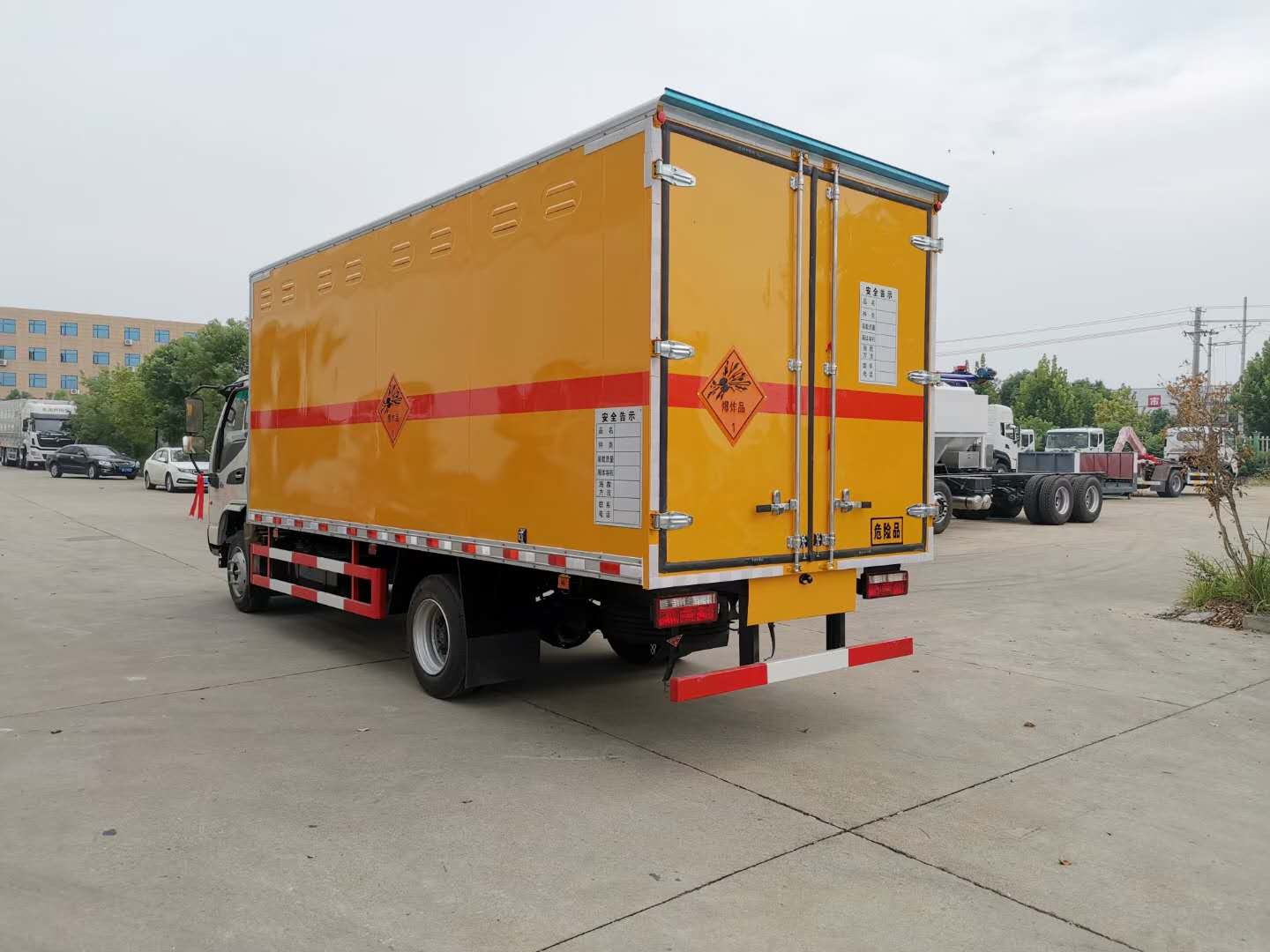 江淮5噸爆破器材運輸車嚴格按照公告尺寸制作,外板采用1mm厚冷軋板有一次性成型的百葉窗,內飾為導電性能良好的鋁板有透氣孔,內襯為矩形管骨架牢靠穩定,內部填充為透氣防潮阻燃的擠塑板,四種材料經現代工藝復合而成,廂體外部上下鋁合金型材包邊,底板和車廂前下部鋪橡膠皮,后門雙開,右側三個雙開門,內部有固定貨物的臥環,車輛外部有靜電帶、滅火器、防火罩,車廂內安裝煙霧報警器和門防盜報警器,嚴格按照國家危險品相關法規張貼。