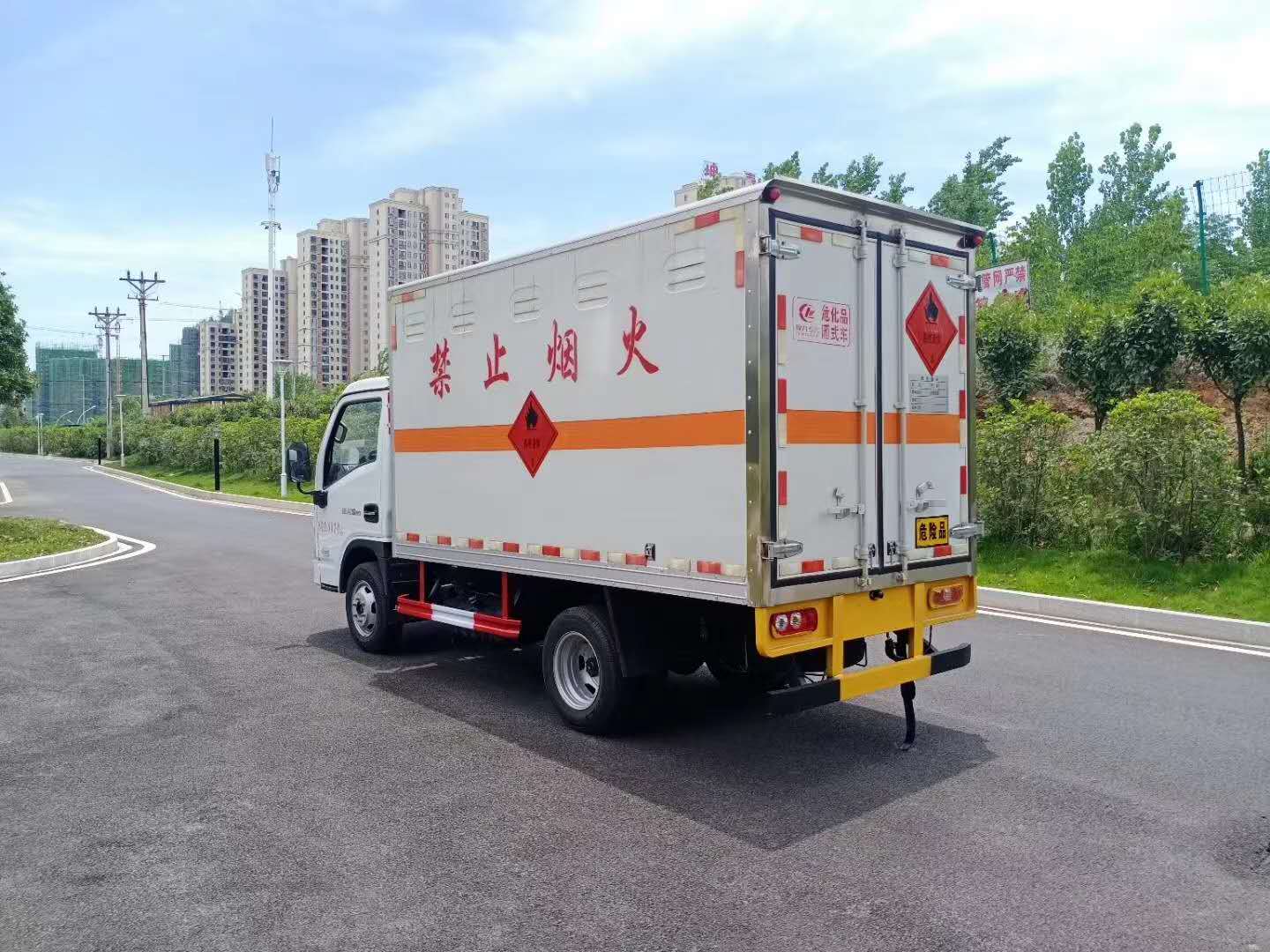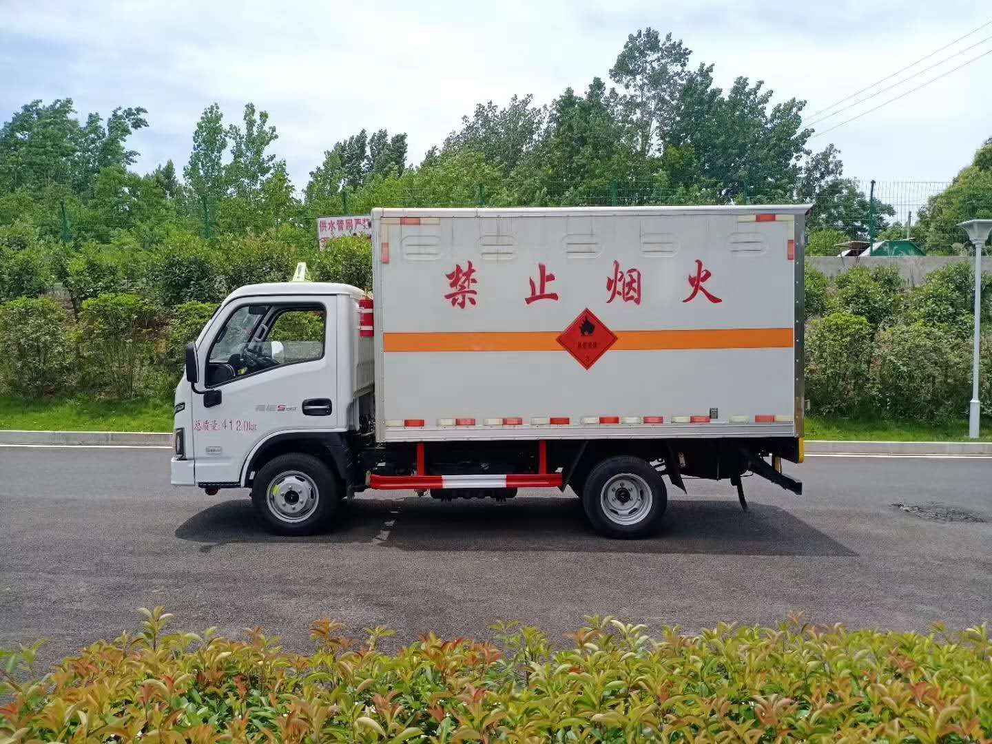 躍進(jìn)S80帶隔艙國六防爆車廂體采用外飾冷軋鋼板,內(nèi)飾鋁合金板,中間填充隔熱阻燃材料,(選裝側(cè)門和隔倉)廂體兩側(cè)上方設(shè)有防雨功能自然通風(fēng)窗口,底部鋪有阻燃導(dǎo)靜電膠板,廂體側(cè)面裝有固定拉環(huán),與捆綁帶使用捆綁貨物以避免移動。在車廂內(nèi)頂部安裝感煙報(bào)警器,在門器框上方安裝有防盜報(bào)警器,廂體外側(cè)安裝示廓燈及滅火器支架,配置兩個(gè)滅火器,并有“嚴(yán)禁煙火”和“爆”等字樣,廂體周邊貼反光標(biāo)識。后門貼有安全告示,危險(xiǎn)品標(biāo)牌。車輛尾部安裝兩條拖地導(dǎo)靜電膠帶,駕駛室頂部裝有安全三角燈。廂體顏色有:黃、白、灰色等可選。