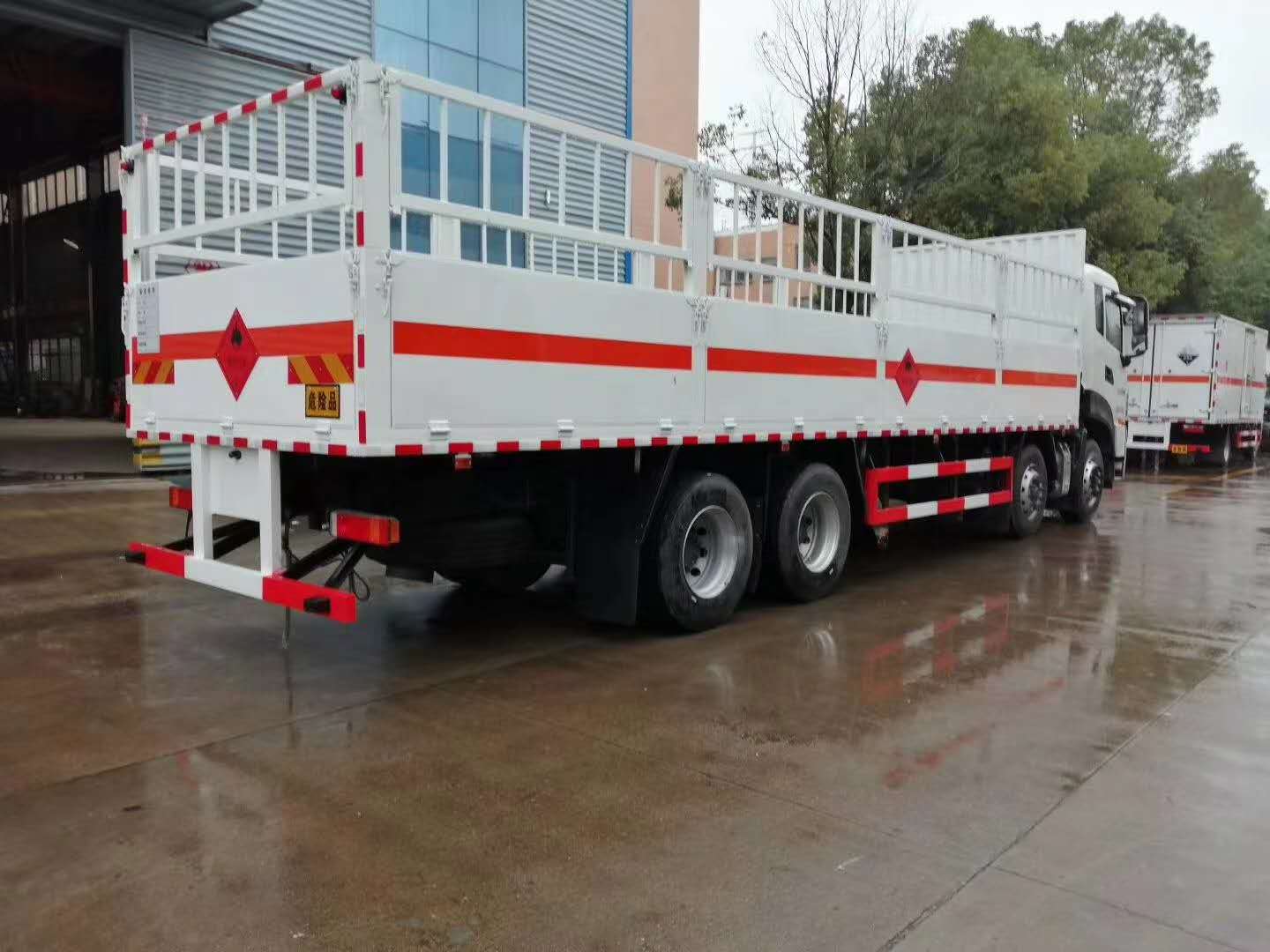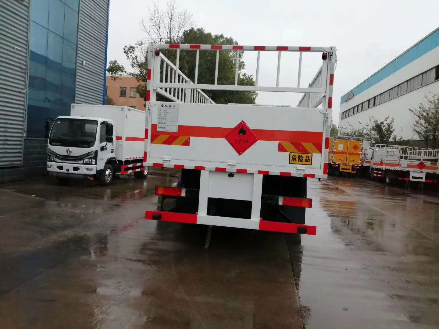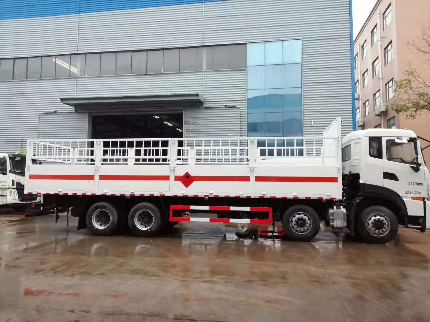 東風天龍前四后八國六氣瓶運輸車采用欄板車結構,外厚度為1.1毫米厚度武鋼冷軋鋼板(或沖壓成瓦楞板,以公告為準),內加強“幾”字型加強梁,車體底板加強處理并做防靜電處理。車體的左側、右側,和后欄板栓鉤結構,可向下打開,方便上下貨物,車體為密封廂式車型,大大減少了運輸物品因為狹窄空和強烈碰撞產生氣瓶爆炸的危險性,箱體外觀涂裝白色油漆,在欄板的中間位置粘貼橙色的危化車標帶,并在車體的左、右、后部粘貼“爆”字標識。駕駛室內部配備兩只滅火器,后保險杠處安裝防追尾事故的緩沖固定塊。此款車輛屬于國家規定的危險品二類危險品運輸車。