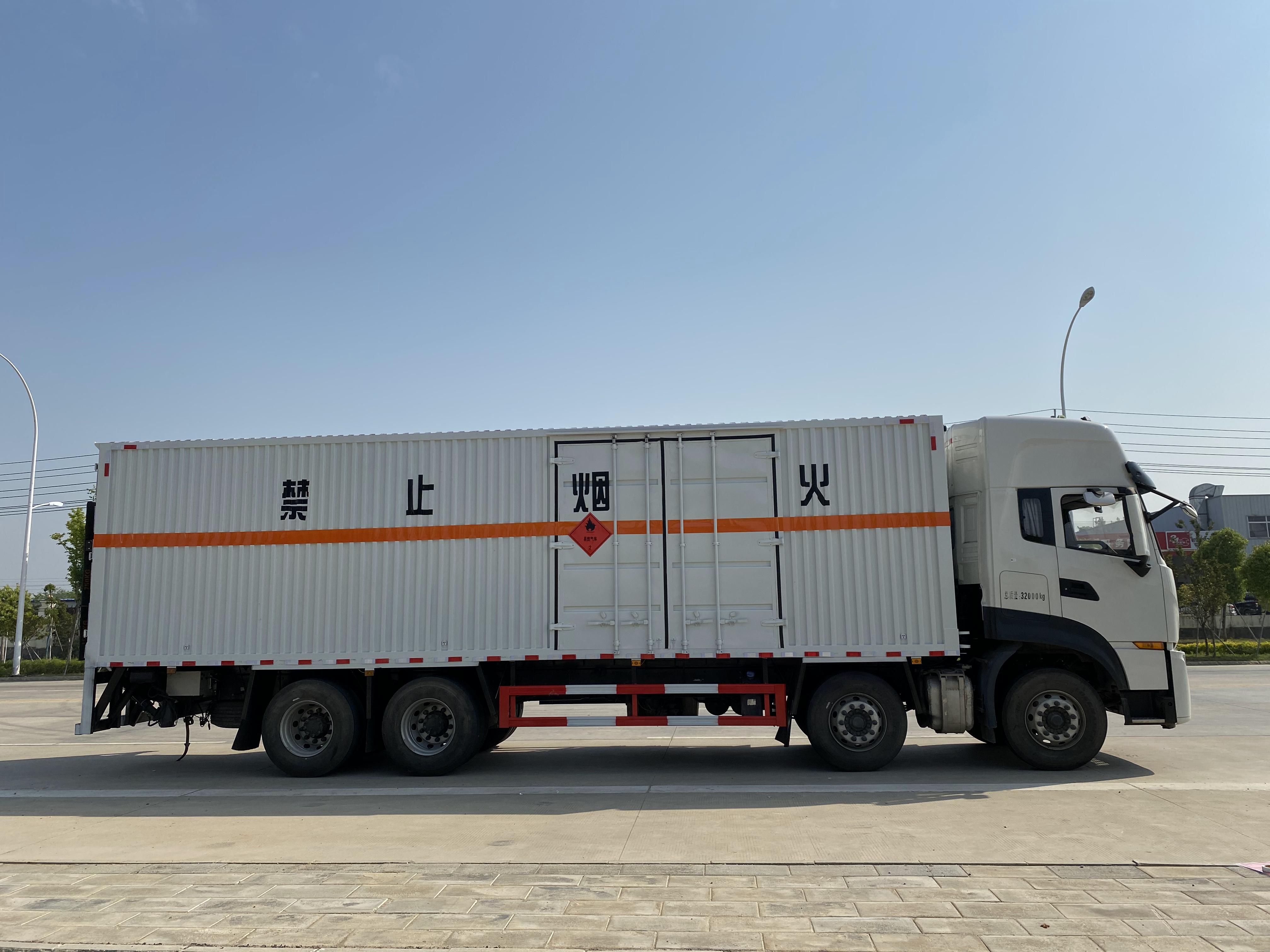 東風天龍前四后八危險品車外板采用冷軋鋼板壓瓦成型,內部槽鋼骨架,底板采用4mm花紋板上鋪設防靜電膠皮。廂體右側開對開門,后部設置對開門。廂體內部安裝煙霧報警器及防盜報警感應器。箱體及駕駛室為白色。廂內四周內飾采用鋁合金角鋁型材壓邊。廂內安裝固定運載物的臥環,防燃煙霧報警器,門上安裝防盜報警器,前置安裝防撞防靜電膠皮。廂體門框采用三元乙丙一次成形像膠密封條。廂體右側開兩個對開門,后部設置對開門。廂體內部安裝煙霧報警器及防盜報警感應器。箱體及駕駛室為白色。帶2噸液壓尾板。