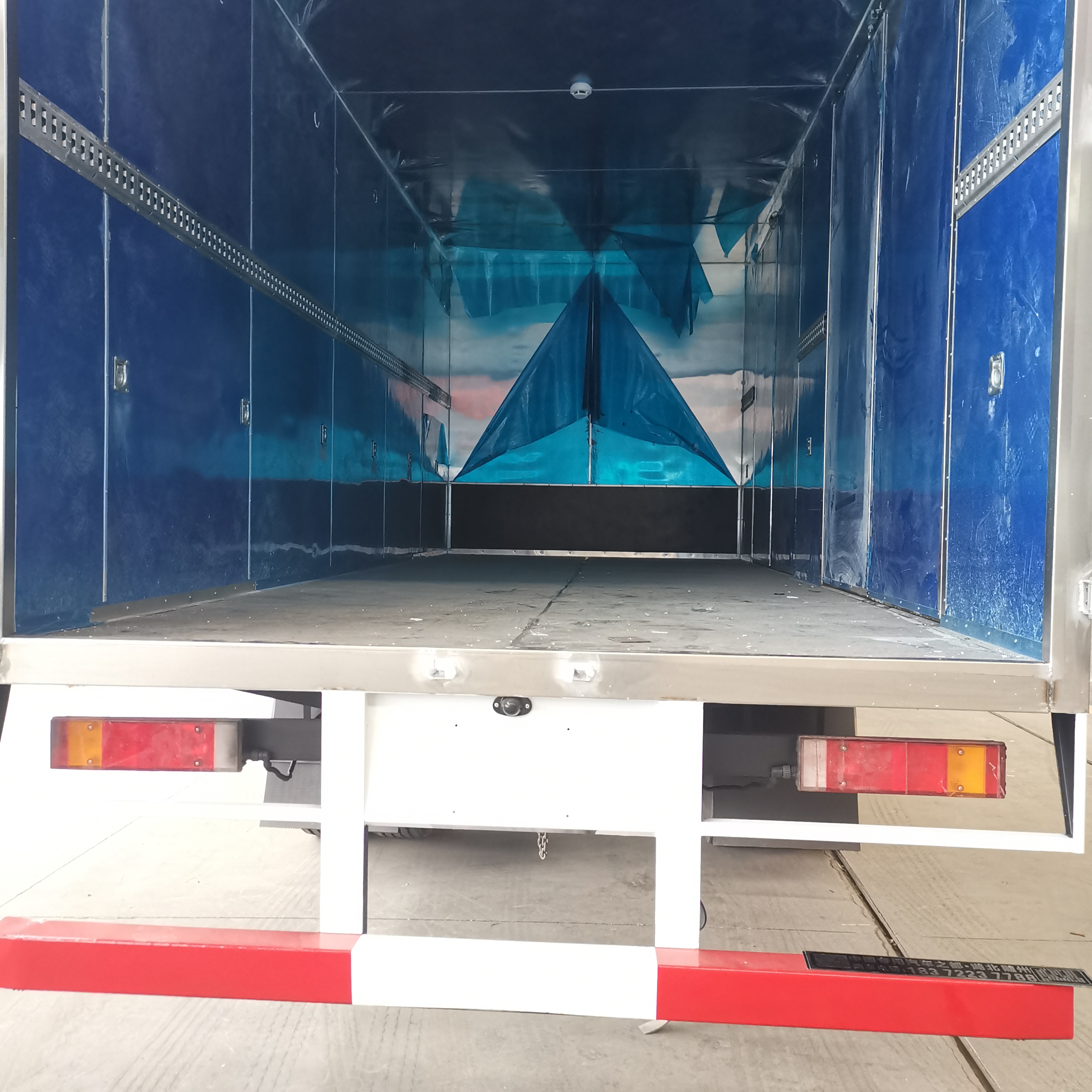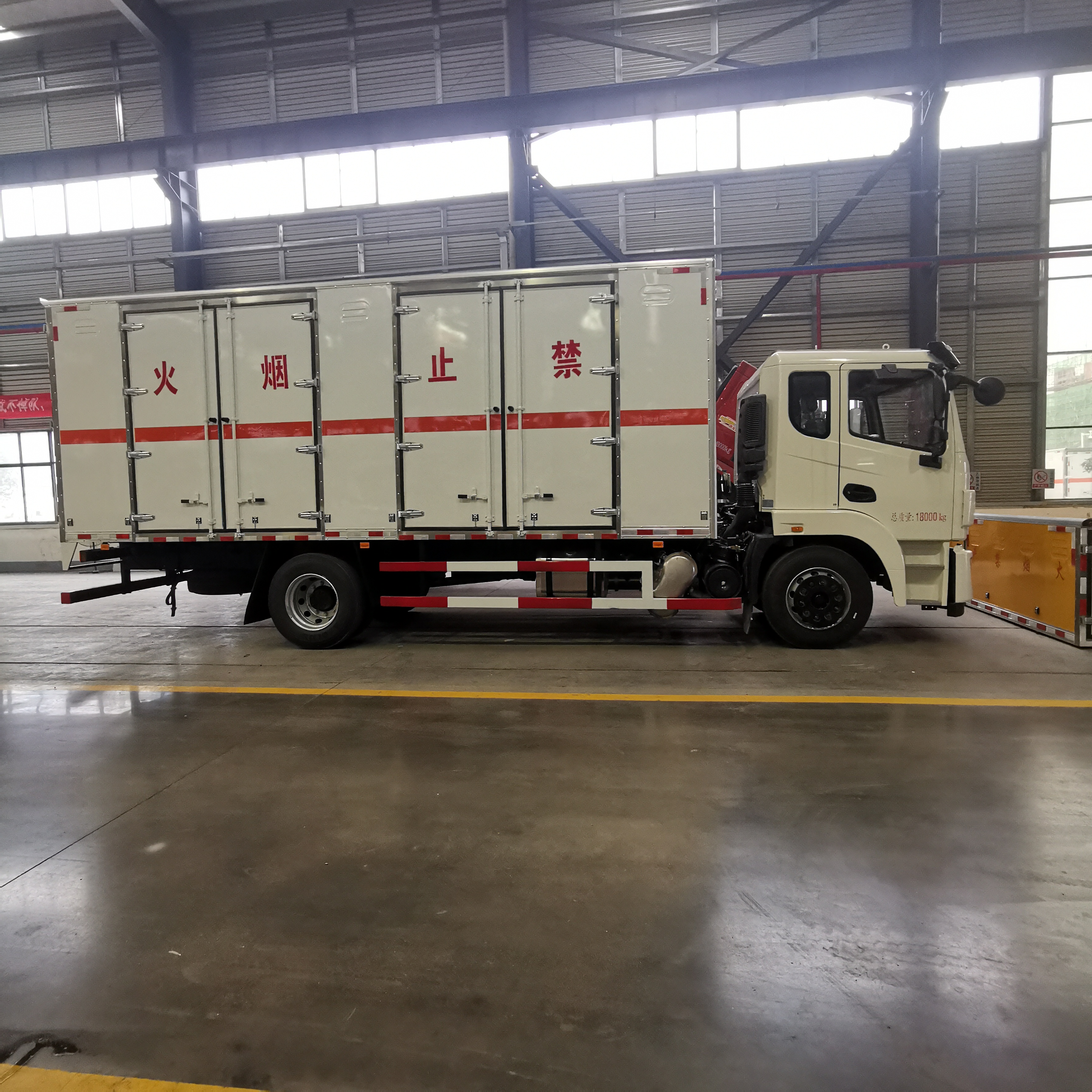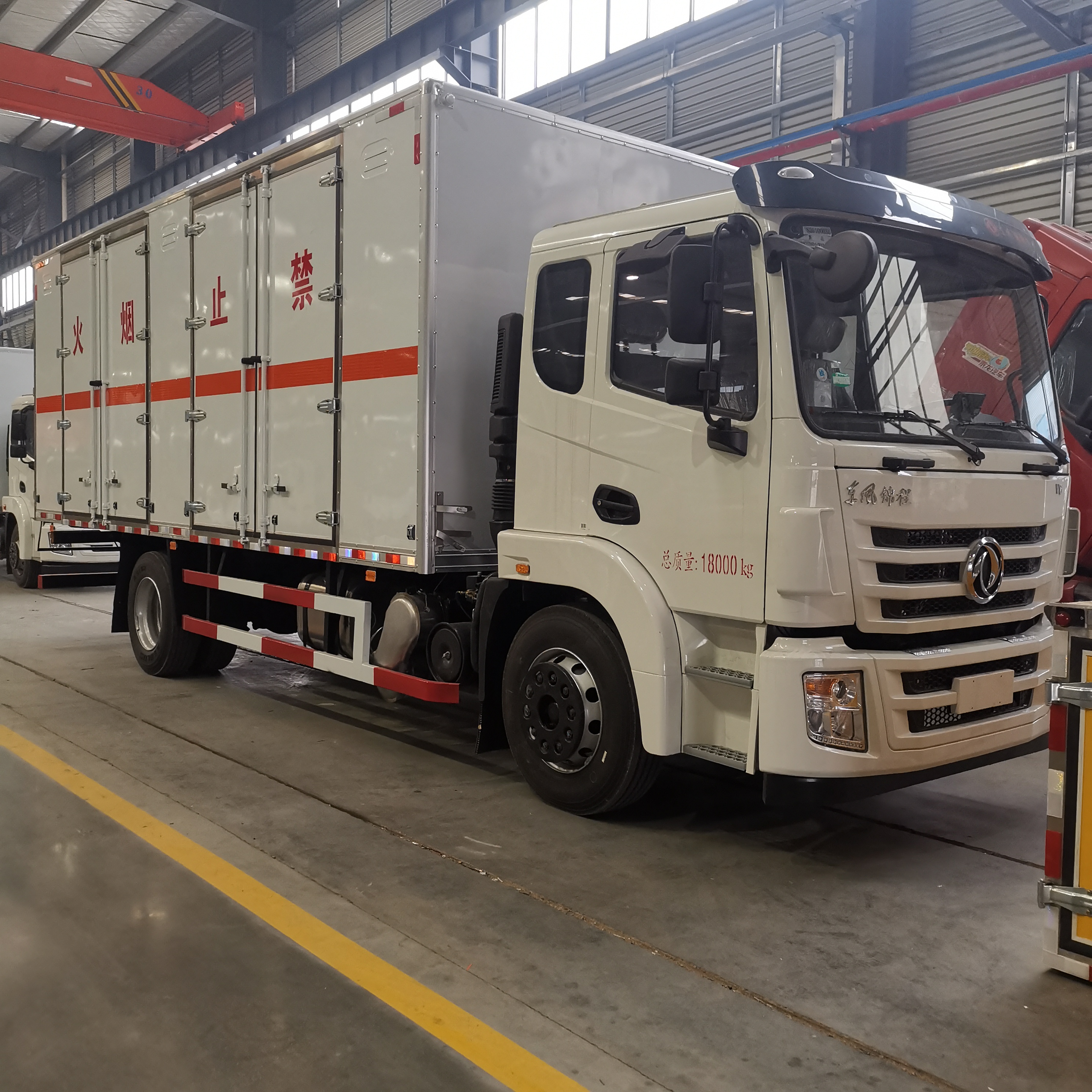 東風錦程國六6米8危險品車廂體內尺寸(長×寬×高)(mm):6800×2400×2400,廂體嚴格按照公告尺寸及外觀制作,廂體外板采用1.2mm厚冷軋板,上部留有一次性沖壓成型的百葉窗,內飾導電性能良好的鋁板并帶有有透氣孔,內襯矩形管骨架牢靠穩定,內部填充透氣防潮阻燃的泡沫板,四種材料經現代工藝復合加工而成;廂體外部上下鋁合金型材包邊,底板和車廂前下部鋪設防靜電橡膠皮,內部安裝有固定貨物的臥環,四周安裝防撞護板,廂體一側可選裝側開門;車廂內安裝有車載專用煙霧報警器,后門、側門防盜報警器;安裝靜電拖地帶,滅火器,防火罩;貼橙色反光帶,紅白反光板,粘貼菱形2類危險品標示,安全告示牌。