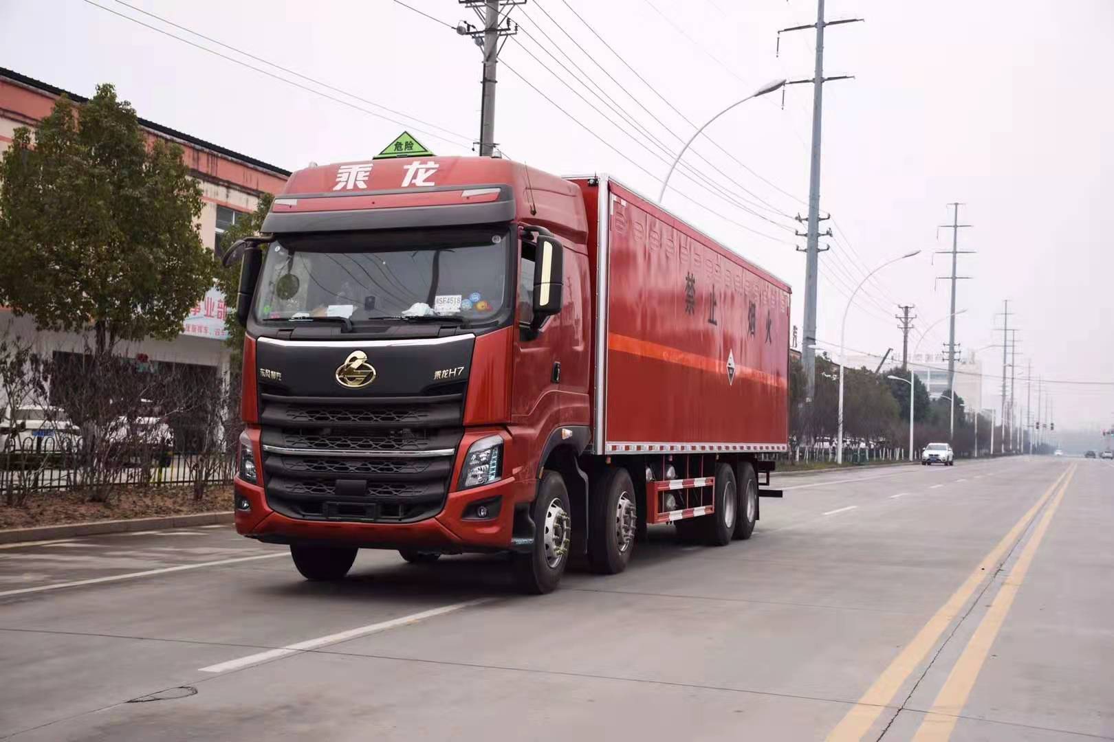 柳汽乘龍前四后八危險品車東風柳汽乘龍H5高頂雙臥駕駛室(氣囊),軸距1950+4100+1350,玉柴290馬力(YC6A290-50)發動機,法士特9檔(9JS119TA)變速箱,