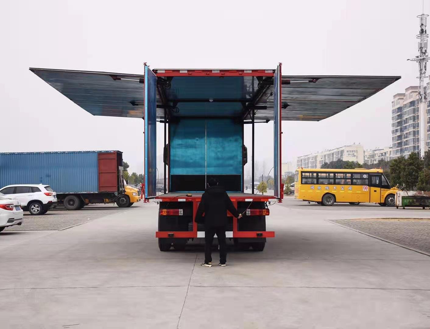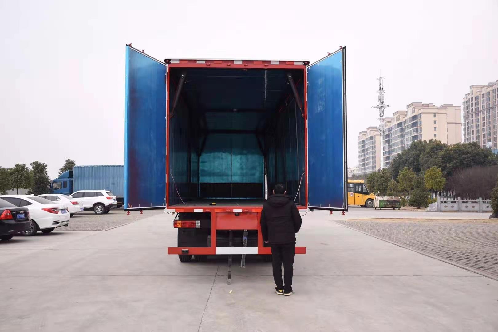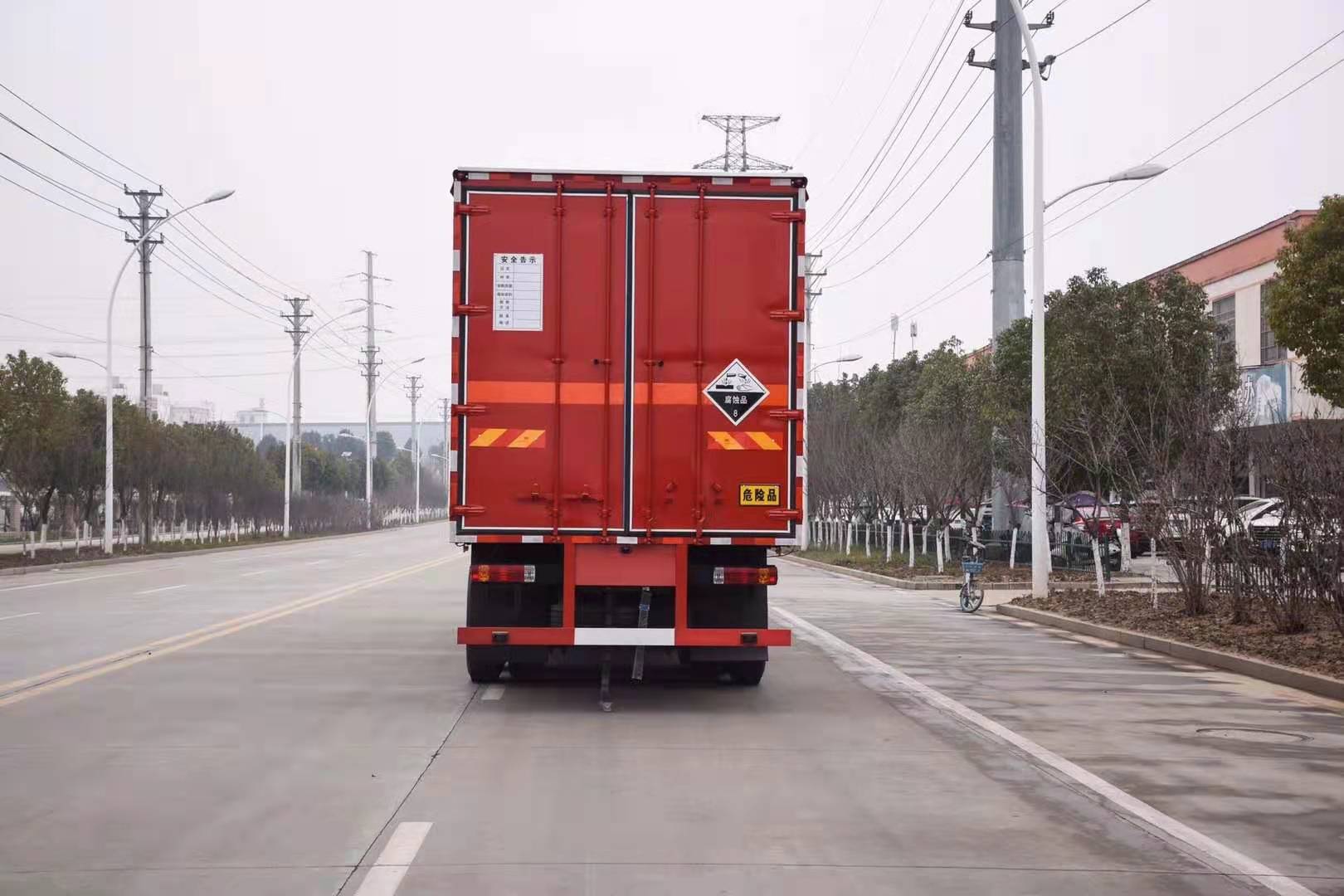 柳汽乘龍前四后八翼展危險品車嚴格按照公告尺寸制作,外板采用1mm厚冷軋板有一次性成型的百葉窗,內飾為導電性能良好的鋁板有透氣孔,內襯為矩形管骨架牢靠穩定,內部填充為透氣防潮阻燃的擠塑板,四種材料經現代工藝復合而成,廂體外部上下鋁合金型材包邊,底板和車廂前下部鋪橡膠皮,后門雙開,右側中部單開門,霧報警器和門防盜報警器,嚴格按照國家危險品相關法規張貼。