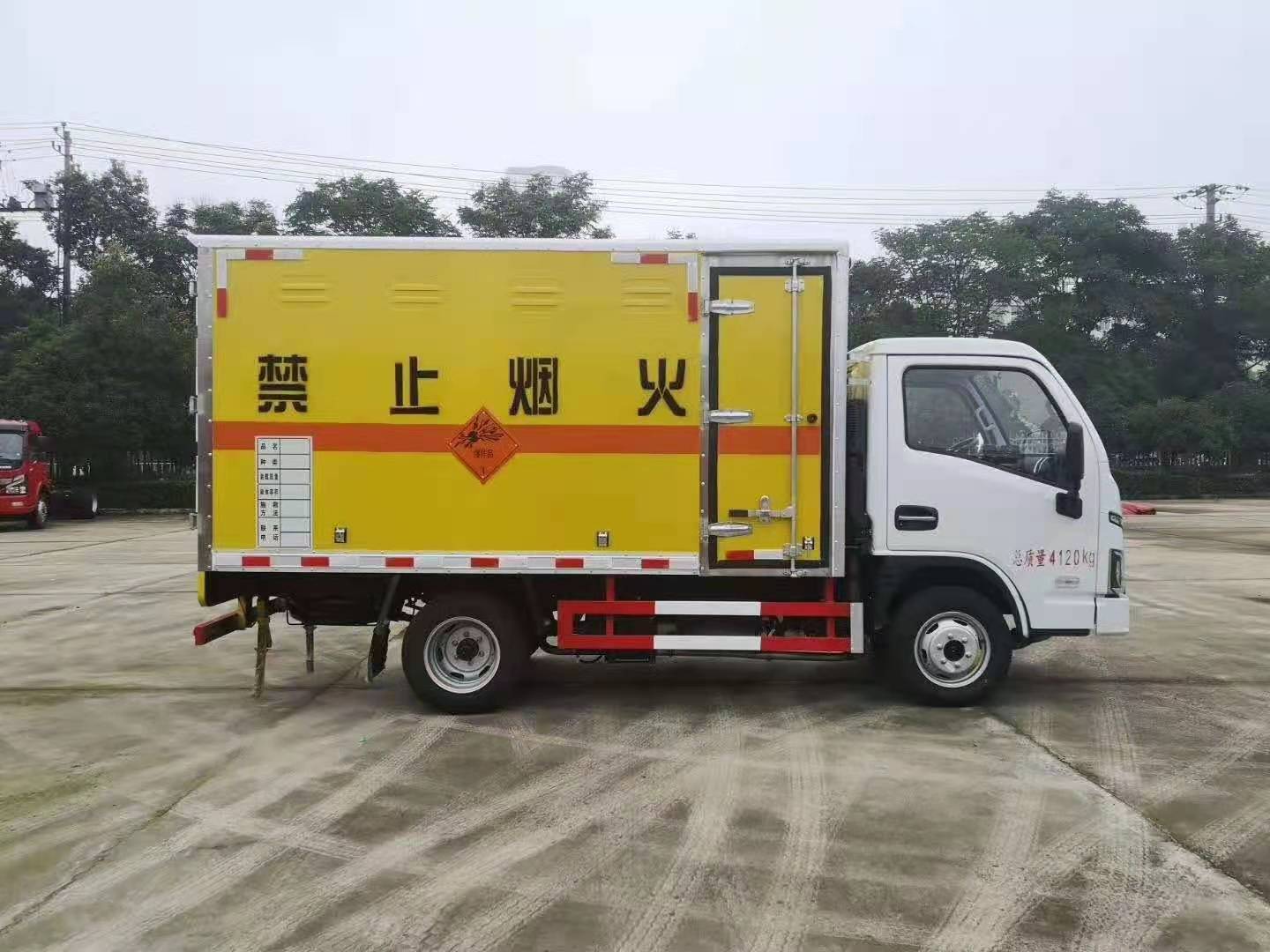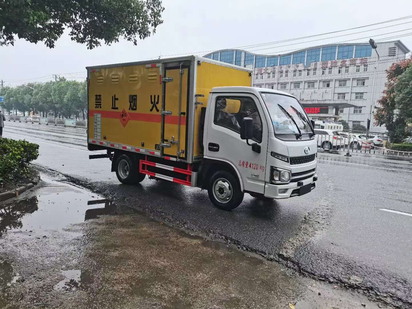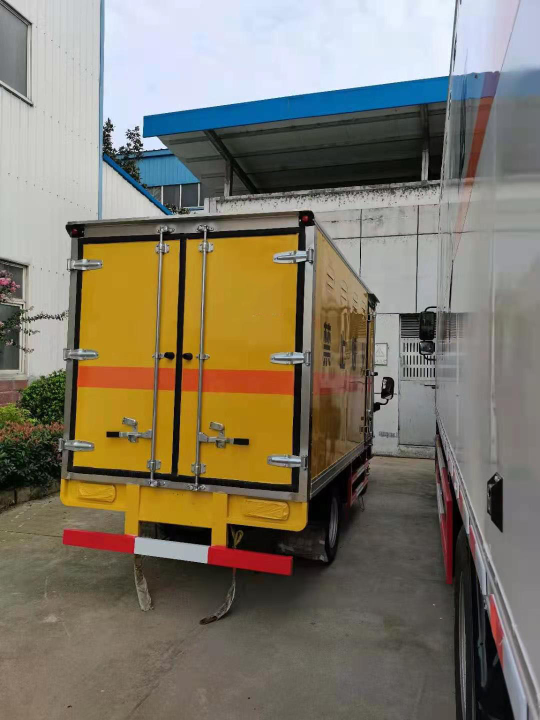 躍進國六柴油S80危險品車整車尺寸5150,5050×1895,1840,1790×2710,2610,2460,廂體尺寸3350,3100×1750,1690×1740,1650,1500,總質(zhì)量4120kg,額載質(zhì)量1700kg,廂體為雙層金屬結(jié)構(gòu),外板采用靜電屏蔽冷軋鋼板,中間填充B1級阻燃泡沫,內(nèi)飾為鋁板。廂體上側(cè)安裝防雨通風透氣孔。底板為平板,上鋪防靜電膠皮,廂體右側(cè)中開側(cè)門。廂內(nèi)兩側(cè)加裝固定貨物臥環(huán),門框帶防盜報警器,頂部帶煙霧報警器。
