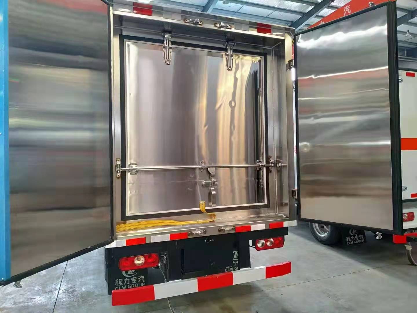國(guó)六3.2米躍進(jìn)S70醫(yī)療廢物轉(zhuǎn)運(yùn)車采用躍進(jìn)專用危險(xiǎn)品車底盤,新款駕駛室,5擋箱,方向助力,空調(diào),油剎,ABS,前盤制動(dòng),大燈調(diào)節(jié),雙板簧,反光背心,185R14后雙胎,行車記錄儀。外板采用冷軋板,中間填充隔熱阻燃材料,廂內(nèi)全部為不銹鋼板,尾部帶不銹鋼門內(nèi)門(選裝側(cè)門)。上裝工具包括靜電帶,滅火器,防火帽,三角頂燈。國(guó)標(biāo)反光標(biāo)示及警告標(biāo)志。不銹鋼五金件,紫外線殺毒燈,噴霧消毒壺和噴淋裝置。