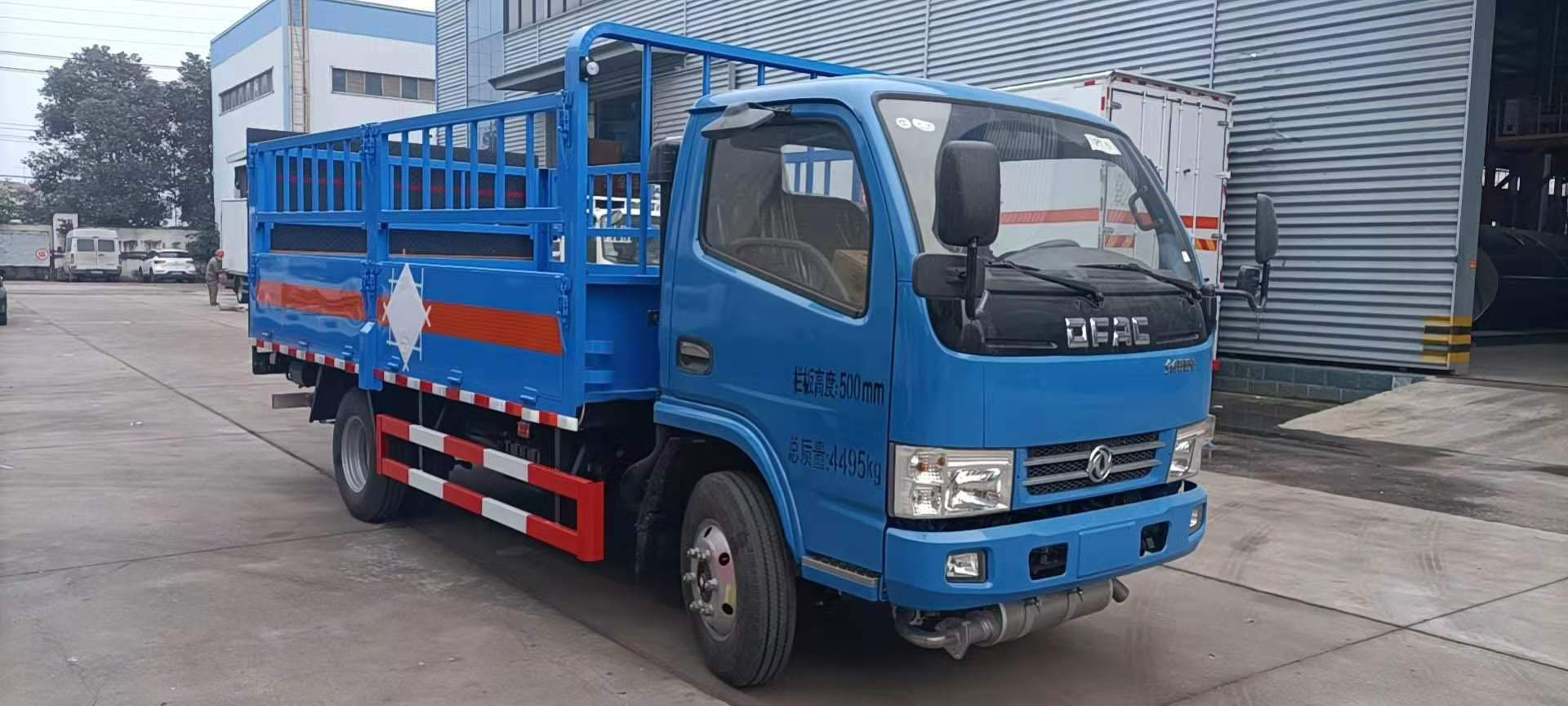 除了馬力大,該車做氣瓶運輸車廂體也非常大,貨箱尺寸:4100×2000×550mm。箱體采用廂式欄板車結構,外厚度為1.1毫米厚度武鋼冷軋鋼板(或沖壓成瓦楞板,以公告為準),內加強“幾”字型加強梁,車體底板加強處理并做防靜電處理。車體的左側、右側,和后欄板栓鉤結構,可向下打開,方便上下貨物,車體為空曠式車型,大大減少了運輸物品因為狹窄空和強烈碰撞產生氣瓶爆炸的危險性,箱體外觀涂裝白色油漆,在欄板的中間位置粘貼橙色的危化車標帶,并在車體的左、右、后部粘貼“易燃氣體”或“不燃氣體”標識。駕駛室內部配備兩只滅火器,后保險杠處安裝防追尾事故的緩沖固定塊。此款車輛屬于國家規定的危險品二類倉欄式運輸車。車輛外部有靜電帶、滅火器、防火罩,車廂內安裝煙霧報警器和門防盜報警器,嚴格按照國家危險品相關法規張貼。