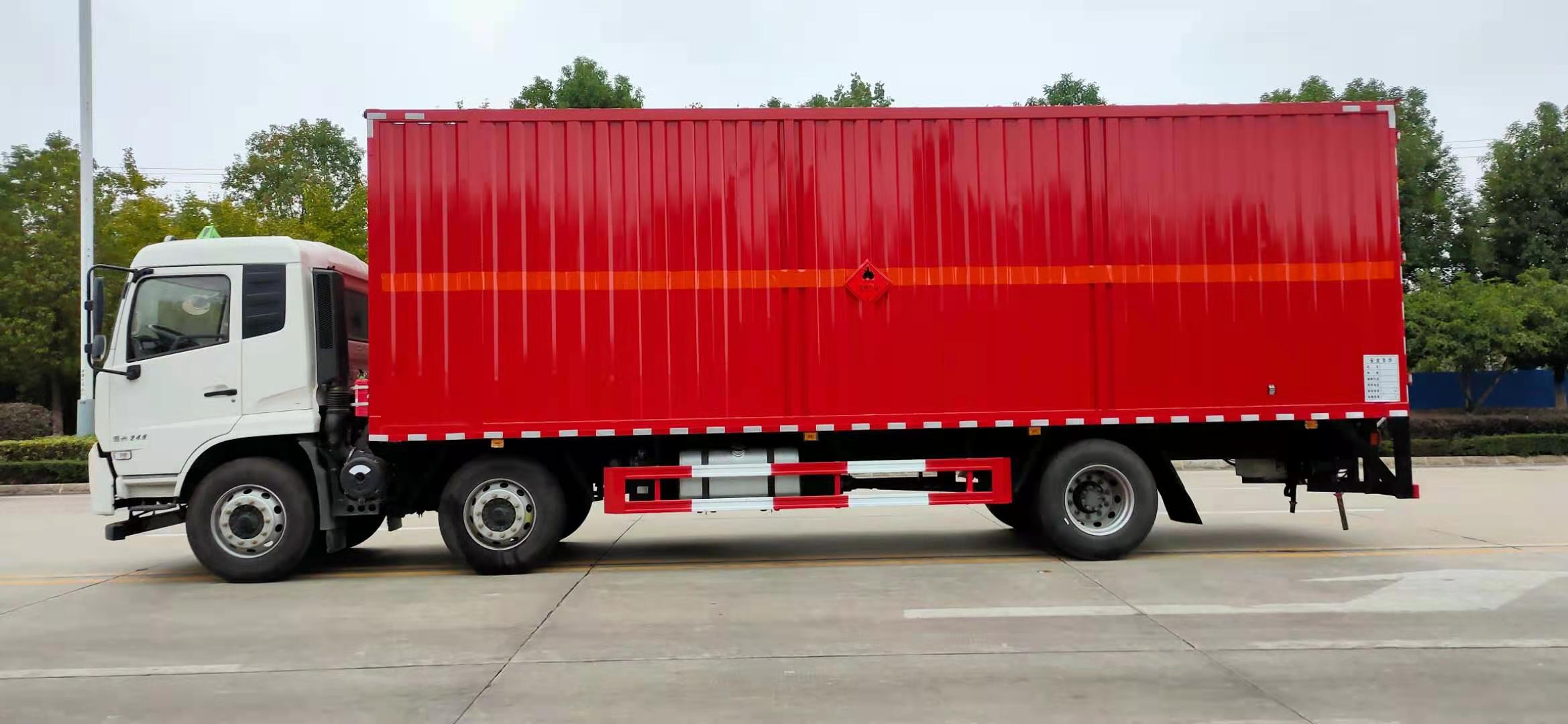 東風天錦三軸9米易燃液體廂式運輸車嚴格按照公告尺寸制作,外板采用 1mm 厚冷軋板有一次性成型的百葉窗,內飾為導電性能良好的鋁板有透氣孔,內襯為矩形管骨架牢靠穩定,內部填充為透氣防潮阻燃的擠塑板,四種材料經現代工藝復合而成,廂體外部上下鋁合金型材包邊,底板和車廂前下部鋪橡膠皮,后門雙開,右側中部兩個雙開門,內部有固定貨物的臥環,車輛外部有靜電帶、滅火器、防火罩,車廂內安裝煙霧報警器和門防盜報警器,嚴格按照國家危險品相關法規張貼。