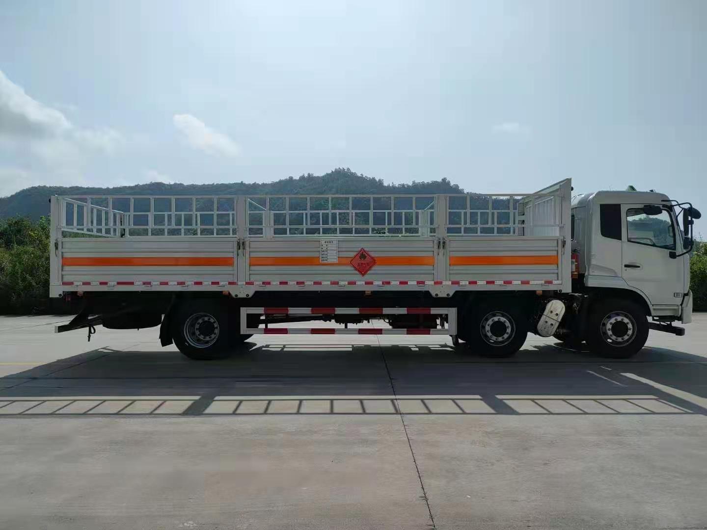 東風天錦三軸國六氣瓶運輸車廂體嚴格按照公告尺寸制作,箱體采用廂式欄板車結構,外厚度為1.1毫米厚度武鋼冷軋鋼板(或沖壓成瓦楞板,以公告為準),內加強“幾”字型加強梁,車體底板加強處理并做防靜電處理。車體的左側、右側,和后欄板栓鉤結構,可向下打開,方便上下貨物,車體為空曠式車型,大大減少了運輸物品因為狹窄空和強烈碰撞產生氣瓶爆炸的危險性,箱體外觀涂裝白色油漆,在欄板的中間位置粘貼橙色的危化車標帶,并在車體的左、右、后部粘貼“易燃氣體”或“不燃氣體”標識。駕駛室內部配備兩只滅火器,后保險杠處安裝防追尾事故的緩沖固定塊。此款車輛屬于國家規定的危險品二類倉欄式運輸車。廂體內部有固定貨物的臥環,車輛外部有靜電帶、滅火器、防火罩,車廂內安裝煙霧報警器和門防盜報警器,嚴格按照國家危險品相關法規張貼。