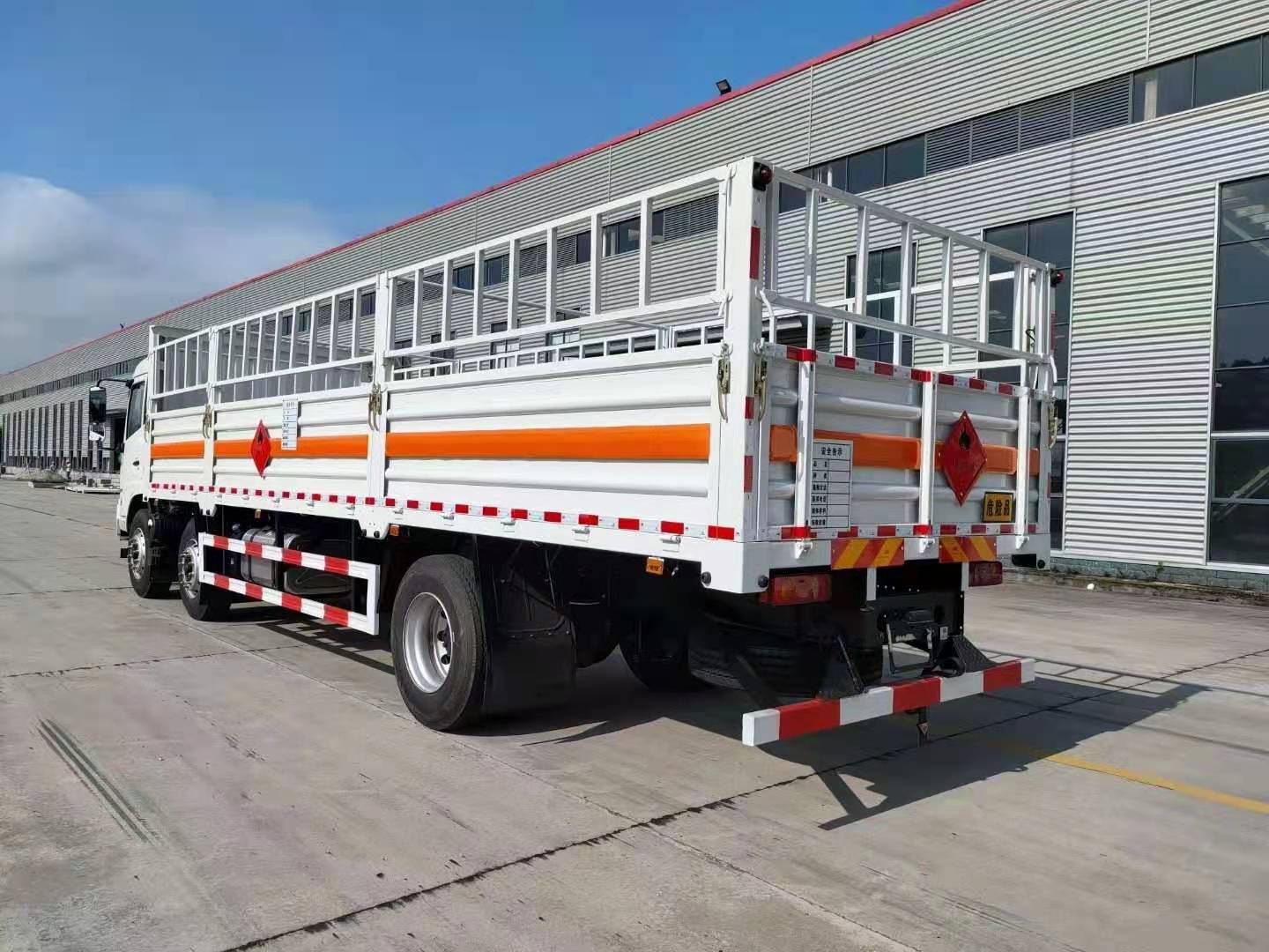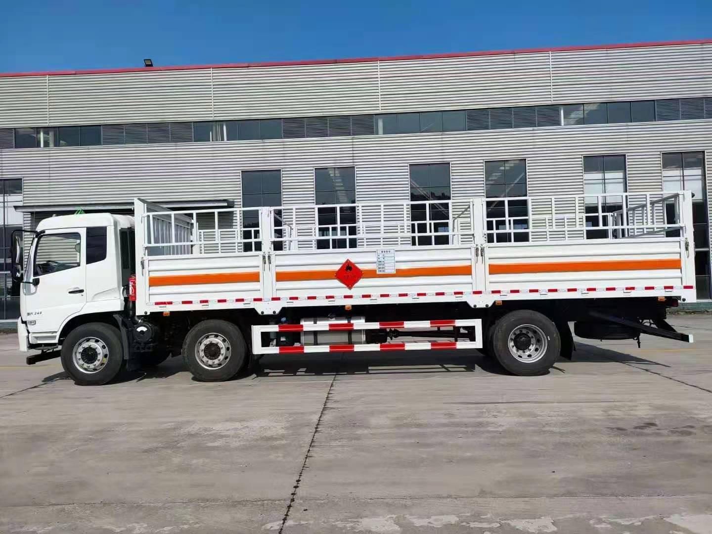 東風天錦三軸8米6國六氣瓶運輸車底盤配置:采用東風天錦小三軸原廠危險品車底盤,采用康明斯B6.2NS6B245發動機,大同DC7J100TA變速箱,軸距:1995+5000mm,295/80R22.518PR真空輪胎;前橋6噸,后橋10噸,單減,空氣懸架底盤,帶280L鋁油箱,排氣管前置,帶前盤制動、應急防爆胎裝置、剎車襯片預警提示。東風天錦三軸8米6國六氣瓶運輸車嚴格按照公告尺寸制作,邊2底4材質,底板上鋪靜電膠皮,側板平板內置臥環,側板上帶可卸式高欄,配備滅火器,三角頂燈,靜電拖帶等,嚴格按照國家危險品法規進行“易燃氣體”標識粘貼等。