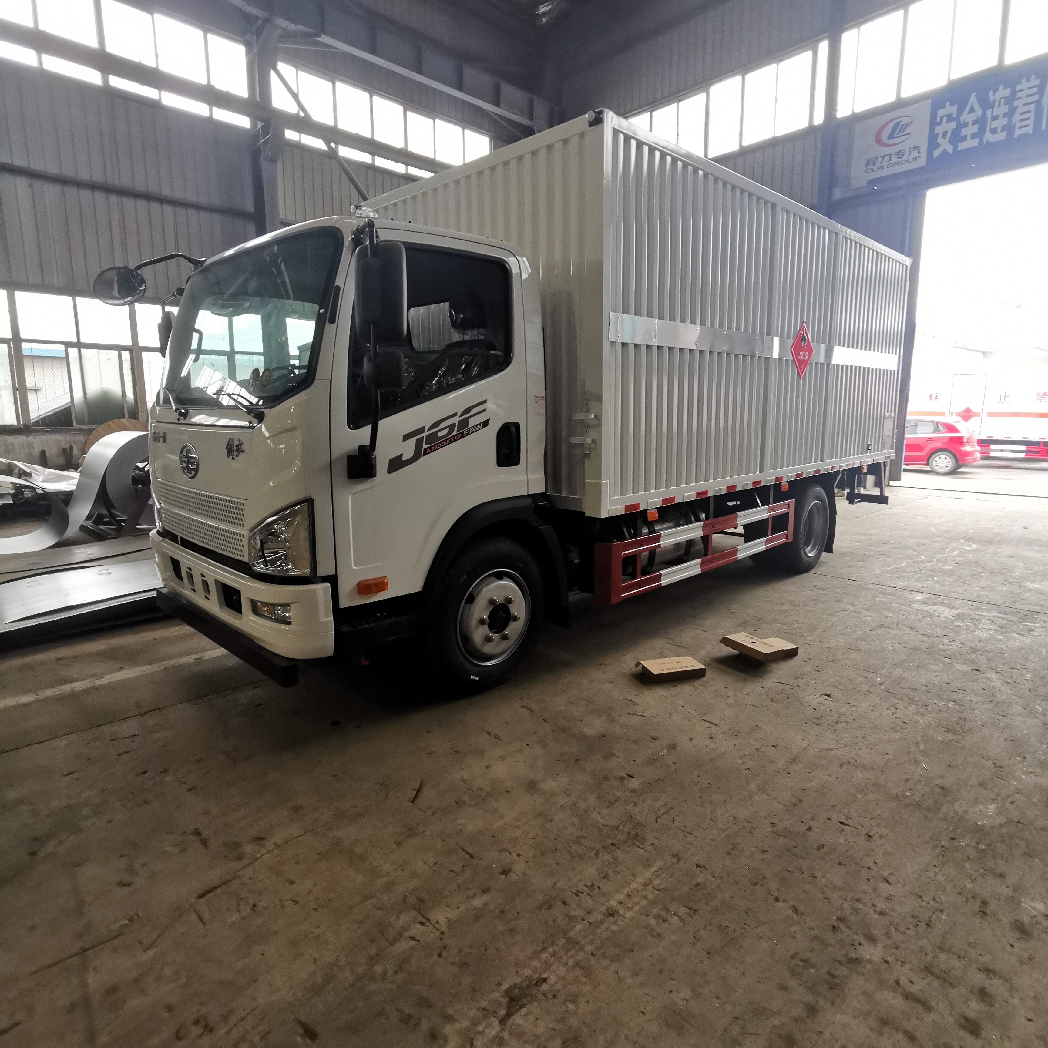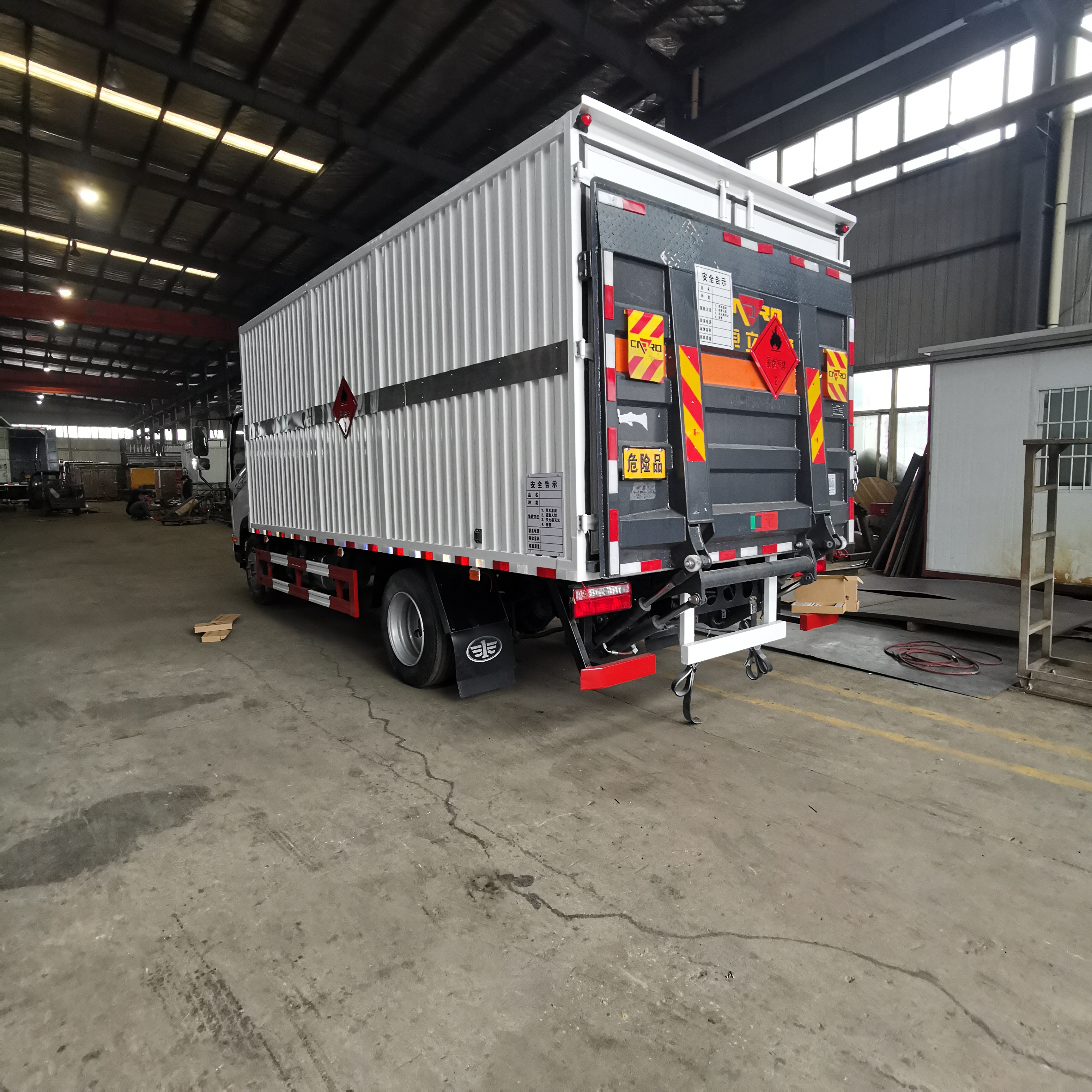 解放5米1國六瓦楞板危險品車采用瓦楞廂體制作,廂體長度5米1,該車右側(cè)帶中開側(cè)門,尾板帶液壓尾板,裝卸貨物更方便。廂體側(cè)邊及尾部粘貼有反光貼和危險品標識,帶靜電拖帶,整車滿足危險品車的行業(yè)標準。