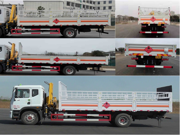 有環保,有燃油,不超重.廂長6.8米,帶空氣懸掛底盤,防爆胎,安全帶提示報警,剎車報警。廂體可選高欄和低欄瓦楞式,配備滅火器,三角頂燈,靜電拖帶等,嚴格按照國家危險品法規進行“易燃氣體”標識粘貼等,帶徐工吊(4噸3節折臂)