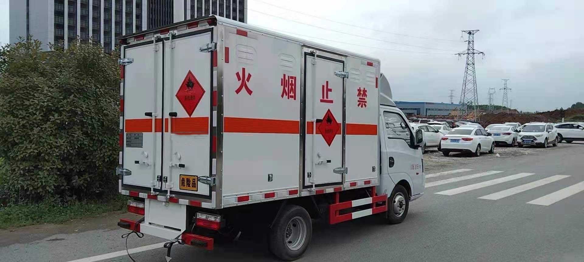 東風途逸國六柴油易燃液體廂式運輸車廂體采用外飾冷軋鋼板,內飾鋁合金板,中間填充隔熱阻燃材料,廂體兩側上方設有防雨功能自然通風窗口,底部鋪有阻燃導靜電膠板,廂體側面裝有固定拉環,與捆綁帶使用捆綁貨物以避免移動。在車廂內頂部安裝感煙報警器,在門器框上方安裝有防盜報警器,廂體外側安裝示廓燈及滅火器支架,配置兩個滅火器,并有“嚴禁煙火”和“爆”等字樣,廂體周邊貼反光標識。后門貼有安全告示,危險品標牌。車輛尾部安裝兩條拖地導靜電膠帶,駕駛室頂部裝有安全三角燈。廂體顏色有:黃、白、灰色等可選。