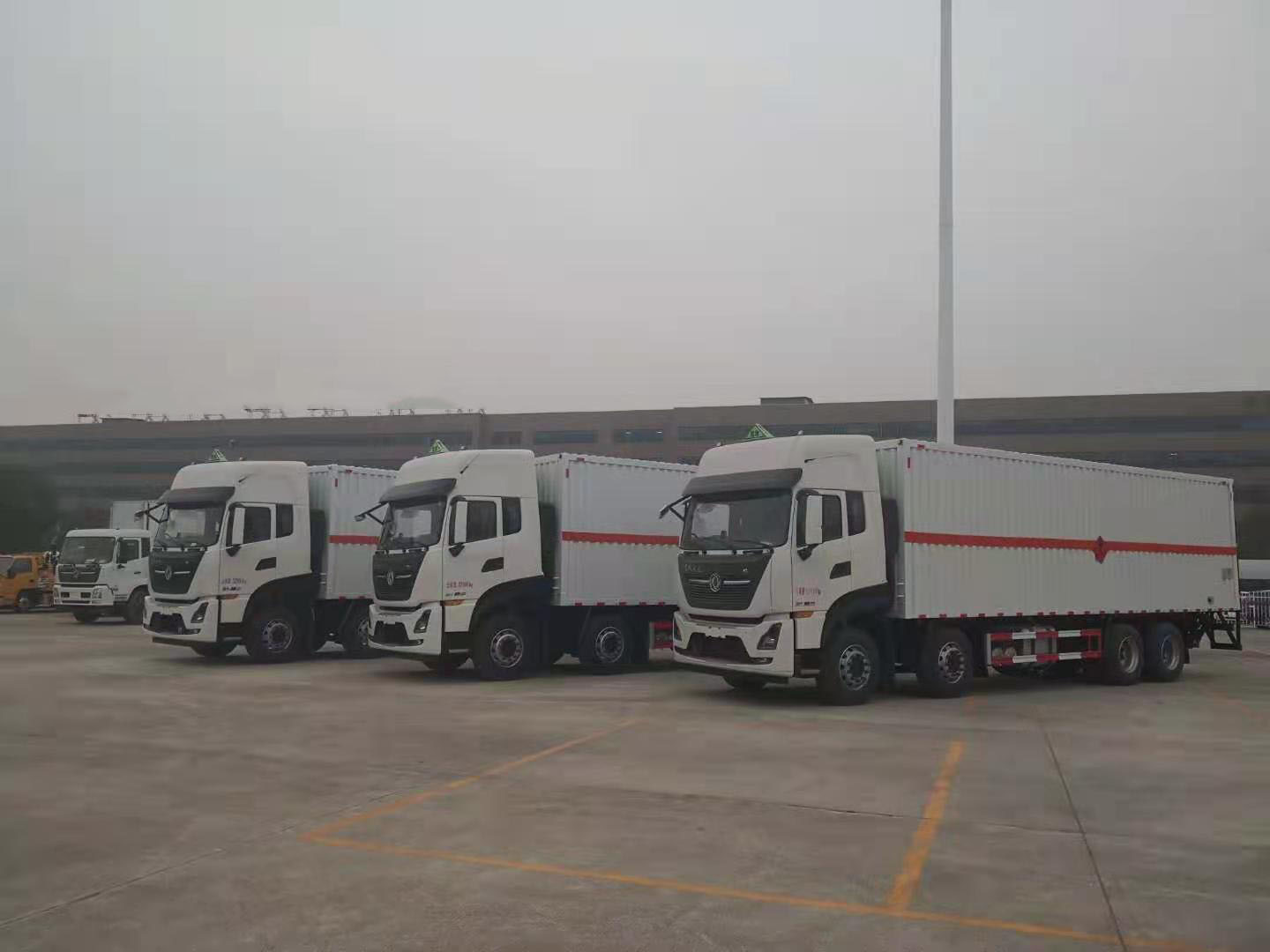 東風(fēng)天龍前四后八國六廂式運(yùn)輸車采用D320天龍KL駕駛室,龍擎DDi75E350-60發(fā)動(dòng)機(jī)(沃爾沃技術(shù)),陜齒9JS135TA變速箱,前5.5噸,后10噸,1995+4500+1350mm軸距,295/80R22.5 18PR真空胎,鋁350L油箱,帶空調(diào),電動(dòng)玻璃,遙控鑰匙,行車記錄儀,氣囊座椅,前盤,后鼓,ECU限速,后橋空懸。帶EBS(電控制動(dòng)系統(tǒng)),F(xiàn)CWS(防碰撞預(yù)警),LDWS(車道偏離預(yù)警),TPMS(前軸單臺(tái)胎壓監(jiān)測)ESC,EACS(駕駛室氣囊調(diào)節(jié)),AEBS。外板采用1.2mm厚冷軋鋼板壓瓦成型,內(nèi)部槽鋼骨架,底板采用3mm花紋板上鋪設(shè)防靜電膠皮。廂體右側(cè)開對開門,后部設(shè)置對開門,廂體內(nèi)部兩側(cè)安裝捆綁貨物的臥環(huán)。廂體內(nèi)部安裝煙霧報(bào)警器及防盜報(bào)警感應(yīng)器。