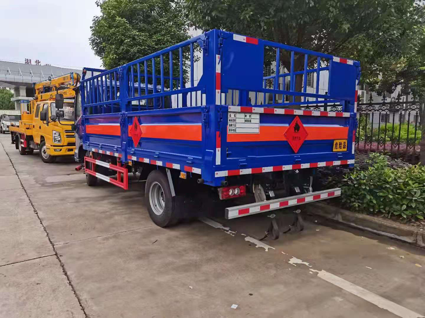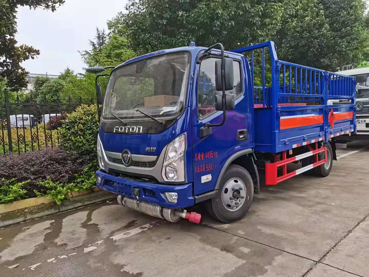福田奧鈴氣瓶運輸車可選高欄或者低欄板,客戶可根據自身需求進行定制,該車的顏色可選,廂體外粘貼危險品標識。