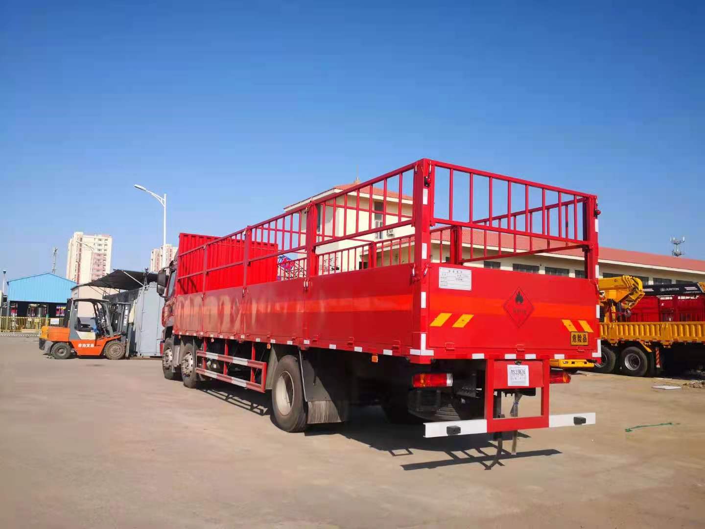二手柳汽三軸9米6氣瓶車采用廂式欄板車結(jié)構(gòu),外厚度為1.1毫米厚度武鋼冷軋鋼板(或沖壓成瓦楞板,以公告為準(zhǔn)),內(nèi)加強(qiáng)“幾”字型加強(qiáng)梁,車體底板加強(qiáng)處理并做防靜電處理。車體的左側(cè)、右側(cè),和后欄板栓鉤結(jié)構(gòu),可向下打開,方便上下貨物,車體為空曠式車型,大大減少了運輸物品因為狹窄空和強(qiáng)烈碰撞產(chǎn)生氣瓶爆炸的危險性,箱體外觀涂裝白色油漆,在欄板的中間位置粘貼橙色的危化車標(biāo)帶,并在車體的左、右、后部粘貼“易燃?xì)怏w”或“不燃?xì)怏w”標(biāo)識。駕駛室內(nèi)部配備兩只滅火器,后杠處安裝防追尾事故的緩沖固定塊。此款車輛屬于國家規(guī)定的危險品二類危險品運輸車。
