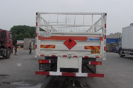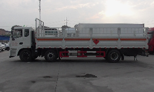 東風錦程三軸9米3國六氣瓶運輸車采用廂式欄板車結構,外厚度為1.1毫米厚度武鋼冷軋鋼板,內加強“幾”字型加強梁,車體底板加強處理并做防靜電處理。車體的左側、右側,和后欄板栓鉤結構,可向下打開,方便上下貨物,車體為空曠式車型,大大減少了運輸物品因為狹窄空和強烈碰撞產生氣瓶爆炸的危險性,箱體外觀涂裝白色油漆,在欄板的中間位置粘貼橙色的危化車標帶,并在車體的左、右、后部粘貼“易燃氣體”或“不燃氣體”標識。