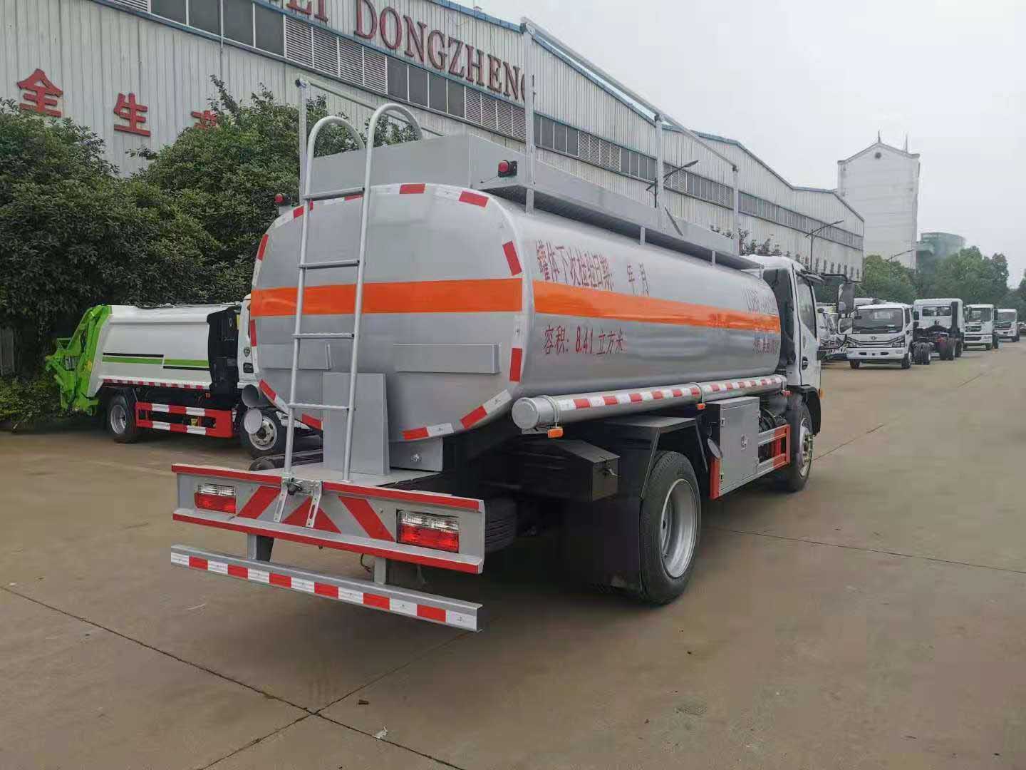 東風福瑞卡國六8噸油罐車罐體配置:筒體4.5mm厚,封頭4.5mm厚,隔板4mm厚,單倉,罐頂壹個歐標罐口, 1個鋁合金海底閥(帶自動關閉裝置),帶70/40專用油泵(可泵進泵出),正星大流量加油機和15米加粗卷盤及槍,全套歐標,后爬梯、手動護欄、工具箱、后保險杠、側防護欄,按2021年新標準制作。