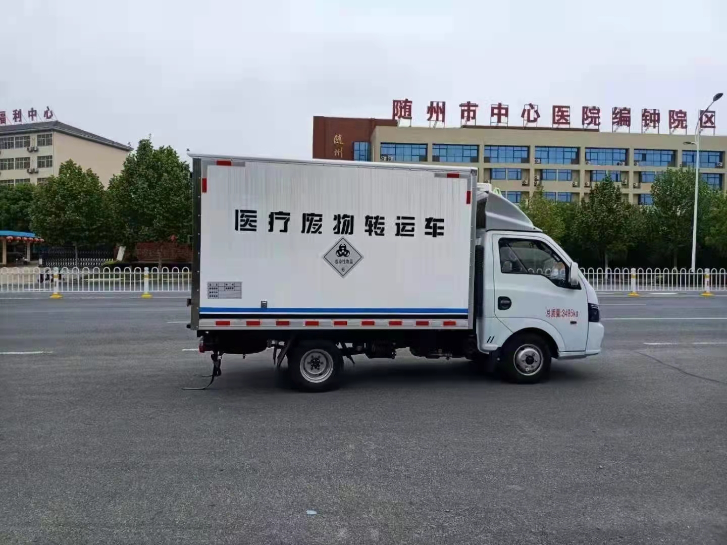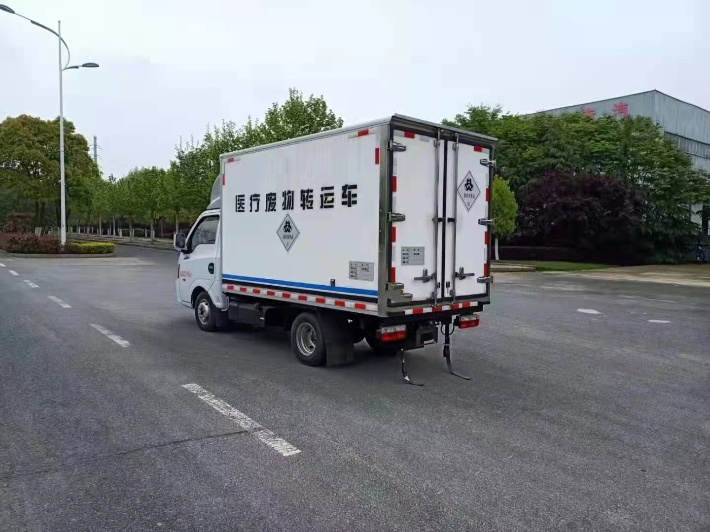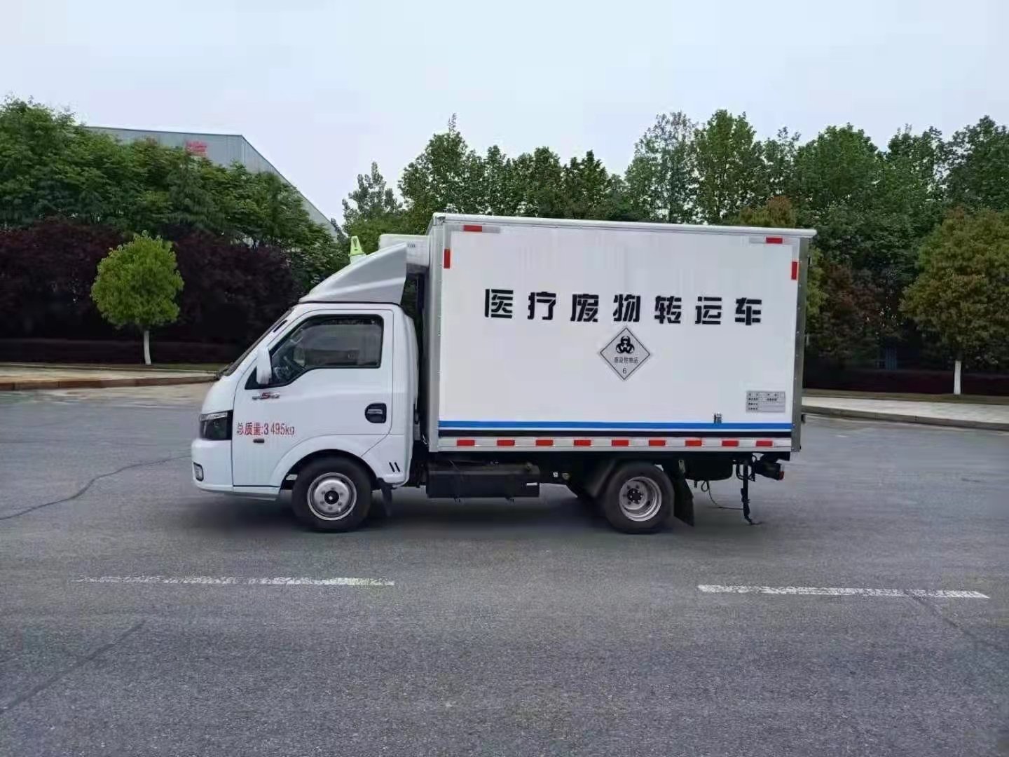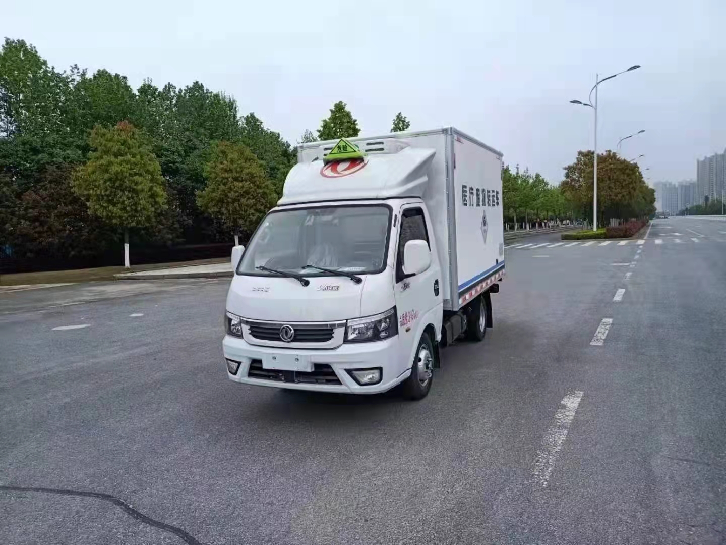 國六汽油東風途逸醫療廢物轉運車底盤型號EQ1035SJ16QCWXP,軸距:2600mm,1650mm單排駕駛室,柳機LJ4A15Q6(113馬力)發動機,5檔變速箱,175R14真空輪胎【后雙輪】,前橋1.5噸,后橋2.5噸。油剎,標配動力轉向,前盤制動,中控門鎖,電動門窗,定速巡航,藍牙電話,LED日間行車燈,電源總開關,排氣制動,ABS,空調。排氣管前置,ECU限速,新規:車道偏移/防碰撞預警。整車尺寸:5200X1800X2710;廂體尺寸:3000X1700X1750,保溫廂體改裝要求:外飾玻璃鋼,內飾不銹鋼,中間為聚氨酯整體發泡,車廂與大梁之間采用橡膠皮廂體下方圓弧處理,后門為雙層密閉結構,并采用迷宮式封條,使車廂完全封閉。加裝自動消毒噴霧器。廂體兩側帶固定貨物卡槽。車廂體內裝配紫外線消毒殺菌設備。醫療廢物轉運車采用帶有“醫療廢物”標識。國產-5度漢雪機組,不帶側門。