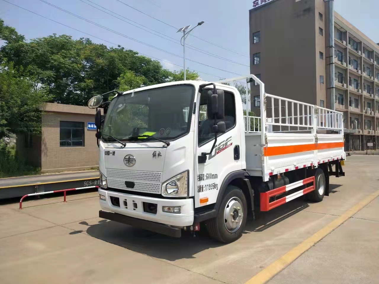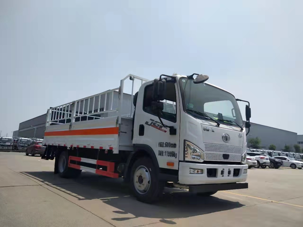 解放J6F氣瓶運輸車屬于黃牌車型,整車型號 :HTW5124TQPCA6,底盤型號 : CA1120P40K59L4BE6A84,整車尺寸 : 6680,6995,7100×2320,2370,2420,2470×2490,2600mm,廂體尺寸: 4780,5100,5200×2200,2300×550,600mm。3900軸距。額載可達7.6噸,在同款車型中額載較大的車型。采用的是長春解放J6F單排駕駛室(2010mm寬),濰柴160馬力柴油發動機(WP3NQ160E61),一汽六檔加強型325H后橋(速比5.125、輪距1658),245/70R19.5 16PR,216*75*6車架,其他:多功能方向盤,150L鋁合金油箱,液晶儀表,定速巡航,帶國產ABS,空調,電動門窗+中控鎖,后處理器前置+排氣火花熄滅器+前盤后鼓制動器+限速79KM/H,北斗+GPRS行車記錄儀,防飛濺擋泥板,防碰撞預警,防車道偏離預警。