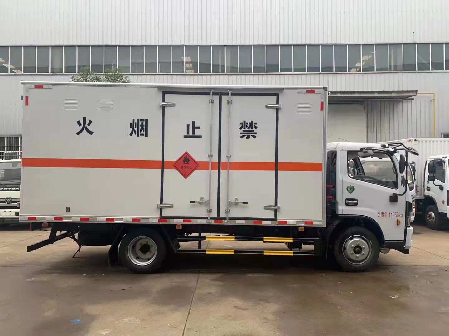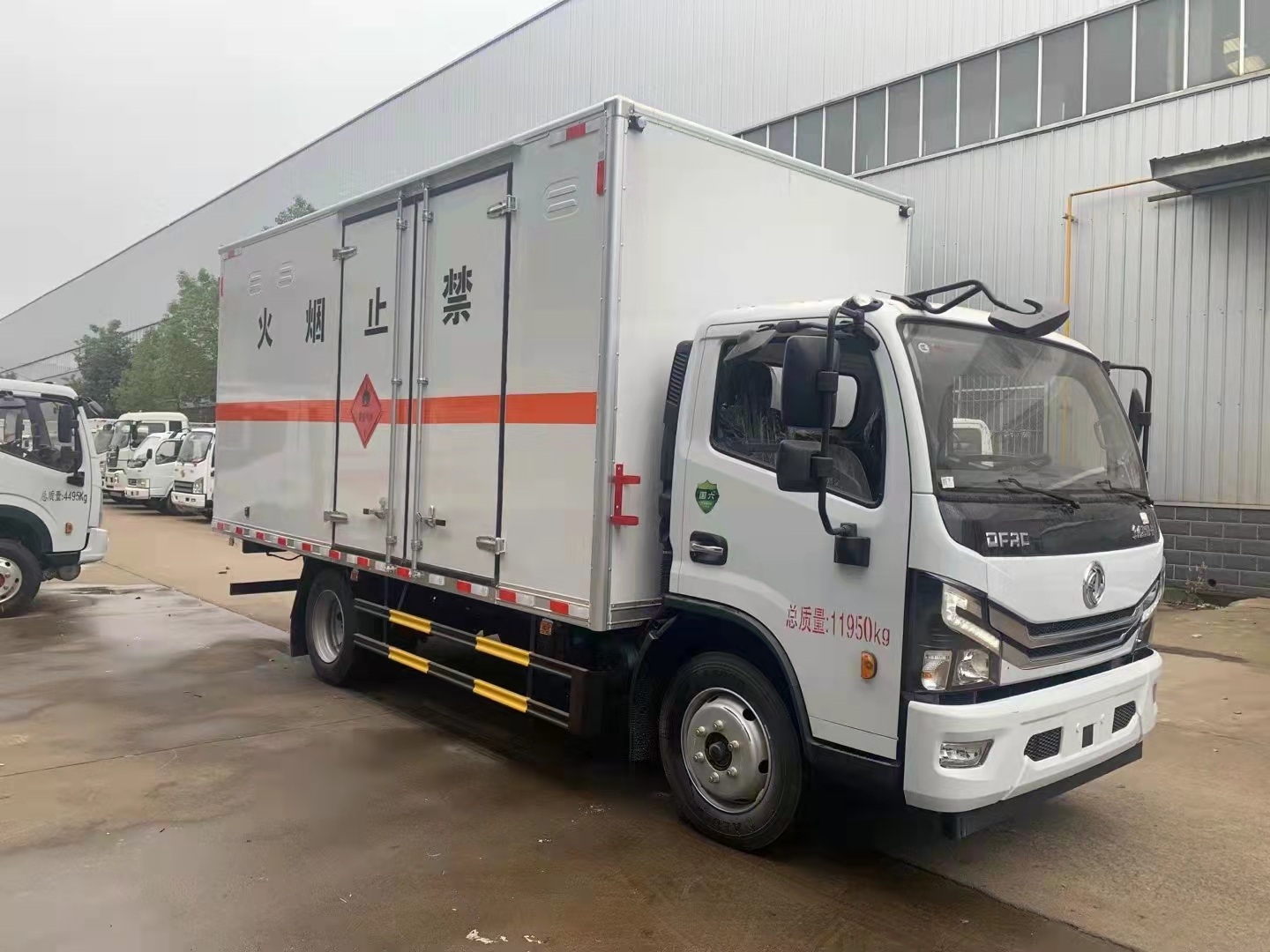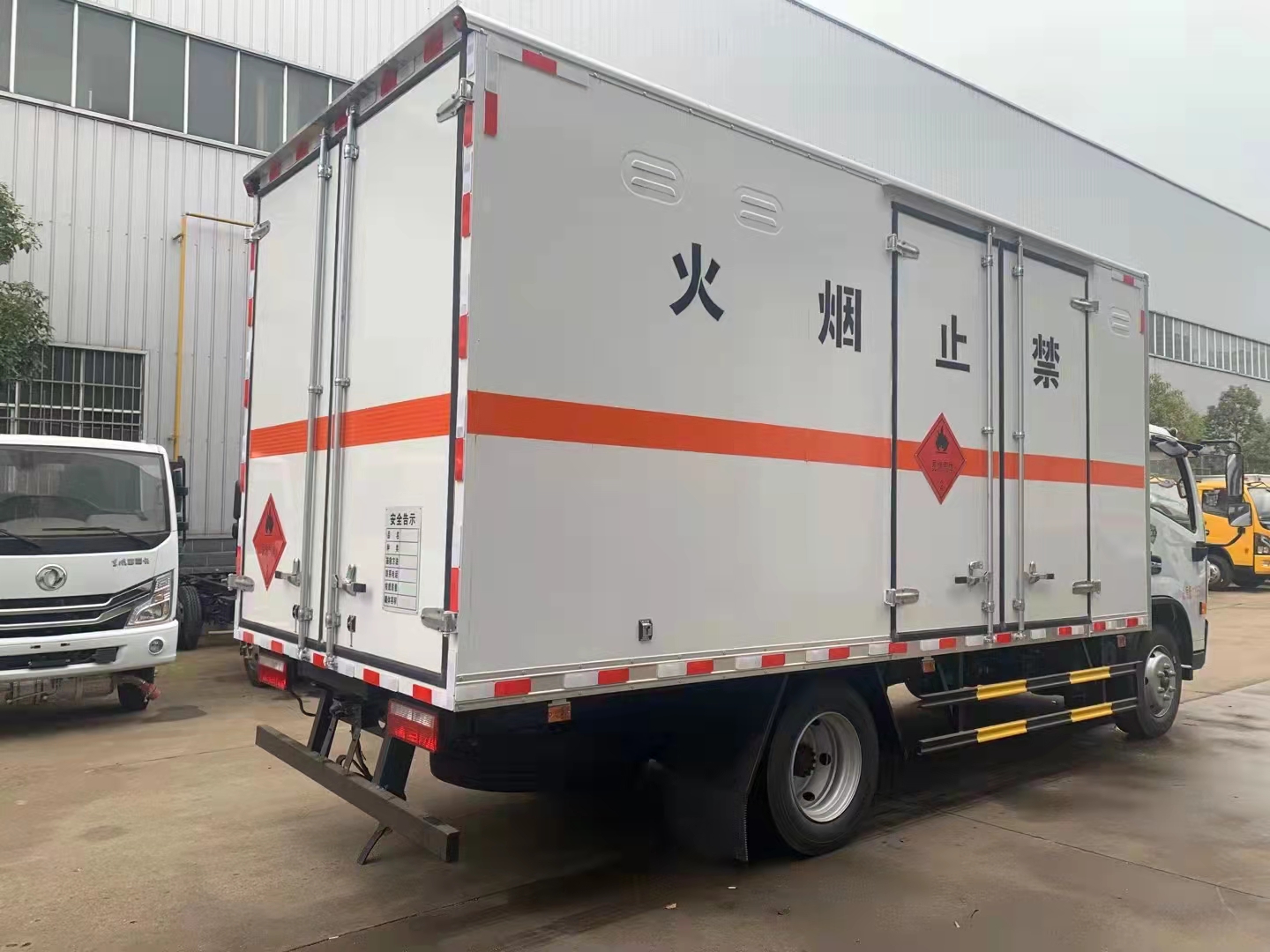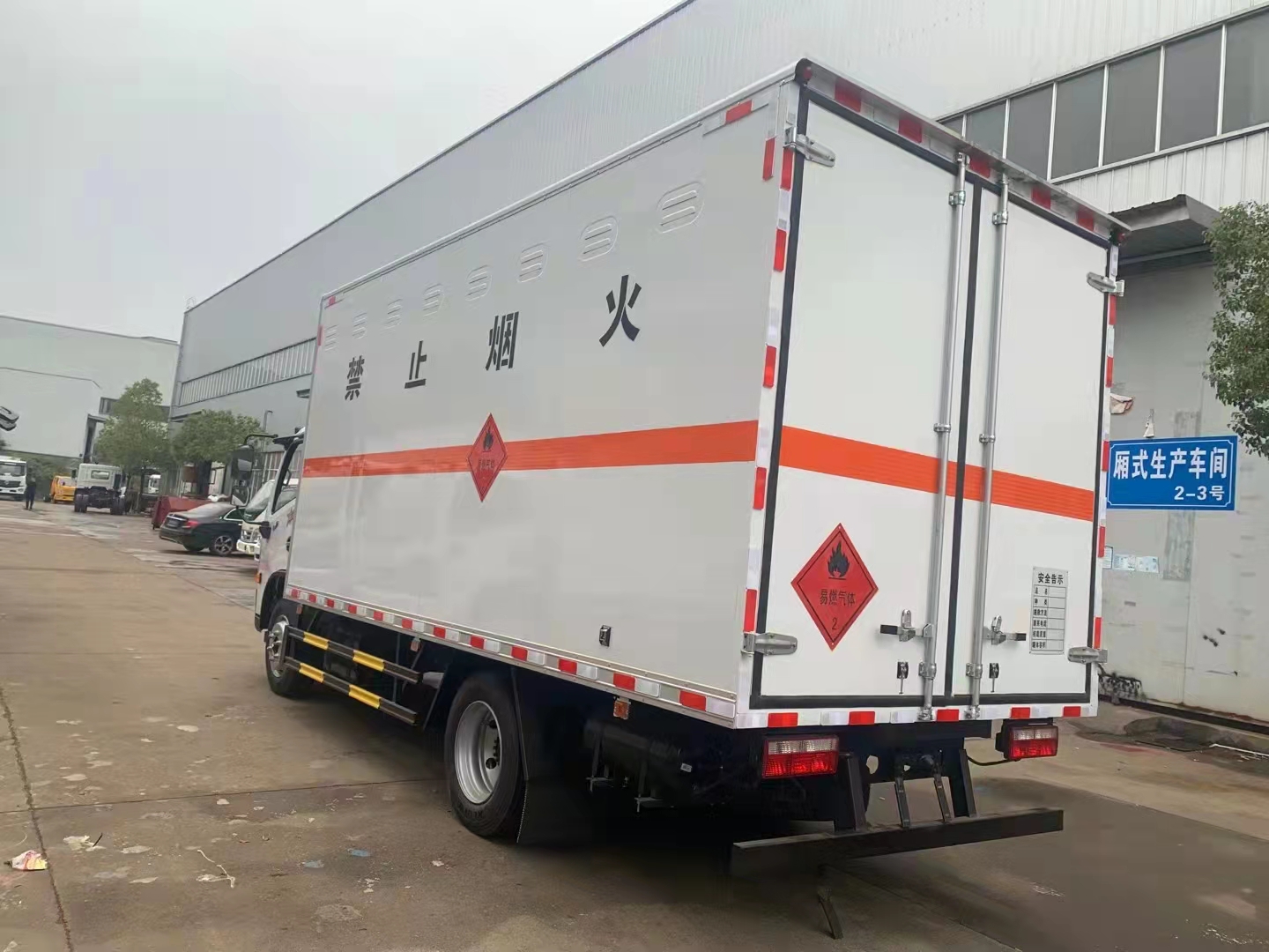 東風大多利卡D7國六易燃氣體廂式運輸車外板采用優質冷軋鋼板帶百葉窗,內飾為導電性能良好的鋁平板有透氣孔,矩形骨架結構內部填充防潮阻燃擠朔板,復合加鉚合工藝。廂體四周鋁合金包邊及包角,車廂底板鋪設防靜電膠皮,廂體前臉50公分高鋪設防靜電膠皮。后部設置對開門,可選裝側門位置,廂體內部兩側安裝捆綁貨物的臥環。廂體內部安裝煙霧報警器及防盜報警感應器。車廂一周粘貼橙色放光帶,箱體粘貼 菱形告示牌,安全告示牌(不銹鋼材質),危險品牌,箱體安裝示廓燈(前白后紅),拖地靜電帶。江鈴帶前開側門藍牌國六民爆車廂體后門及側門采用一次成型密封膠條,底板及所有門合頁處均做防銹處理,箱體采用雙組份丙稀酸油漆制作,所有門桿及合面均為熱鍍鋅材質。