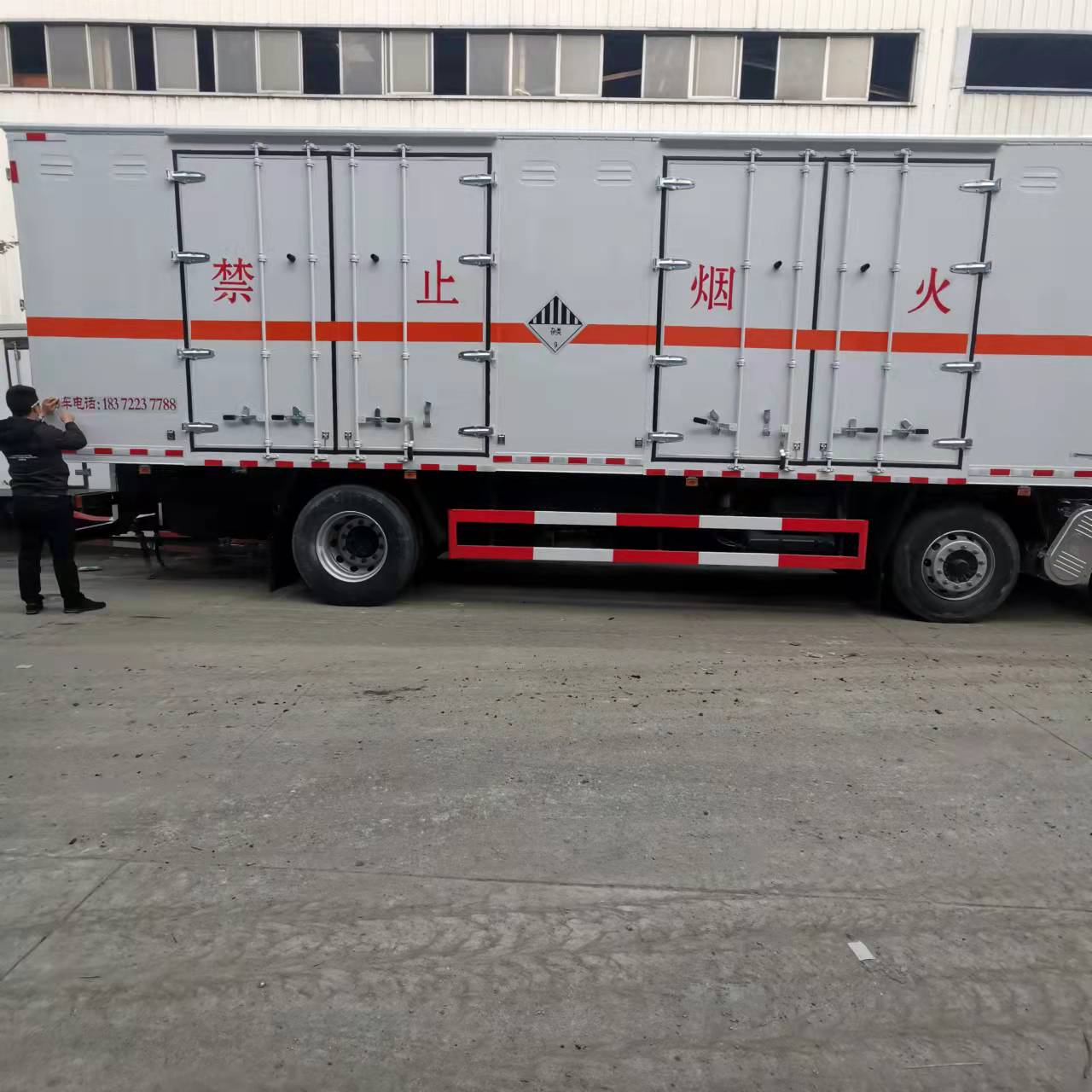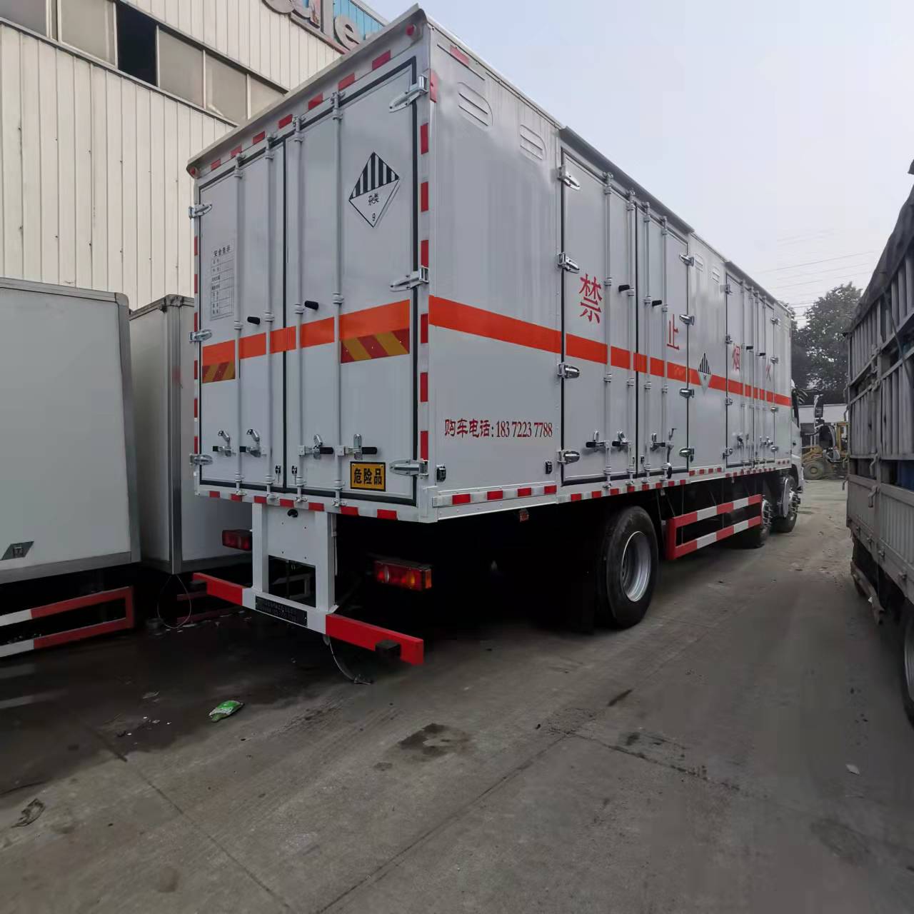 東風天錦三軸帶雙開雙側門國六危險品車選擇的是外板采用1mm厚冷軋板有一次性成型的百葉窗,內飾為導電性能良好的鋁板有透氣孔,內襯為矩形管骨架牢靠穩定,內部填充為透氣防潮阻燃的擠塑板,四種材料經現代工藝復合而成,廂體外部上下鋁合金型材包邊,底板和車廂前下部鋪橡膠皮,后門雙開,右側中部兩個雙開門,內部有固定貨物的臥環,車輛外部有靜電帶、滅火器、防火罩,車廂內安裝煙霧報警器和門防盜報警器,嚴格按照國家危險品相關法規張貼。