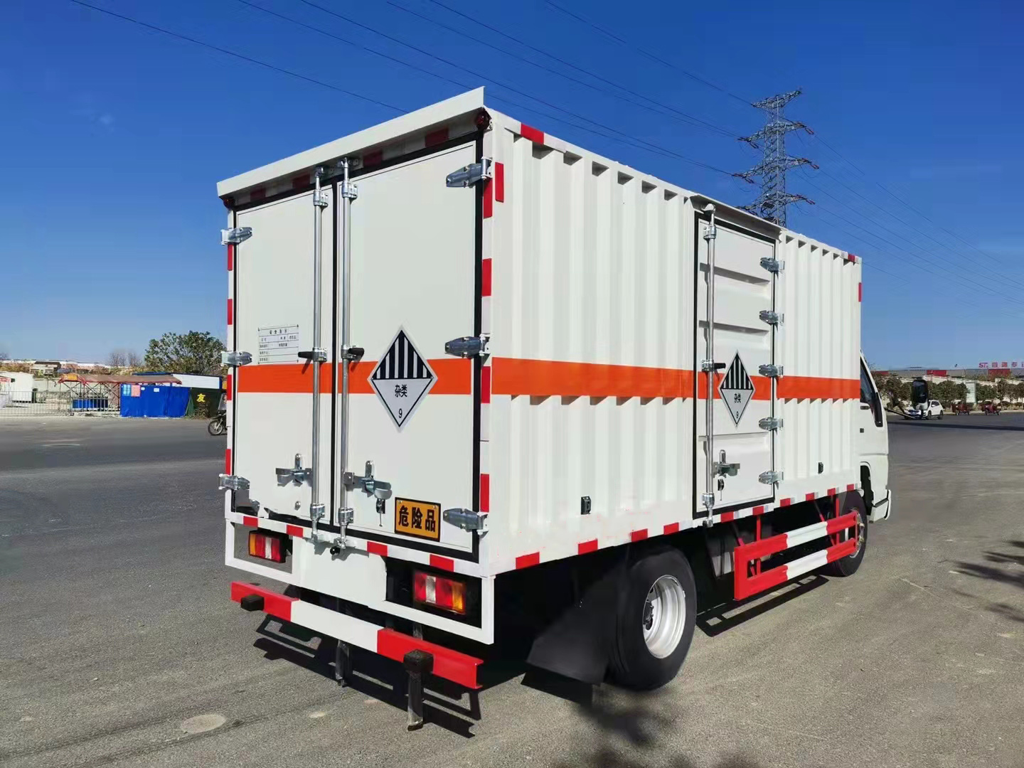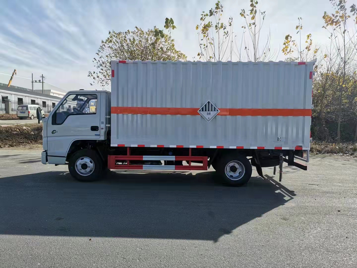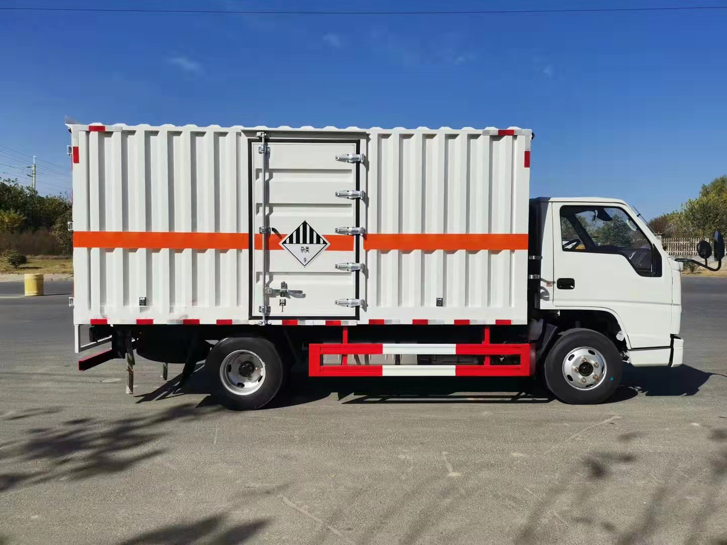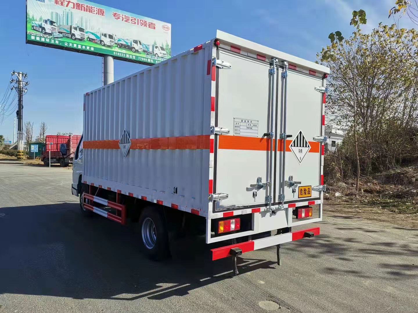 江鈴國六瓦楞板雜項危險品車采用江鈴國六危險品車底盤,單排駕駛室,原廠;妆P,國六發動機,江鈴115馬力,防爆輪胎,空調,ABS,限速80,前盤制動,排氣管前置,斷氣剎,方向助力. (全新規底盤)。外板采用冷軋板一次折彎成型,內飾為導電性能良好的合金板有透氣孔,復合加鉚合工藝,內襯為矩形管骨架牢靠穩定,骨架內部填充為透氣防潮阻燃的擠塑板。廂體外部四周鋁合金型材包邊,底板和車廂前下部鋪橡膠皮,后門雙開,右側單開側門,內部裝固定貨物的臥環,安裝煙霧報警器、防盜感應器。車身附件靜電接地帶、滅火器、防火罩、危險品三角燈、橙色反光帶、CCC反射器、菱形標志牌、危險品牌、安全告示齊全。