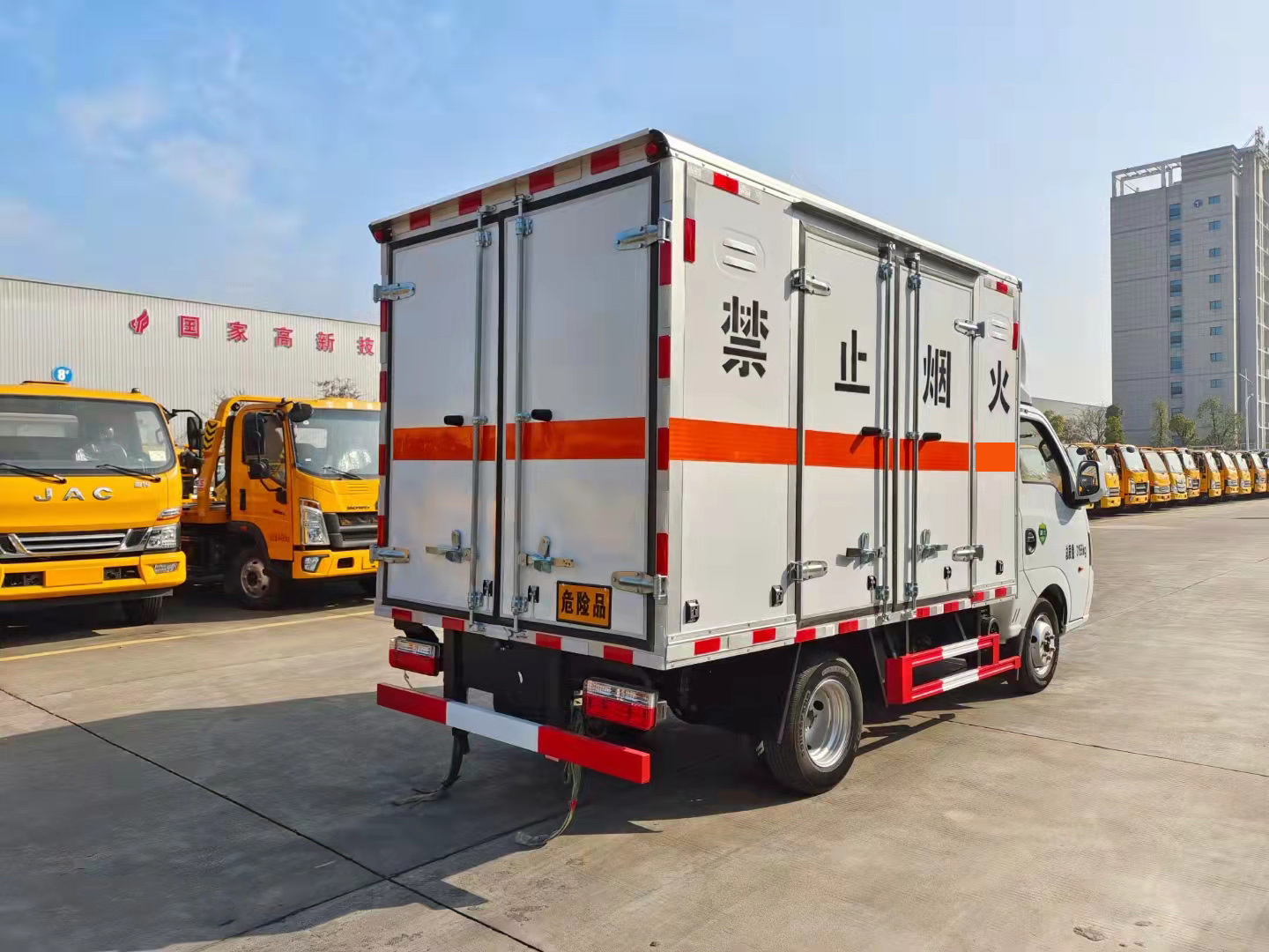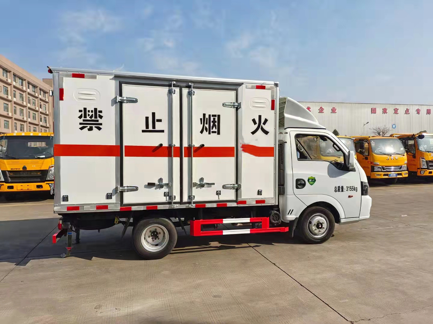 東風途逸國六汽油帶雙開側門危險品車外板采用1mm厚冷軋板有一次成型的百葉窗,內飾為導電性能良好的鋁板含透氣孔,內襯為矩形管骨架牢靠穩定,內部填充為透氣防潮阻燃的擠塑板,底板和車廂前下部鋪橡膠皮,廂體外部上下鋁合金型材包邊,后門雙開,右側帶單開雙開門,內部有固定貨物的臥環,外部有靜電帶,滅火器,防火罩,廂內安裝煙霧警報器。