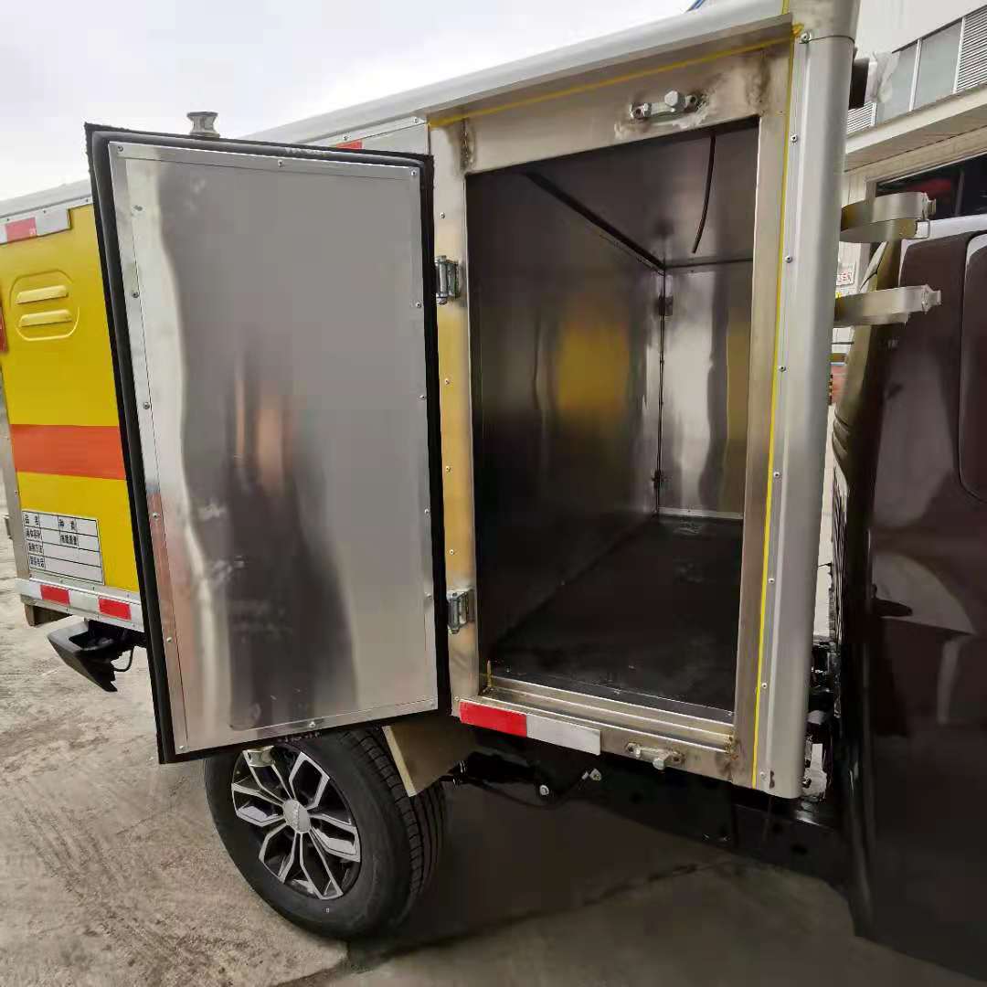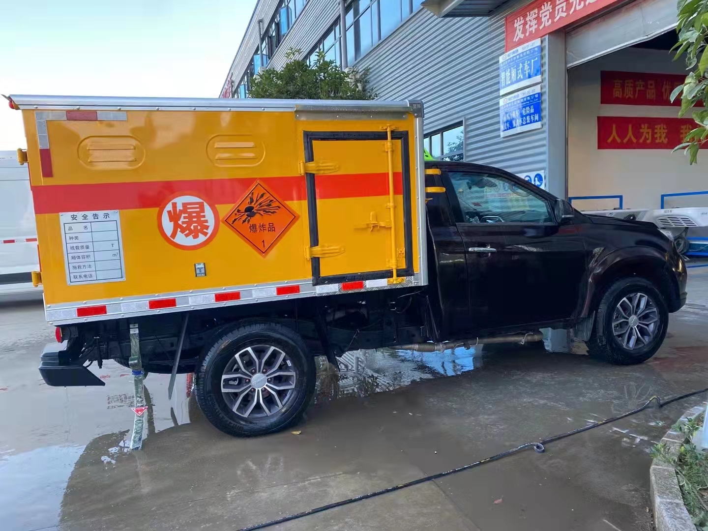 江鈴域虎國六皮卡民爆車嚴格按照公告尺寸制作,外板采用 1mm 厚冷軋板有一次性成型的百葉 窗,內(nèi)飾為導(dǎo)電性能良好的鋁板有透氣孔,內(nèi)襯為矩形管骨架牢靠穩(wěn)定,內(nèi)部 填充為透氣防潮阻燃的擠塑板,四周種材料經(jīng)現(xiàn)代工藝復(fù)合而成,廂體外部上 下鋁合金型材包邊,底板和車廂前下部鋪橡膠皮,后門雙開,右側(cè)中部單開門, 內(nèi)部有固定貨物的臥環(huán),車輛外部有靜電帶、滅火器、防火罩,車廂內(nèi)安裝煙 霧報警器和門防盜報警器,嚴格按照國家危險品相關(guān)法規(guī)張貼
